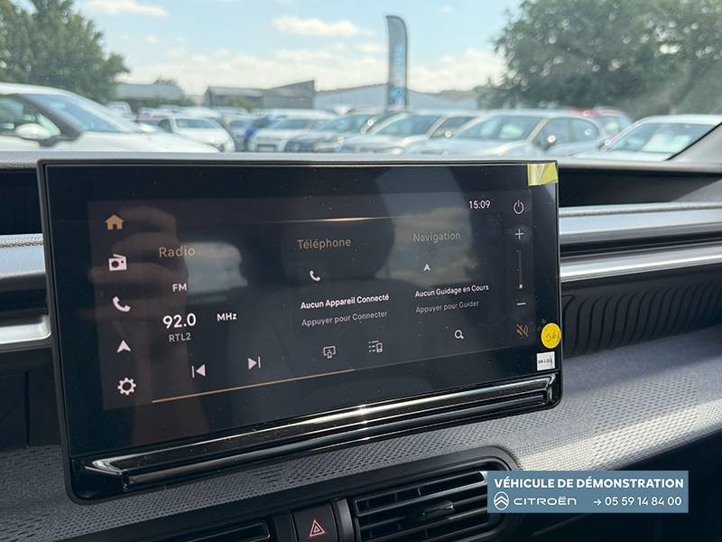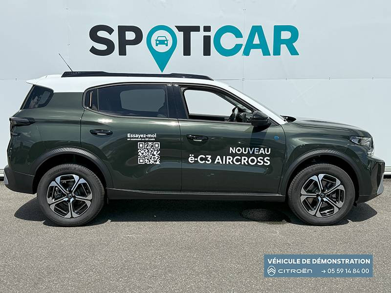 1 Prise USB type-C (charge rapide 3A) sur la console centrale / 1 Prise USB type-C (charge standard et data) sur la planche de bord / 2 Prises USB type-C (charge rapide 3A) en rang 2 / ABS, ESP, TCS / Aérateurs latéraux en noir brillant et 2 aérateurs en zone centrale sur planche de bord / AFU, REF / Anneau de remorquage AV et AR / Application e-ROUTES (Planificateur de voyage intelligent) via Pack Connect Plus Gratuit pendant une période d'essai de 12 mois / Avertisseur sonore monoton / Avertisseur Sonore Piéton / Banquette AR avec dossier fractionnable 2/3 et 1/3 / Barres de toit Noir Brillant / Boîte automatique 1 vitesse / Boîtier télématique: Appel d'urgence et Citroën Assistance les services Connect ONE pendant une période de 10 ans / Câble de charge Mode 3 (Wall Box) pour prise de charge T2, longueur 6 mètres / Centre de roue noir avec logo / Chargeur embarqué 7.4 kW monophasé / Citroën Head up Display (affichage tête haute) - LCD / Console centrale haute avec accoudoir et rangement fermé / Décors extérieurs Noir Brillant / Décors sur les panneaux de portes AV/AR et sur la planche de bord Sidérite / Détection de sous-gonflage / Eclairage d'accompagnement et d'accueil / Eclairage d'ambiance monochromatique / Ecran central 10,25 " tactile: Apple CarPlay et Android Auto sans fil Système audio 6 HPs (DAB) / Elargisseurs d'ailes Noir Mat / E-Remote (commande à distance): Contrôle de la charge / Essuie-vitre AV automatique (capteur de pluie) / Frein de stationnement électrique / Garnissage Maille Hello Noire /Toile enduite Gris clair Ambiance Metropolitan Grey avec Sièges Advanced Comfort / Jantes alliage 17" ARAGONITE Diamantées (avec pneus classe A chainables) / Lève-vitres AR électriques (descente séquentielle) / Lève-vitres AV électriques (descente séquentielle) / Navigation 3D sur écran central 10,25" tactile / Ordinateur de bord multifonctions avec indicateur de température exterieure / Pack Safety - Active Safety Brake (Freinage automatique d'urgence) - Alerte active de Franchissement Involontaire de Ligne - Alerte Attention Conducteur - Reconnaissance des panneaux de signalisation - Régulateur-limiteur de vitesse / Plafonnier AV à LED avec lecteurs de cartes / Planche de bord Sofa recouverte de textile / Plancher de coffre escamotable / Poches aumônières au dos des sièges AV / Poignées de maintien au rang 2 / Poignées de portes extérieures Noir Brillant / Prise 12 V à l'AR de console centrale / Recharge rapide en courant continu de 100 kW (borne publique) / Recharge sans fil pour smartphone (puissance 15W) / Rétroviseur intérieur électrochrome / Sabots AV et AR / Services Connect PLUS Comprend les services Connect Plus pour une période de 1 an / Suspension Citroën Advanced Comfort / Témoin de non-bouclage des ceintures de sécurité conducteur et passagers / Volant Gainé avec décor chrome / Volet d'occultation du miroir de courtoise conducteur et passager