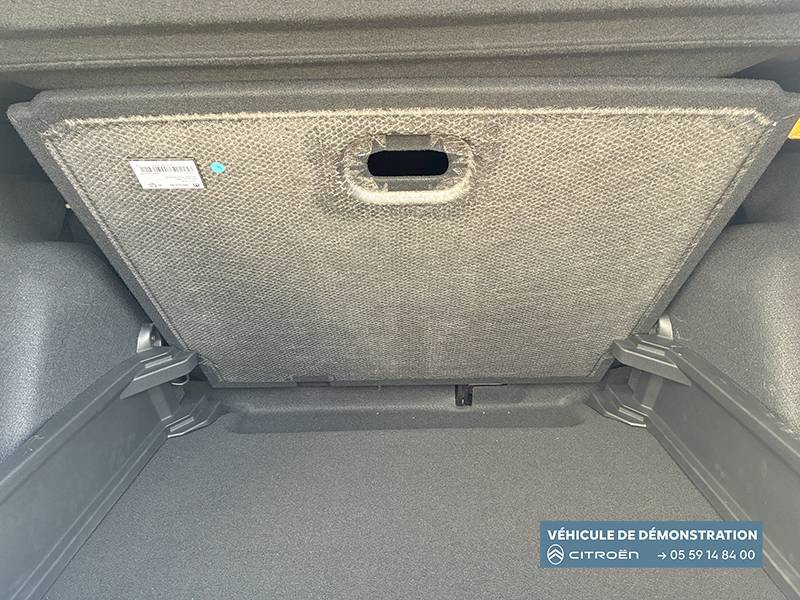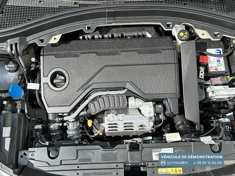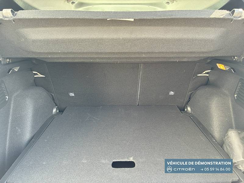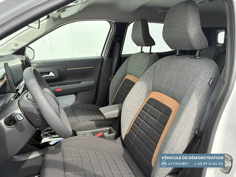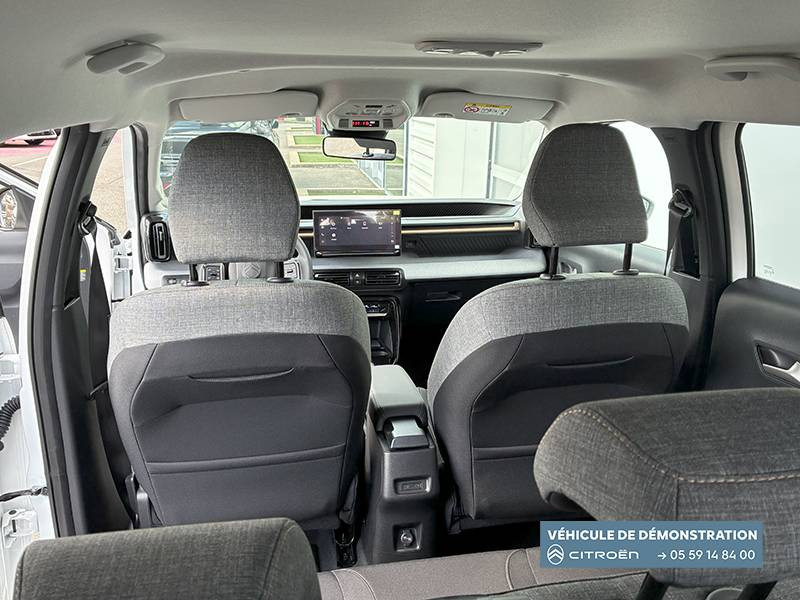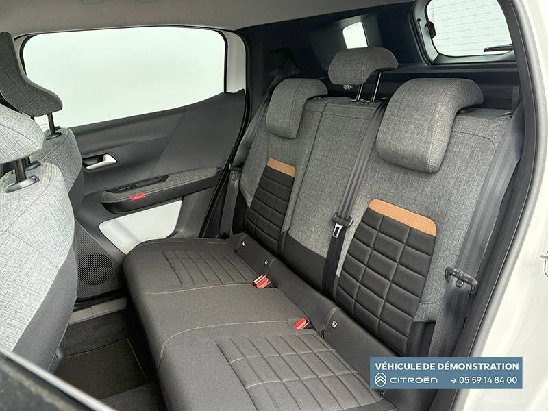 1 Prise USB type-C (charge rapide 3A) sur la console centrale / 1 Prise USB type-C (charge standard et data) sur la planche de bord / 2 Prises USB type-C (charge rapide 3A) en rang 2 / ABS, ESP, TCS / Aérateurs latéraux en noir brillant et 2 aérateurs en zone centrale sur planche de bord / AFU, REF / Anneau de remorquage AV et AR / Avertisseur sonore monoton / Banquette AR avec dossier fractionnable 2/3 et 1/3 / Barres de toit Noir Brillant / Boîte automatique 6 rapports / Boîtier télématique: Appel d'urgence et Citroën Assistance les services Connect ONE pendant une période de 10 ans / Citroën Head up Display (affichage tête haute) - LCD / Console centrale haute avec accoudoir et rangement fermé / Décors extérieurs Noir Brillant / Décors sur les panneaux de portes AV/AR et sur la planche de bord Bronze / Détection de sous-gonflage / Eclairage d'accompagnement et d'accueil / Eclairage d'ambiance monochromatique / Ecran central 10,25 " tactile: Apple CarPlay et Android Auto sans fil Système audio 6 HPs (DAB) / Elargisseurs d'ailes Noir Mat / Enjoliveurs 17" SYLVANITE (avec pneus classe A chainables) / Essuie-vitre AV automatique (capteur de pluie) / Frein de stationnement électrique / Garnissage Tissu Noir /Tissu Quadric Ambiance Urban Bronze avec Sièges Advanced Comfort / Lève-vitres AR électriques (descente séquentielle) / Lève-vitres AV électriques (descente séquentielle) / Ordinateur de bord multifonctions avec indicateur de température exterieure / Pack Safety - Active Safety Brake (Freinage automatique d'urgence) - Alerte active de Franchissement Involontaire de Ligne - Alerte Attention Conducteur - Reconnaissance des panneaux de signalisation - Régulateur-limiteur de vitesse / Plafonnier AV à LED avec lecteurs de cartes / Plancher de coffre escamotable / Poches aumônières au dos des sièges AV / Poignées de maintien au rang 2 / Poignées de portes extérieures Noir Brillant / Prise 12 V à l'AR de console centrale / Sabots AV et AR / Suspension Citroën Advanced Comfort / Témoin de non-bouclage des ceintures de sécurité conducteur et passagers / Volant Gainé avec décor chrome / Volet d'occultation du miroir de courtoise conducteur et passager