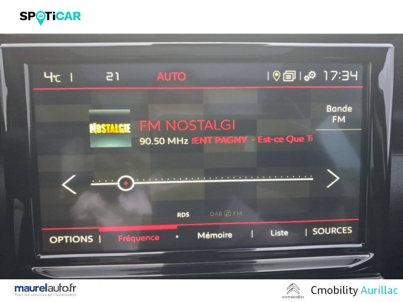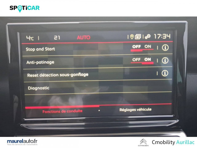 ABS avec REF, AFU et ESP / Accès et démarrage mains libres / Accoudoir central réglable sur siège conducteur / Active Safety Brake / Alerte Risque Collision / Allumage automatique des feux de détresse en cas de forte décélération / Bandeau de planche de bord gainé Brasilia Grey chiné / Barres de toit Noir Brillant / Citroën Connect Box avec Pack SOS et assistance inclus / Citroën Connect Nav sur tablette tactile 9'': comprend le système de navigation TomTom, la reconnaissance vocale et durant 3 ans les services Connect Nav (inclut les services « Zones de danger », « Info Trafic », « Stations-service », « Parkings », « Météo » et « Recherche locale »). / Clignotants impulsionnels / Console centrale noir brillant et rangement fermé / Décors extérieurs Noir Brillant / Détection de sous-gonflage / Eclairage à LED en bas de façade centrale / Elargisseurs d'ailes et bas de caisse Noir Mat / Enjoliveurs de projecteurs Noir Brillant / Fixations ISOFIX avec troisième point d'ancrage et marquage sur sièges passager AR / Frein à main avec insert chrome / Garnissage tissu effet cuir Mistral Black/Tissu Brasilia Graphite Chiné- Ambiance Metropolitan Graphite + sièges Advanced Comfort / Insert Noir Brillant dans la plaque de protection avant Gris / Jantes alliage 17" ORIGAMI Diamantées / Kit de dépannage provisoire de pneumatiques / Mirror Screen / Mise en tablette du siège passager AV / My Citroën Play : Citroën Connect Radio sur tablette tactile 7'' / Navigation 3D sur tablette tactile 8" / Pack Auto / Pack City Camera Plus / Pack Color Shiny Black / Pack Safety - Active Safety Brake - Alerte active de Franchissement Involontaire de Ligne - Alerte Attention Conducteur - Alerte Risque Collision - Coffee Break Alert - Reconnaissance des panneaux de vitesse et recommandation - Régulateur-limiteur de vitesse - Témoin de non-bouclage des ceintures de sécurité conducteur et passagers / Pieds de retroviseurs teintés masse / Plafonnier AV à lampes avec lecteurs de cartes / Plancher de coffre escamotable / Poignées de portes extérieures couleur caisse / Prise 12 V à l'AR de console centrale / Prise 12 V en AV de console centrale / Projecteurs antibrouillard LED avec éclairage statique d'intersection / Rehausse de siège conducteur / Rétroviseur intérieur électrochrome / Sabots de protection AV et AR Gris Anthra / Sécurité enfants mécanique / Système audio numérique (DAB) MP3 6 HP / Toit Noir Perla Nera / Vitrages AR surteintés sauf vitres de custode avec animation Chrome / Vitres et lunette AR surteintées - Chrome in glass