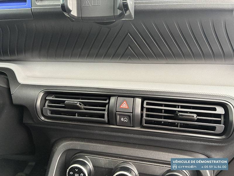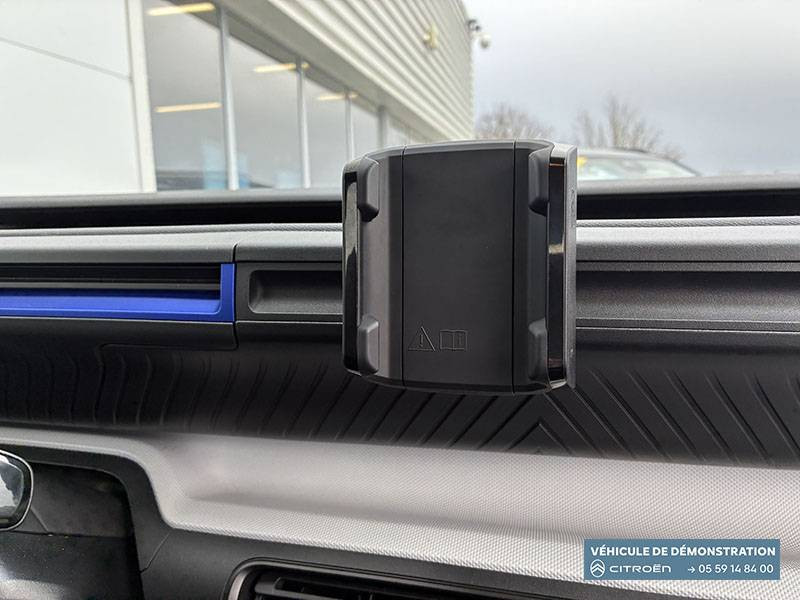 1 prise USB -C sur la planche de bord (charge rapide 3A) / ABS avec REF, AFU et ESP / Boîtier télématique : Appel d'urgence et Citroën Assistance les services Connect ONE pendant une période de 10 ans / Citroën Head up Display (affichage tête haute) - LCD / Coques de rétroviseurs extérieurs Noir Mat / Détection de sous-gonflage / Elargisseurs d'ailes Noir Mat / Enjoliveurs 16" Pyrite / Garnissage Tissu Noir / Tissu Gris Chiné avec les décors sur les panneaux de portes AV/AR et sur la planche de bord Ultra Blue. / Lève-vitres AV électriques (descente séquentielle) / Pack Safety - Active Safety Brake (Freinage automatique d'urgence) - Alerte active de Franchissement Involontaire de Ligne - Alerte Attention Conducteur - Reconnaissance des panneaux de signalisation - Régulateur-limiteur de vitesse - Alerte Risque Collision / Poignées de portes extérieures Noir Mat / Station d'accueil Smartphone Radio via smartphone (avec application My Citroën Play), 2 HP en rang 1, Commande de la radio sur le volant / Suspension Citroën Advanced Comfort / Témoin de non-bouclage des ceintures de sécurité conducteur et passagers