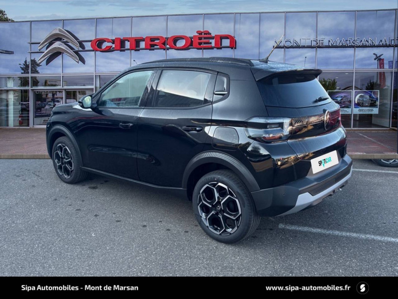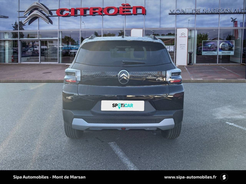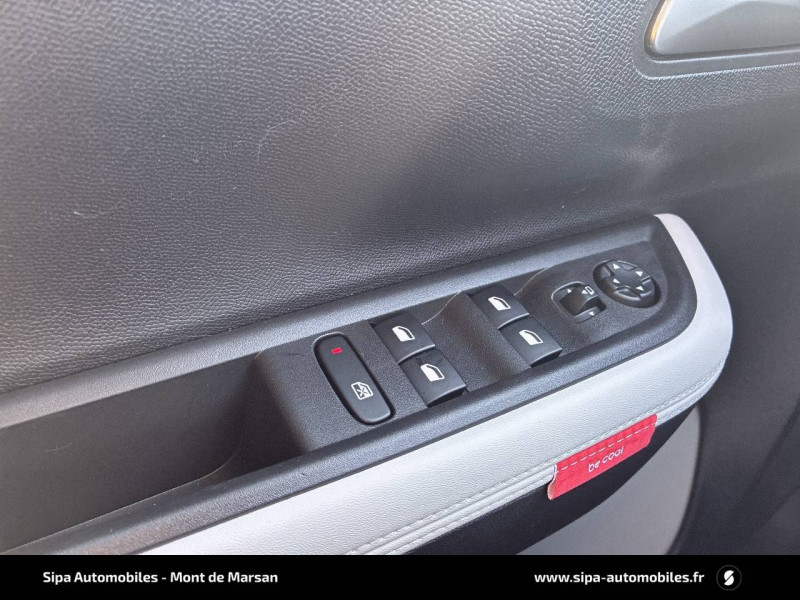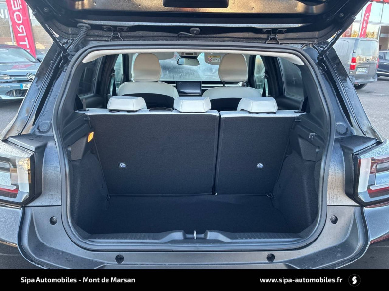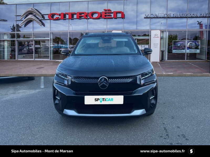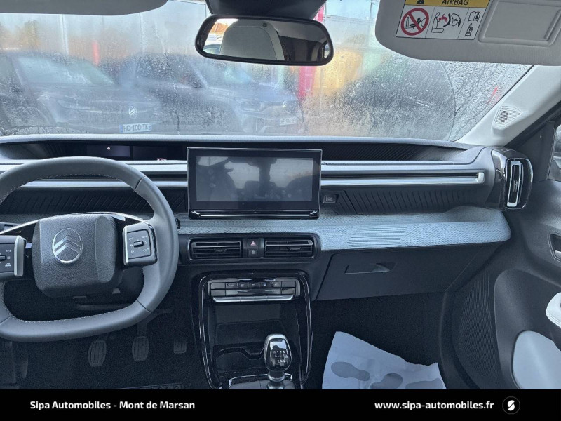 1 prise USB -C sur la planche de bord (charge rapide 3A) / 2 Prises USB type-C (charge rapide 3A) en rang 2 / ABS, ESP, TCS / AFU, REF / Ambiance Metropolitan Grey - Accoudoirs de porte AV et AR recouverts de textile moussé avec étiquette "Happy Tags" (messages positifs), - Appui-têtes AV réglables en hauteur, - Décors sur les panneaux de porte AV Gris Sidérite, - Décors sur la planche de bord Gris Sidérite, - Poches aumônières et poches supplémentaires pour smartphone au dos des sièges AV / Barres de toit Noir Brillant / Boîte manuelle 6 rapports / Boîtier télématique: Appel d'urgence et Citroën Assistance les services Connect ONE pendant une période de 10 ans / Citroën Head up Display (affichage tête haute) - TFT / Commutation automatique des feux de route / Décors extérieurs Noir Brillant (enjoliveurs de montant central et custode) / Détection de sous-gonflage / Ecran central 10,25 " tactile: Apple CarPlay et Android Auto sans fil Système audio 6 HPs (DAB) / Elargisseurs d'ailes Noir Mat / Essuie-vitre AV automatique (capteur de pluie) / Garnissage Tissu Noir / Tissu City / Toile enduite Claire avec Sièges Advanced Comfort / Jantes alliage 17" Atacamite diamantées / Lève-vitres AR électriques (descente séquentielle) / Lève-vitres AV électriques (descente séquentielle) / Navigation 3D sur écran central 10,25" tactile / Pack Safety - Active Safety Brake (Freinage automatique d'urgence) - Alerte active de Franchissement Involontaire de Ligne - Alerte Attention Conducteur - Reconnaissance des panneaux de signalisation - Régulateur-limiteur de vitesse / Poignées de portes extérieures Noir Brillant / Recharge sans fil pour smartphone / Rétroviseur intérieur électrochrome / Sabots de protection AV et AR / Station d'accueil Smartphone Radio via smartphone (avec application My Citroën Play), 2 HP en rang 1, Commande de la radio sur le volant / Suspension Citroën Advanced Comfort / Témoin et alerte de non-bouclage des ceintures AV et de débouclage AV et AR