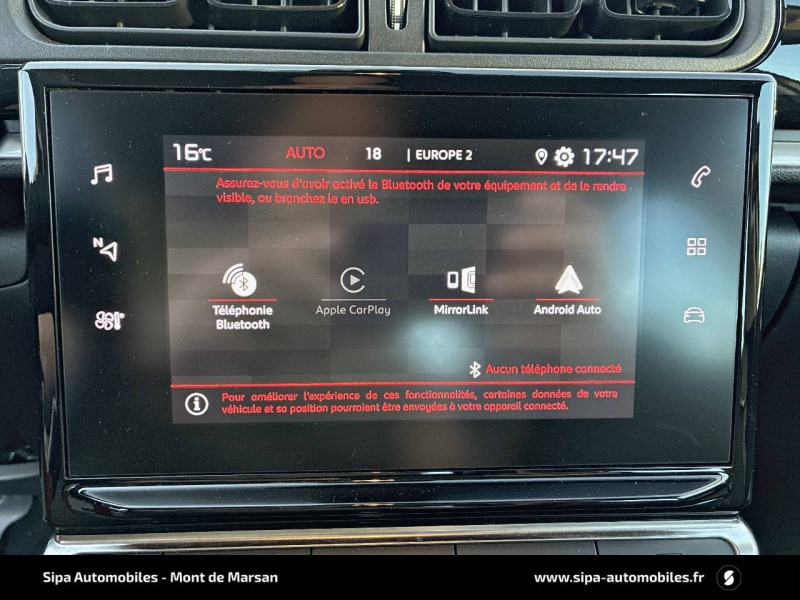 ABS avec REF, AFU et ESP / Airbump Black avec gélule Blanc Banquise / Bandeau de planche de bord Noir Brillant / Détection de sous-gonflage / Elargisseurs d'ailes et bas de caisse Noir Mat / Enjoliveurs 3D 16" STEEL & DESIGN / Garnissage tissu Mica Grey / Kit de dépannage provisoire de pneumatiques / MyCitroën Play Mirror Screen, Système audio numérique MP3 6 HP (DAB), Tablette tactile 7'' / Pack Color Noir / Pack Safety - Active Safety Brake (Freinage automatique d'urgence) - Alerte active de Franchissement Involontaire de Ligne - Alerte Attention Conducteur - Reconnaissance des panneaux de signalisation - Régulateur-limiteur de vitesse / Pack Visibilité / Poignées de portes extérieures couleur caisse