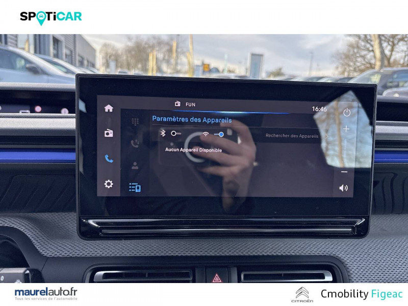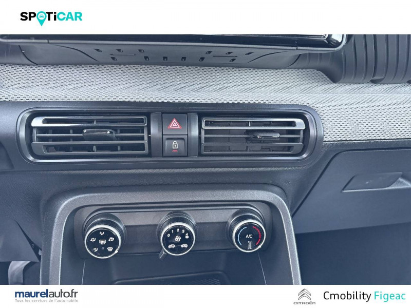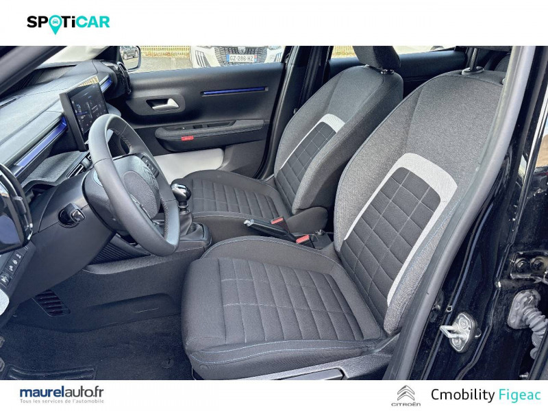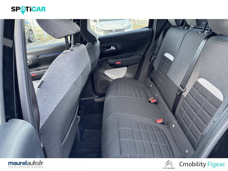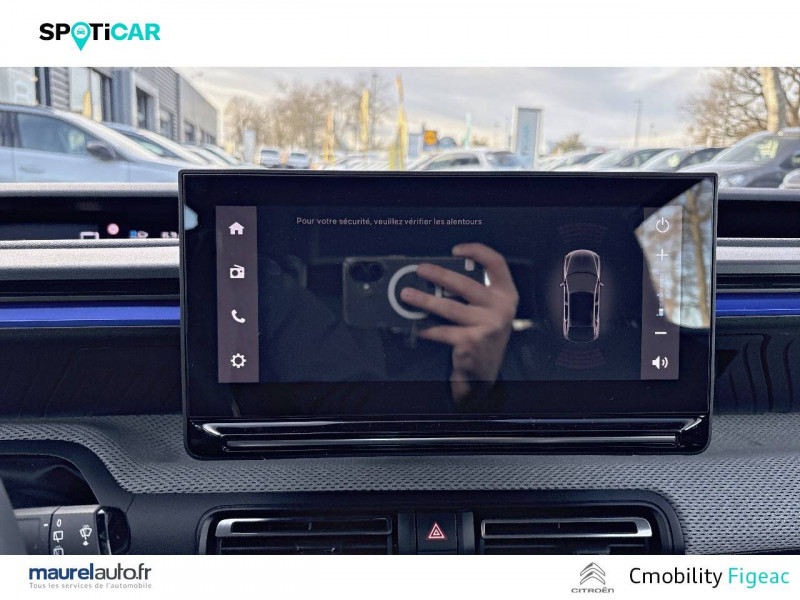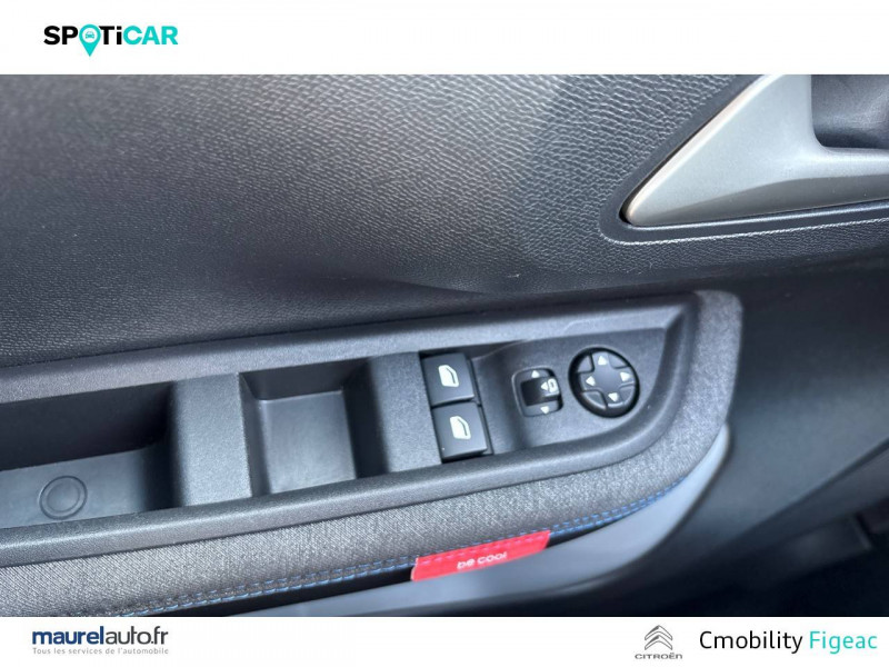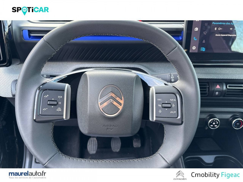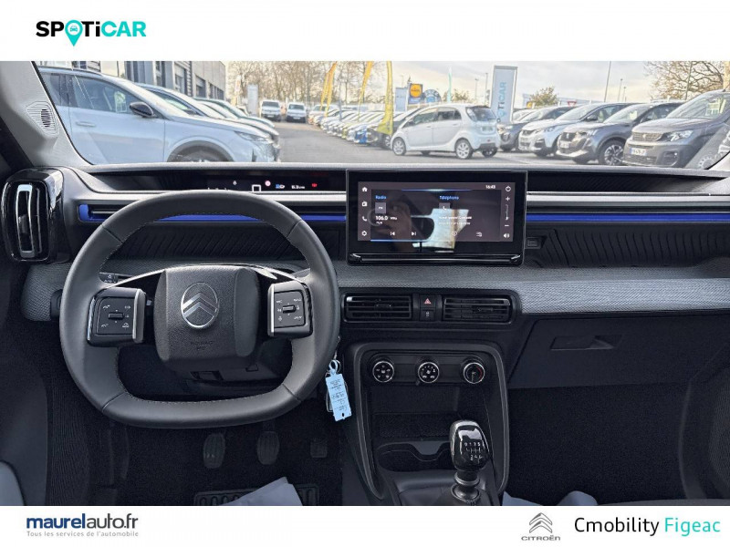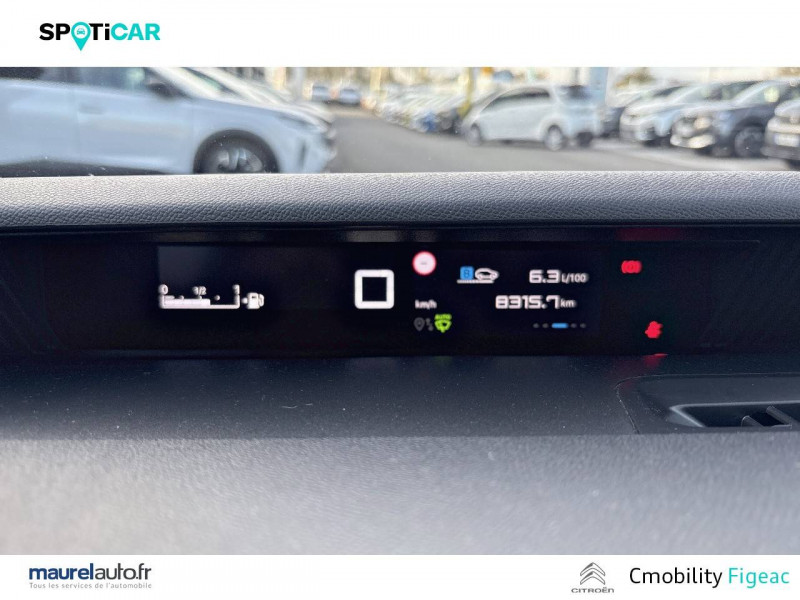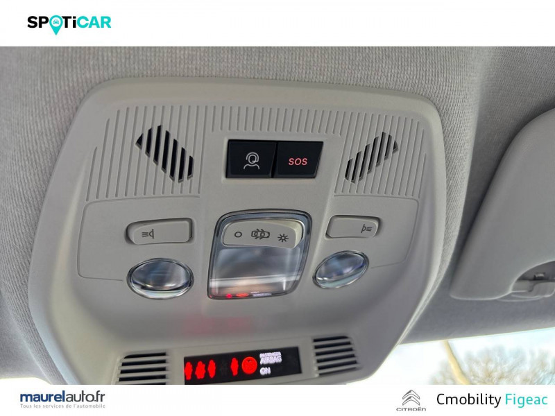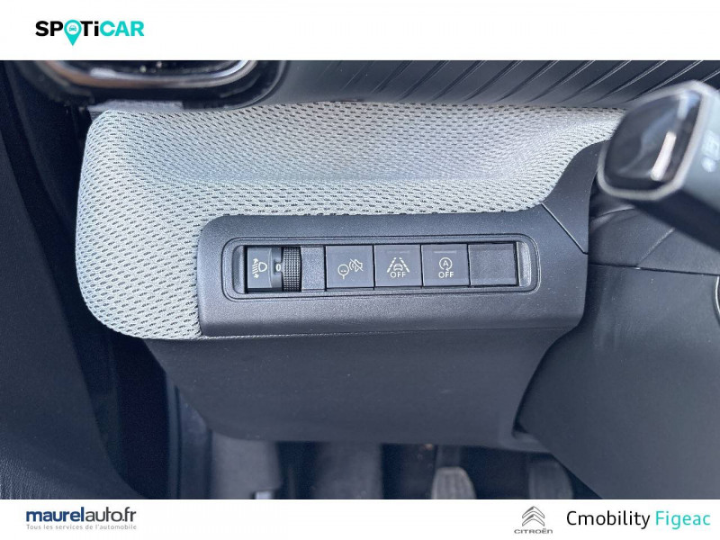 1 prise USB -C sur la planche de bord (charge rapide 3A) / 2 Prises USB type-C (charge rapide 3A) en rang 2 / ABS avec REF, AFU et ESP / Ambiance Urban Grey avec Sièges Advanced Comfort / Barres de toit Noir Brillant / Boîtier télématique: Appel d'urgence et Citroën Assistance les services Connect ONE pendant une période de 10 ans / Citroën Head up Display (affichage tête haute) - TFT / Décors extérieurs Noir Brillant / Détection de sous-gonflage / Ecran central 10,25 " tactile: Apple CarPlay et Android Auto sans fil Système audio 6 HPs (DAB) / Elargisseurs d'ailes Noir Mat / Enjoliveurs 17" AZURITE / Essuie-vitre AV automatique (capteur de pluie) / Garnissage Tissu Noir / Tissu Asphalt avec Sièges Advanced Comfort. Comprend les décors sur les panneaux de portes AV/ AR et sur la planche de bord Ultra Blue, le siège conducteur réglable en hauteur, les appui-têtes AV réglables en hauteur, les accoudoirs de porte AV et AR recouverts de textile moussé avec étiquettes « Happy Tags » (messages positifs), et des poches aumônières au dos des sièges AV / Lève-vitres AV électriques (descente séquentielle) / Pack Safety - Active Safety Brake (Freinage automatique d'urgence) - Alerte active de Franchissement Involontaire de Ligne - Alerte Attention Conducteur - Reconnaissance des panneaux de signalisation - Régulateur-limiteur de vitesse / Poignées de portes extérieures Noir Brillant / Sabots de protection AV et AR / Station d'accueil Smartphone Radio via smartphone (avec application My Citroën Play), 2 HP en rang 1, Commande de la radio sur le volant / Suspension Citroën Advanced Comfort / Témoin de non-bouclage des ceintures de sécurité conducteur et passagers