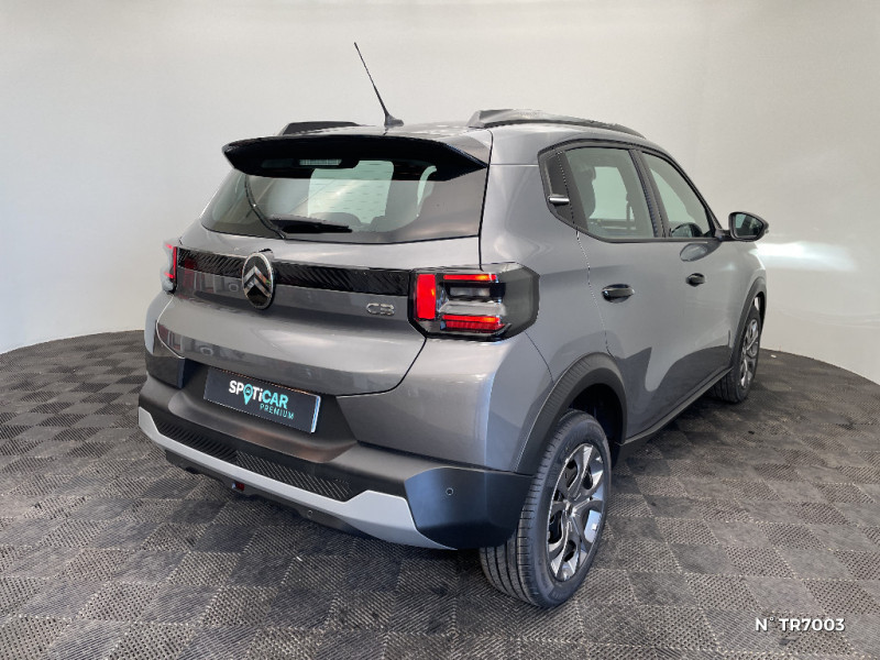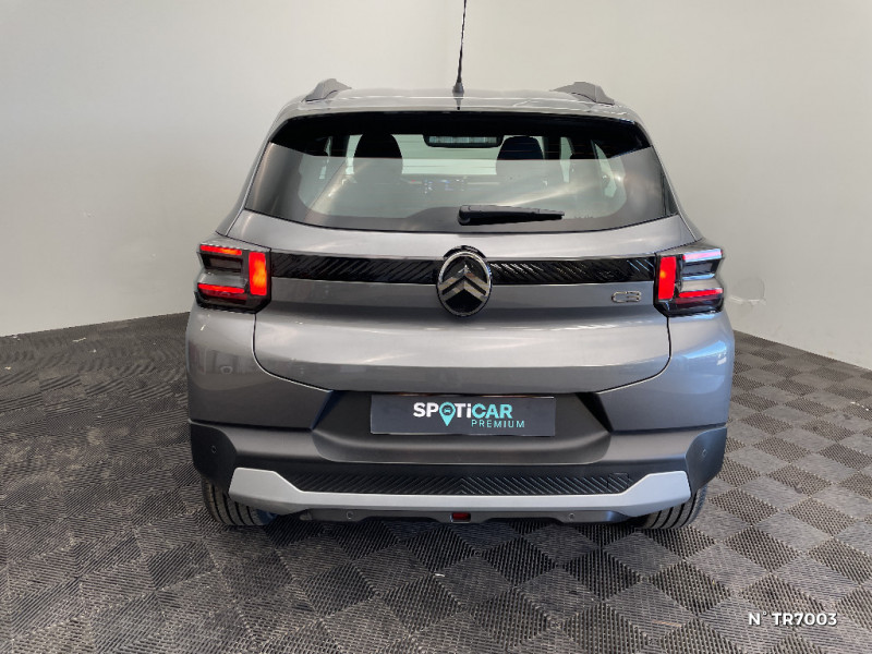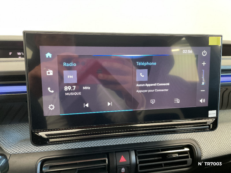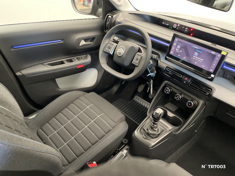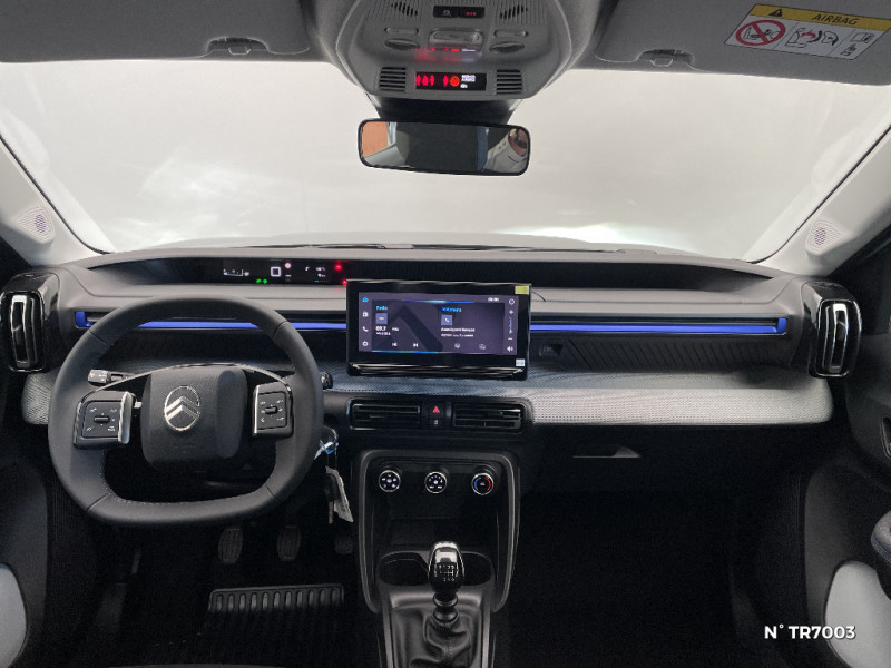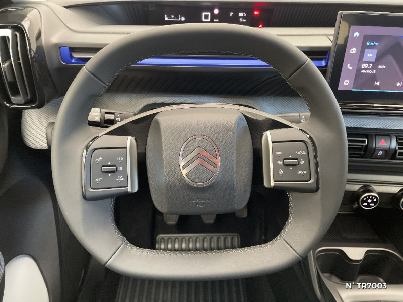 ABS avec REF, AFU et ESP / ABS, ESP, TCS / Ambiance Urban Grey avec Sièges Advanced Comfort / Barres de toit Noir Brillant / Boîte automatique 6 rapports / Citroën Head up Display (affichage tête haute) - TFT / Décors extérieurs Noir Brillant / Détection de sous-gonflage / Ecran central 10,25 " tactile: Apple CarPlay et Android Auto sans fil Système audio 6 HPs (DAB) / Elargisseurs d'ailes Noir Mat / Enjoliveurs 17" AZURITE / Essuie-vitre AV automatique (capteur de pluie) / Garnissage Tissu Noir / Tissu Asphalt avec Sièges Advanced Comfort. Comprend les décors sur les panneaux de portes AV/ AR et sur la planche de bord Ultra Blue, le siège conducteur réglable en hauteur, les appui-têtes AV réglables en hauteur, les accoudoirs de porte AV et AR recouverts de textile moussé avec étiquettes ' Happy Tags » (messages positifs), et des poches aumônières au dos des sièges AV / Lève-vitres AV électriques (descente séquentielle) / Pack Business - Navigation 3D sur écran central 10,25'' tactile - Recharge sans fil pour smartphone / Pack Safety - Active Safety Brake (Freinage automatique d'urgence) - Alerte active de Franchissement Involontaire de Ligne - Alerte Attention Conducteur - Reconnaissance des panneaux de signalisation - Régulateur-limiteur de vitesse / Poignées de portes extérieures Noir Brillant / Sabots de protection AV et AR / Station d'accueil Smartphone Radio via smartphone (avec application My Citroën Play), 2 HP en rang 1, Commande de la radio sur le volant / Suspension Citroën Advanced Comfort / Témoin de non-bouclage des ceintures de sécurité conducteur et passagers / Boîtier télématique: Appel d'urgence et Citroën Assistance les services Connect ONE pendant une période de 10 ans / 1 prise USB -C sur la planche de bord (charge rapide 3A) / 2 Prises USB type-C (charge rapide 3A) en rang 2