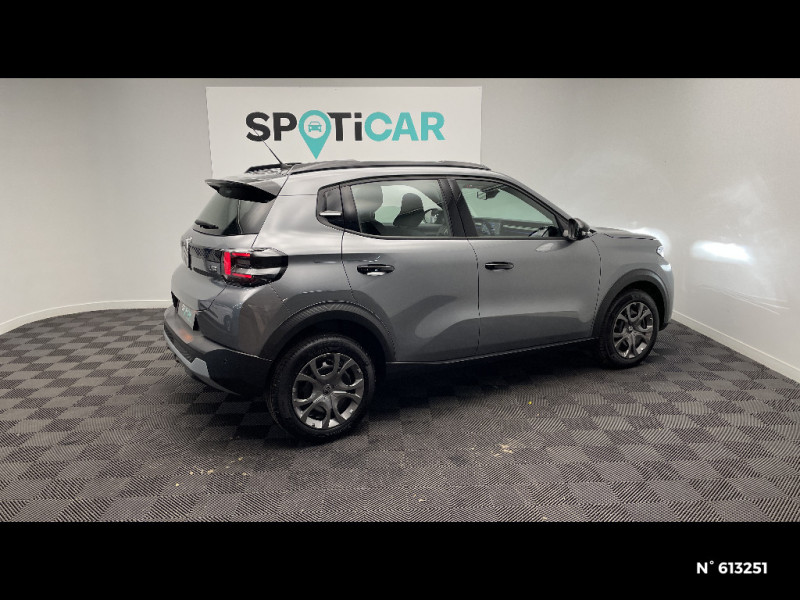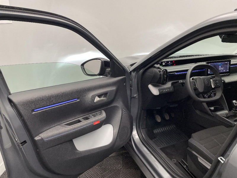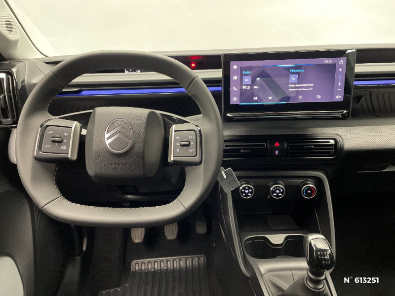 Citroën Head up Display (affichage tête haute) - TFT / Suspension Citroën Advanced Comfort / 1 prise USB -C sur la planche de bord (charge rapide 3A) / Lève-vitres AV électriques (descente séquentielle) / Station d'accueil Smartphone Radio via smartphone (avec application My Citroën Play), 2 HP en rang 1, Commande de la radio sur le volant / Barres de toit Noir Brillant / Décors extérieurs Noir Brillant / 2 Prises USB type-C (charge rapide 3A) en rang 2 / Ecran central 10,25 " tactile: Apple CarPlay et Android Auto sans fil Système audio 6 HPs (DAB) / Essuie-vitre AV automatique (capteur de pluie) / ABS avec REF, AFU et ESP / Détection de sous-gonflage / Garnissage Tissu Noir / Tissu Asphalt avec Sièges Advanced Comfort. Comprend les décors sur les panneaux de portes AV/ AR et sur la planche de bord Ultra Blue, le siège conducteur réglable en hauteur, les appui-têtes AV réglables en hauteur, les accoudoirs de porte AV et AR recouverts de textile moussé avec étiquettes ' Happy Tags » (messages positifs), et des poches aumônières au dos des sièges AV / Ambiance Urban Grey avec Sièges Advanced Comfort / Enjoliveurs 17" AZURITE / Pack Safety - Active Safety Brake (Freinage automatique d'urgence) - Alerte active de Franchissement Involontaire de Ligne - Alerte Attention Conducteur - Reconnaissance des panneaux de signalisation - Régulateur-limiteur de vitesse / Témoin de non-bouclage des ceintures de sécurité conducteur et passagers / Elargisseurs d'ailes Noir Mat / ABS, ESP, TCS / Boîte automatique 6 rapports / Boîte manuelle 6 rapports / Poignées de portes extérieures Noir Brillant / AFU, REF / Boîtier télématique : Appel d'urgence et Citroën Assistance les services Connect ONE pendant une période de 10 ans / Sabots de protection AV et AR / Garnissage Tissu Noir / Tissu Asphalt avec Sièges Advanced Comfort
