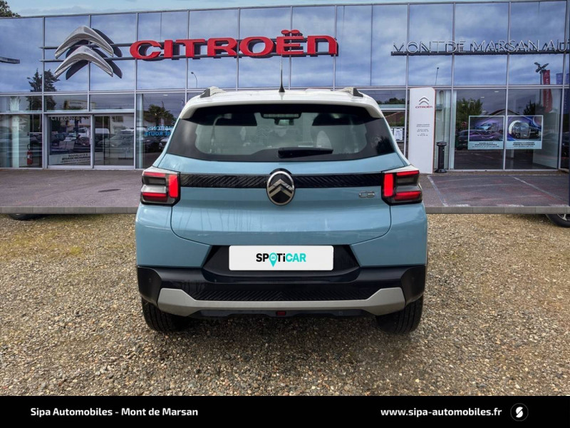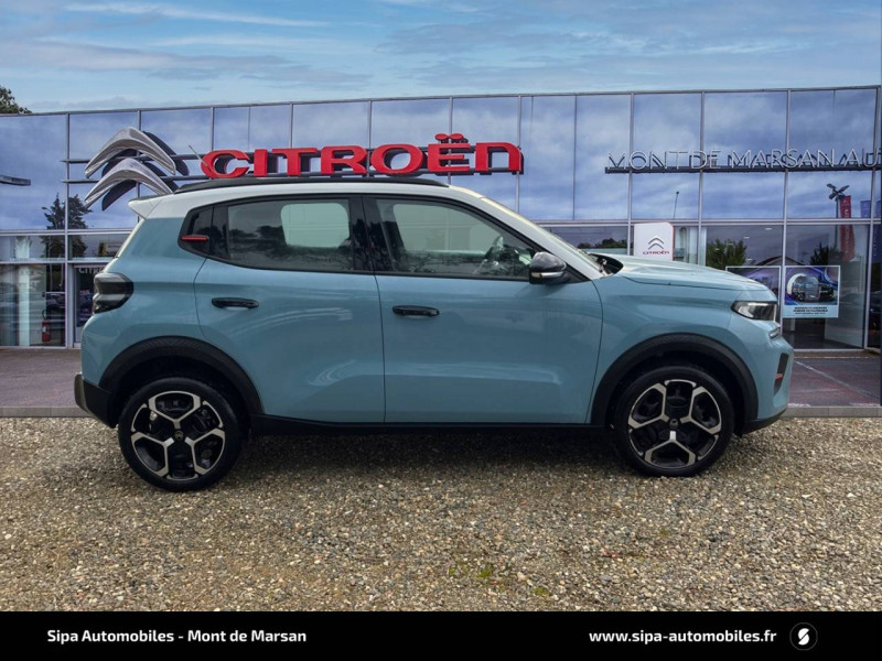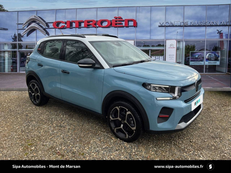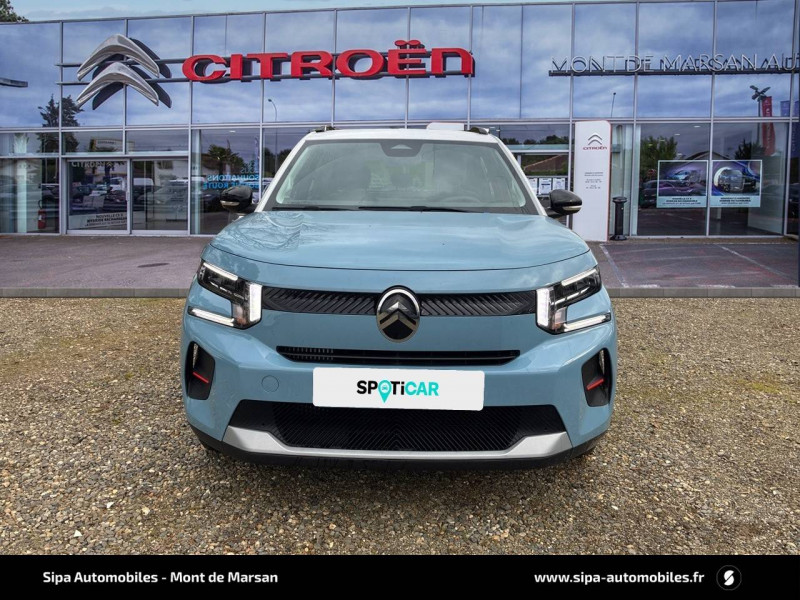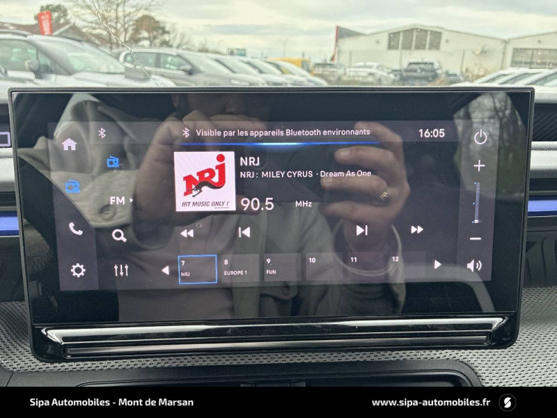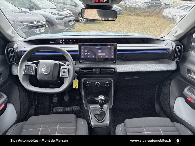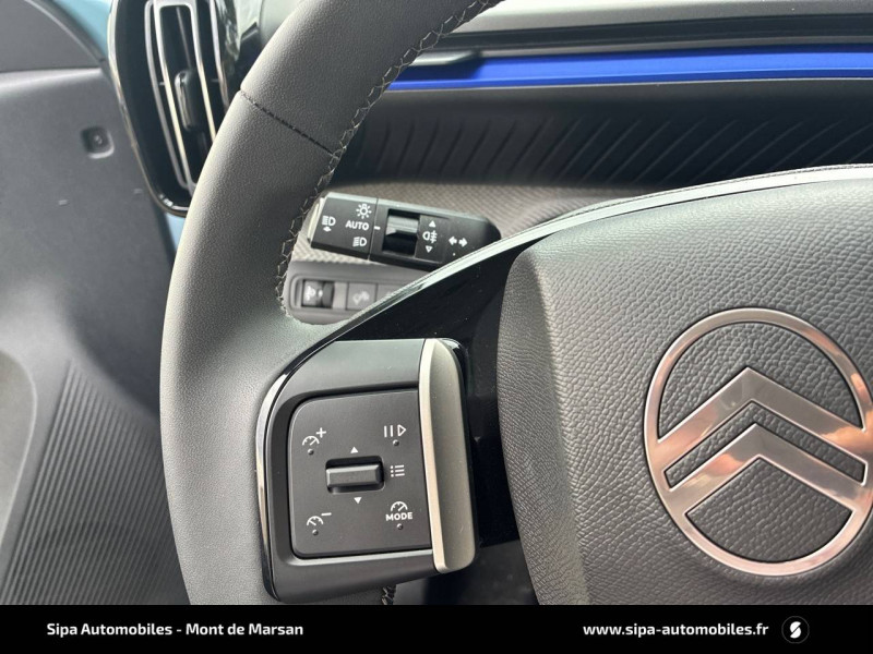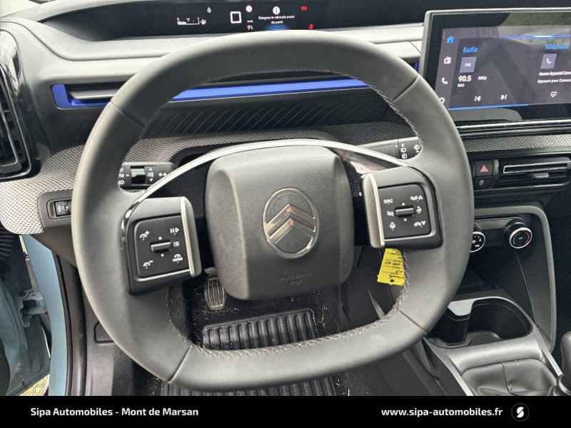 1 prise USB -C sur la planche de bord (charge rapide 3A) / 2 Prises USB type-C (charge rapide 3A) en rang 2 / ABS avec REF, AFU et ESP / Ambiance Urban Grey avec Sièges Advanced Comfort / Barres de toit Noir Brillant / Boîtier télématique: Appel d'urgence et Citroën Assistance les services Connect ONE pendant une période de 10 ans / Citroën Head up Display (affichage tête haute) - TFT / Décors extérieurs Noir Brillant / Détection de sous-gonflage / Ecran central 10,25 " tactile: Apple CarPlay et Android Auto sans fil Système audio 6 HPs (DAB) / Elargisseurs d'ailes Noir Mat / Enjoliveurs 17" AZURITE / Essuie-vitre AV automatique (capteur de pluie) / Garnissage Tissu Noir / Tissu Asphalt avec Sièges Advanced Comfort. Comprend les décors sur les panneaux de portes AV/ AR et sur la planche de bord Ultra Blue, le siège conducteur réglable en hauteur, les appui-têtes AV réglables en hauteur, les accoudoirs de porte AV et AR recouverts de textile moussé avec étiquettes « Happy Tags » (messages positifs), et des poches aumônières au dos des sièges AV / Lève-vitres AV électriques (descente séquentielle) / Pack Safety - Active Safety Brake (Freinage automatique d'urgence) - Alerte active de Franchissement Involontaire de Ligne - Alerte Attention Conducteur - Reconnaissance des panneaux de signalisation - Régulateur-limiteur de vitesse / Poignées de portes extérieures Noir Brillant / Sabots de protection AV et AR / Station d'accueil Smartphone Radio via smartphone (avec application My Citroën Play), 2 HP en rang 1, Commande de la radio sur le volant / Suspension Citroën Advanced Comfort / Témoin de non-bouclage des ceintures de sécurité conducteur et passagers