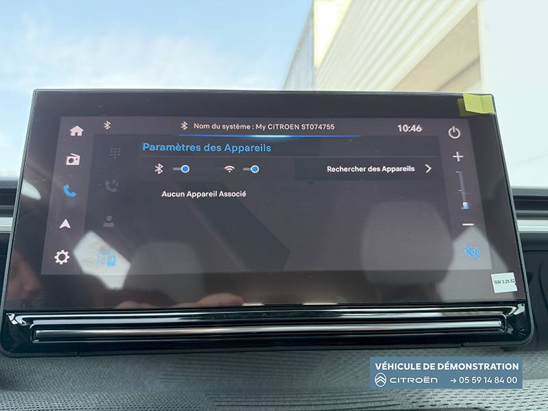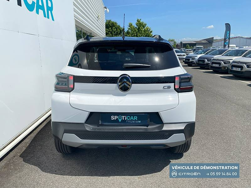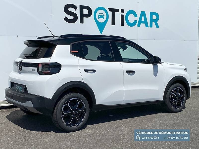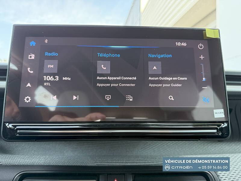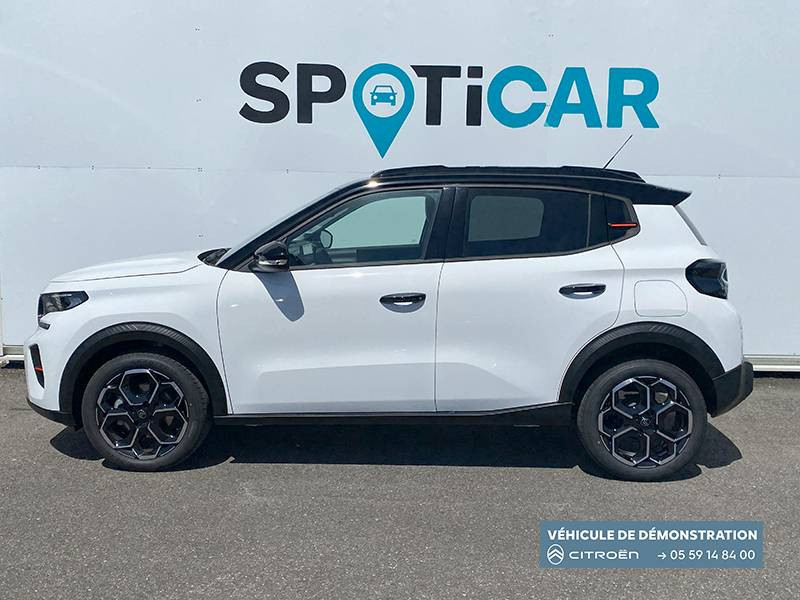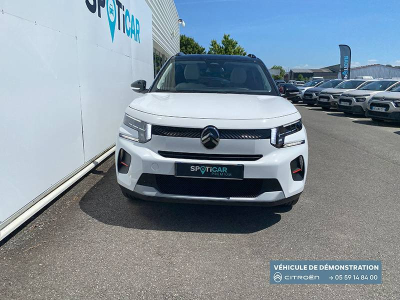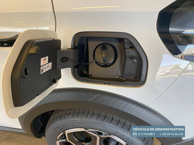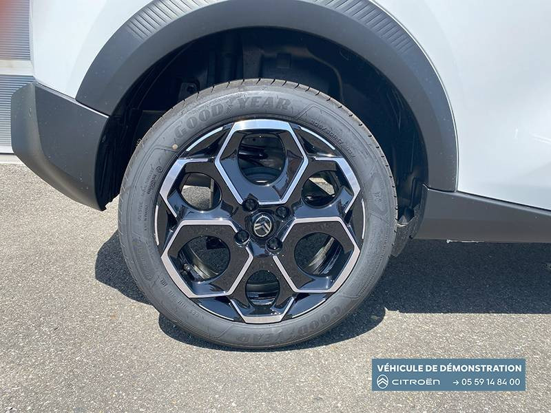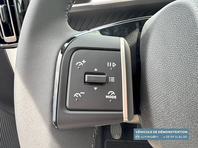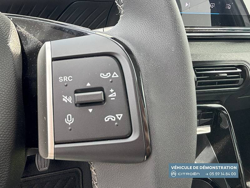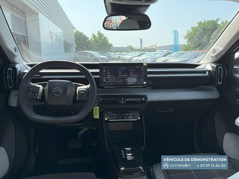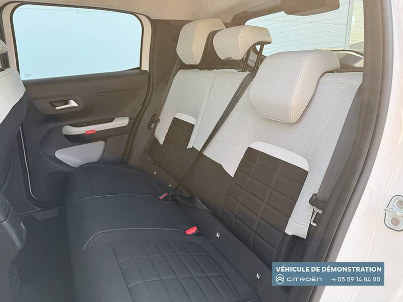 1 prise USB -C sur la planche de bord (charge rapide 3A) / 2 Prises USB type-C (charge rapide 3A) en rang 2 / ABS, ESP / AFU, REF / Ambiance Metropolitan Grey - Accoudoirs de porte AV et AR recouverts de textile moussé avec étiquette "Happy Tags" (messages positifs), - Appui-têtes AV réglables en hauteur, - Décors sur les panneaux de porte AV Gris Sidérite, - Décors sur la planche de bord Gris Sidérite, - Poches aumônières et poches supplémentaires pour smartphone au dos des sièges AV / Barres de toit Noir Brillant / Boîte automatique 6 rapports / Boîtier télématique: Appel d'urgence et Citroën Assistance les services Connect ONE pendant une période de 10 ans / Citroën Head up Display (affichage tête haute) - TFT / Commutation automatique des feux de route / Console centrale haute avec accoudoir et rangement fermé / Décors extérieurs Noir Brillant (enjoliveurs de montant central et custode) / Détection de sous-gonflage / Ecran central 10,25 " tactile: Apple CarPlay et Android Auto sans fil Système audio 6 HPs (DAB) / Elargisseurs d'ailes Noir Mat / Essuie-vitre AV automatique (capteur de pluie) / Frein de stationnement électrique / Garnissage Tissu Noir / Tissu City / Toile enduite Claire avec Sièges Advanced Comfort / Jantes alliage 17" Atacamite diamantées / Lève-vitres AR électriques (descente séquentielle) / Lève-vitres AV électriques (descente séquentielle) / Navigation 3D sur écran central 10,25" tactile / Pack Safety - Active Safety Brake (Freinage automatique d'urgence) - Alerte active de Franchissement Involontaire de Ligne - Alerte Attention Conducteur - Reconnaissance des panneaux de signalisation - Régulateur-limiteur de vitesse / Poignées de portes extérieures Noir Brillant / Recharge sans fil pour smartphone / Rétroviseur intérieur électrochrome / Sabots de protection AV et AR / Station d'accueil Smartphone Radio via smartphone (avec application My Citroën Play), 2 HP en rang 1, Commande de la radio sur le volant / Suspension Citroën Advanced Comfort / Témoin et alerte de non-bouclage des ceintures AV et de débouclage AV et AR