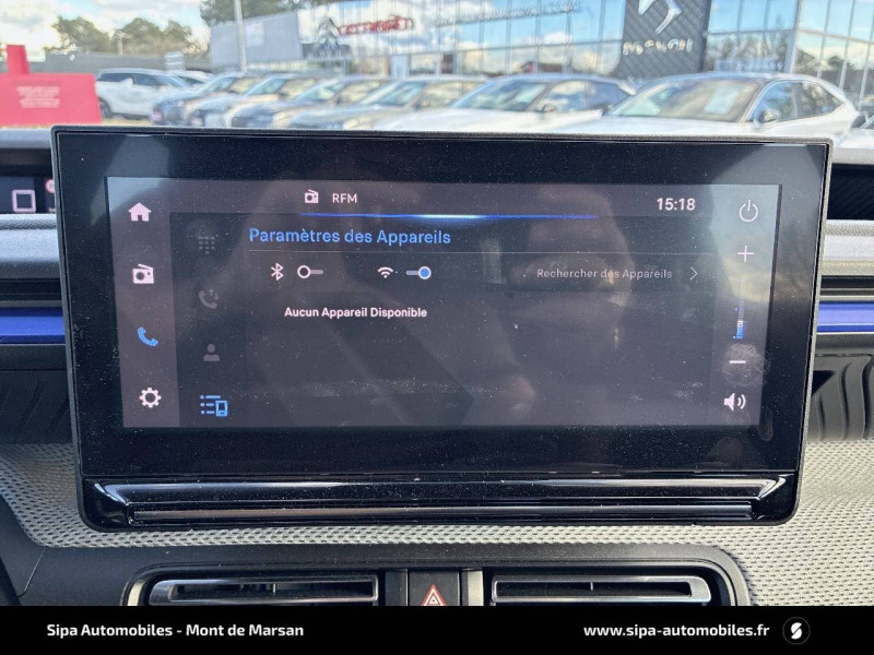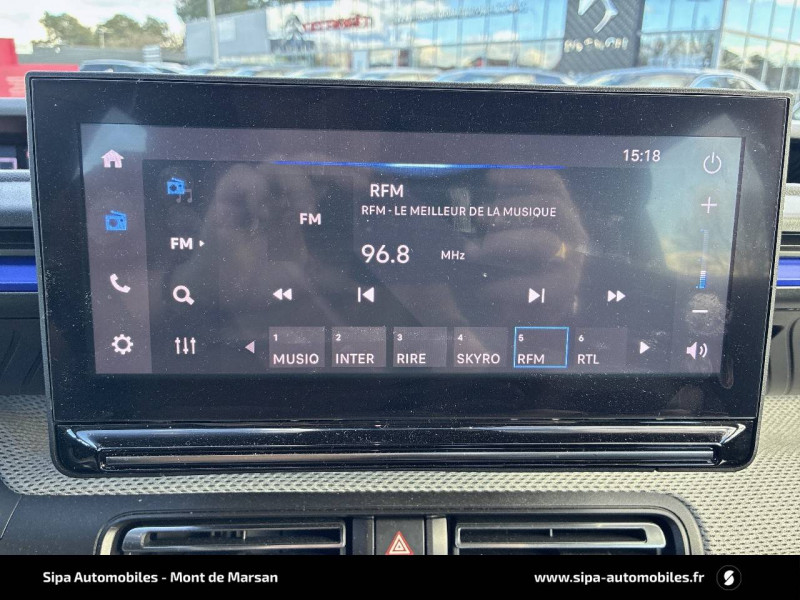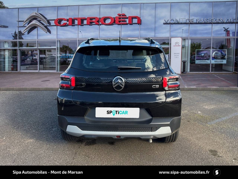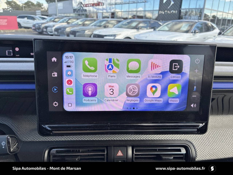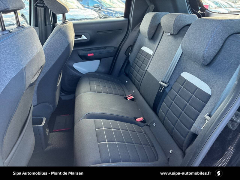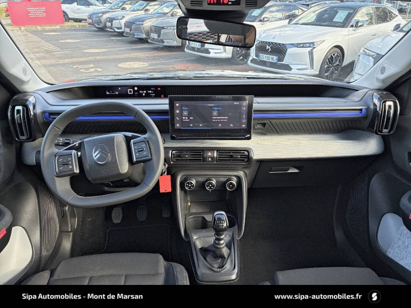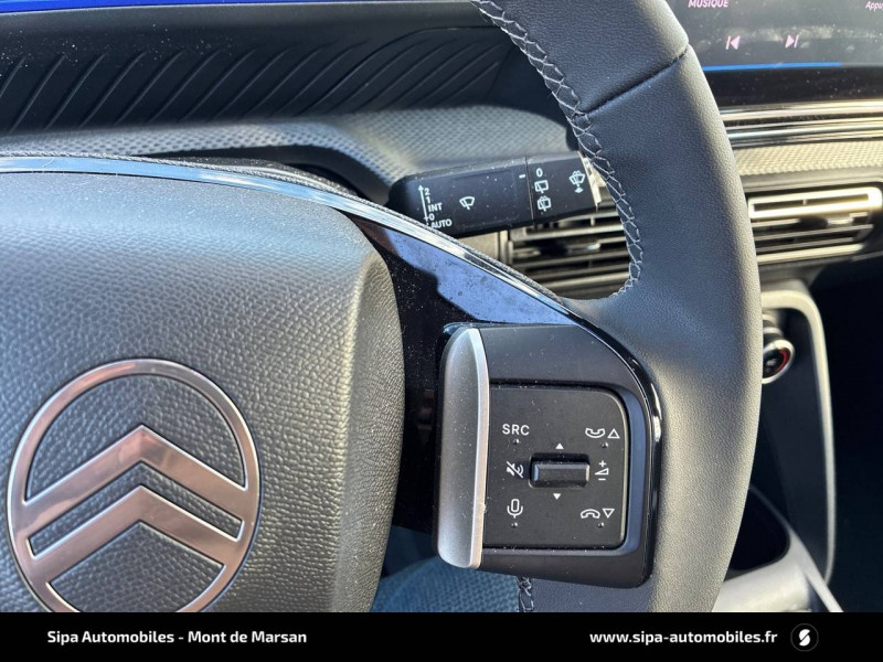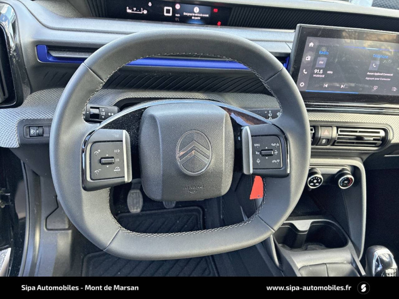 1 prise USB -C sur la planche de bord (charge rapide 3A) / 2 Prises USB type-C (charge rapide 3A) en rang 2 / ABS, ESP / AFU, REF / Ambiance Urban Grey avec Sièges Advanced Comfort / Barres de toit Noir Brillant / Boîte manuelle 6 rapports / Boîtier télématique: Appel d'urgence et Citroën Assistance les services Connect ONE pendant une période de 10 ans / Citroën Head up Display (affichage tête haute) - TFT / Décors extérieurs Noir Brillant / Détection de sous-gonflage / Ecran central 10,25 " tactile: Apple CarPlay et Android Auto sans fil Système audio 6 HPs (DAB) / Elargisseurs d'ailes Noir Mat / Enjoliveurs 17" AZURITE / Essuie-vitre AV automatique (capteur de pluie) / Garnissage Tissu Noir / Tissu Asphalt avec Sièges Advanced Comfort / Lève-vitres AV électriques (descente séquentielle) / Pack Safety - Active Safety Brake (Freinage automatique d'urgence) - Alerte active de Franchissement Involontaire de Ligne - Alerte Attention Conducteur - Reconnaissance des panneaux de signalisation - Régulateur-limiteur de vitesse / Poignées de portes extérieures Noir Brillant / Sabots de protection AV et AR / Station d'accueil Smartphone Radio via smartphone (avec application My Citroën Play), 2 HP en rang 1, Commande de la radio sur le volant / Suspension Citroën Advanced Comfort / Témoin de non-bouclage des ceintures de sécurité conducteur et passagers