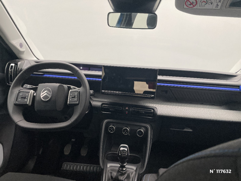 ABS, ESP, TCS / Boîte automatique 6 rapports / Boîte manuelle 6 rapports / Décors extérieurs Noir Brillant / Essuie-vitre AV automatique (capteur de pluie) / Suspension Citroën Advanced Comfort / Détection de sous-gonflage / Barres de toit Noir Brillant / Pack Safety - Active Safety Brake (Freinage automatique d?urgence) - Alerte active de Franchissement Involontaire de Ligne - Alerte Attention Conducteur - Reconnaissance des panneaux de signalisation - Régulateur-limiteur de vitesse / Elargisseurs d'ailes Noir Mat / Témoin de non-bouclage des ceintures de sécurité conducteur et passagers / Garnissage Tissu Noir / Tissu Asphalt avec Sièges Advanced Comfort. Comprend les décors sur les panneaux de portes AV/ AR et sur la planche de bord Ultra Blue, le siège conducteur réglable en hauteur, les appui-têtes AV réglables en hauteur, les accoudoirs de porte AV et AR recouverts de textile moussé avec étiquettes « Happy Tags » (messages positifs), et des poches aumônières au dos des sièges AV / Ambiance Urban Grey avec Sièges Advanced Comfort / Enjoliveurs 17" AZURITE / Station d'accueil Smartphone Radio via smartphone (avec application My Citroën Play), 2 HP en rang 1, Commande de la radio sur le volant / Citroën Head up Display (affichage tête haute) - TFT / Poignées de portes extérieures Noir Brillant / 2 Prises USB type-C (charge rapide 3A) en rang 2 / Lève-vitres AV électriques (descente séquentielle) / Ecran central 10,25 " tactile: Apple CarPlay et Android Auto sans fil Système audio 6 HPs (DAB) / 1 prise USB -C sur la planche de bord (charge rapide 3A) / Sabots de protection AV et AR / ABS avec REF, AFU et ESP / Garnissage Tissu Noir / Tissu Asphalt avec Sièges Advanced Comfort / AFU, REF / Boîtier télématique : Appel d?urgence et Citroën Assistance les services Connect ONE pendant une période de 10 ans