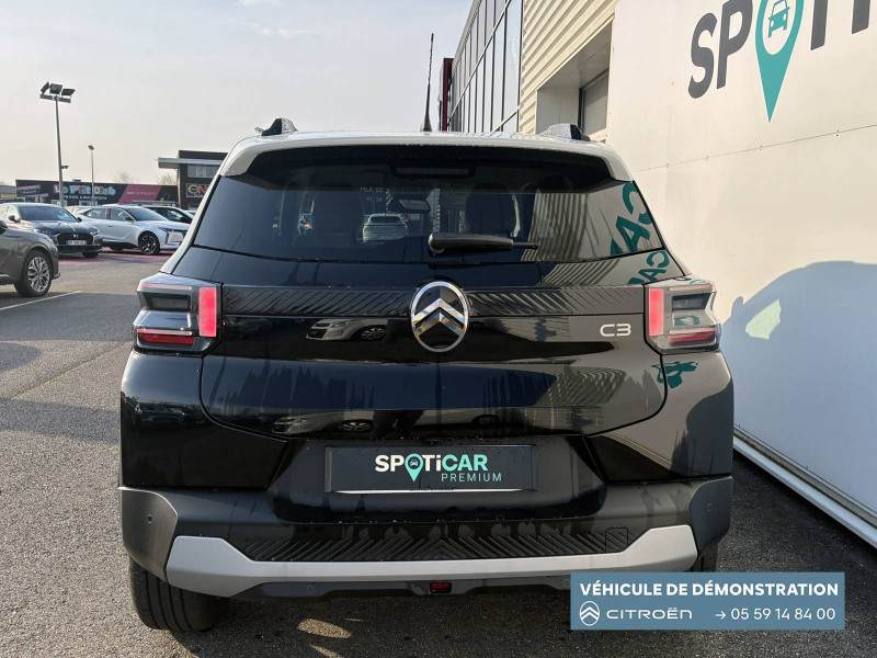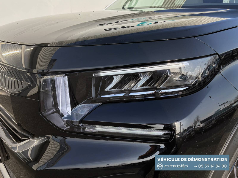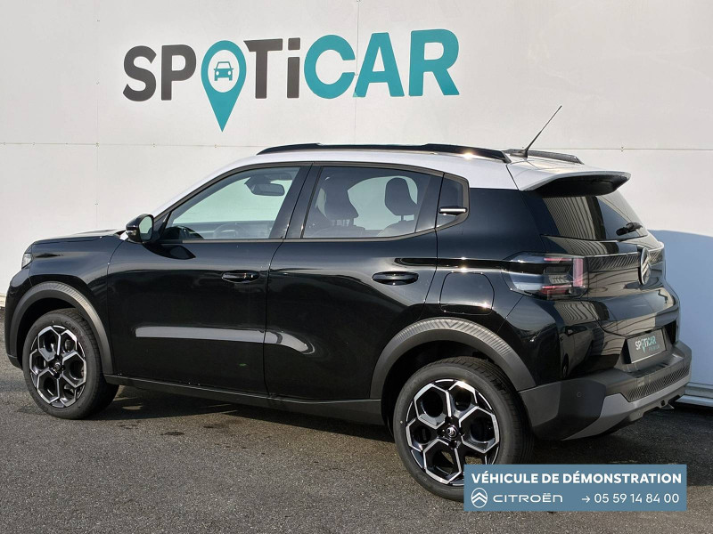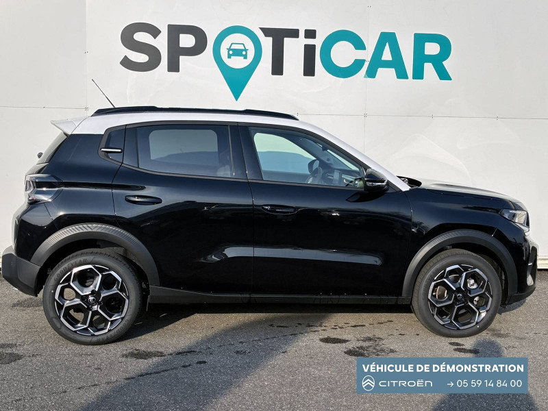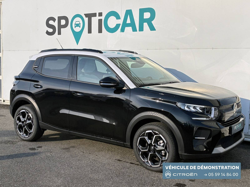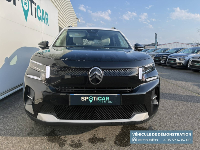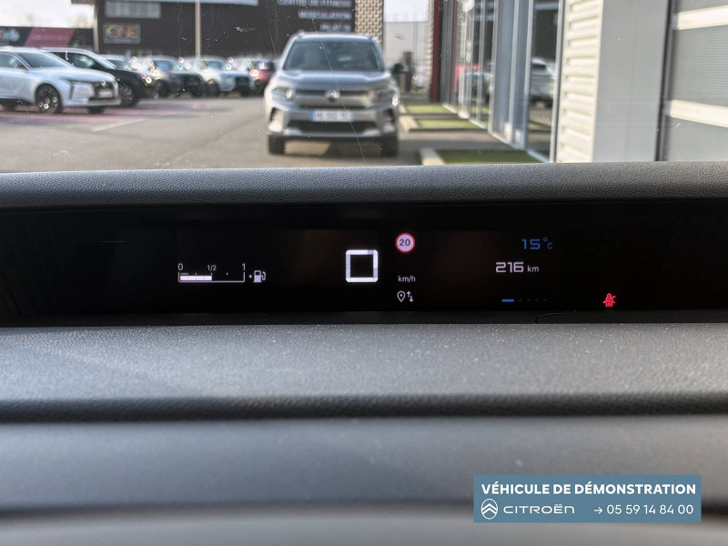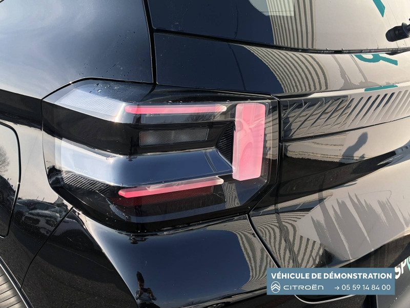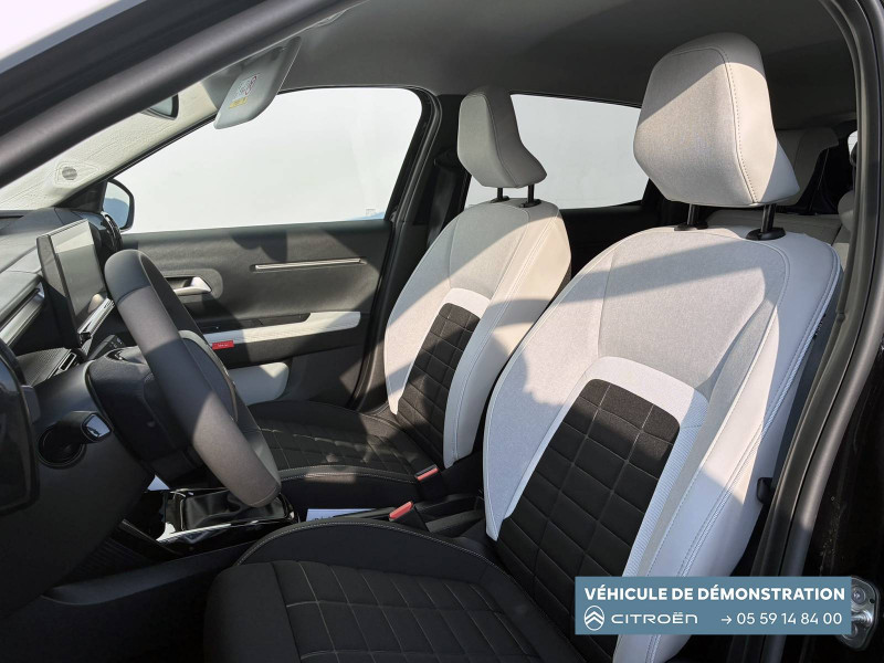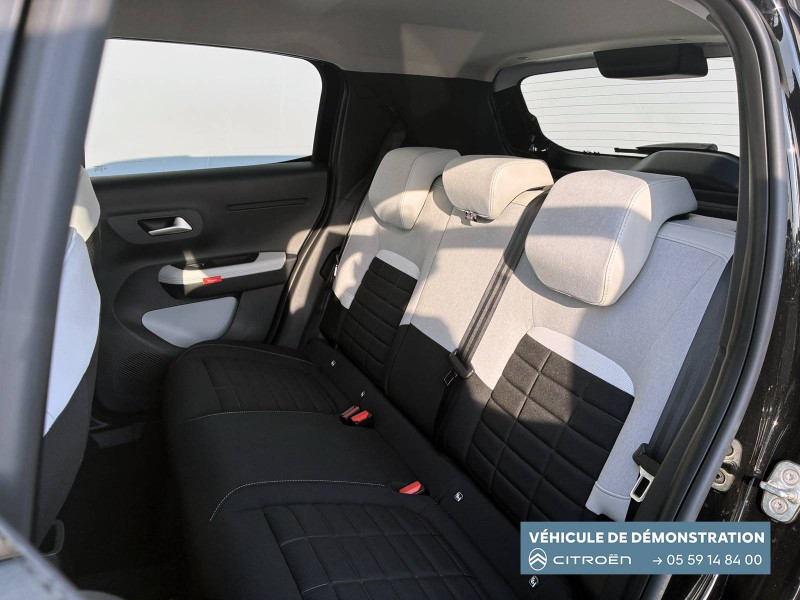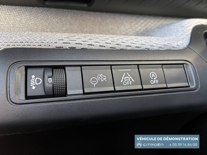 1 prise USB -C sur la planche de bord (charge rapide 3A) / 2 Prises USB type-C (charge rapide 3A) en rang 2 / ABS, ESP / AFU, REF / Ambiance Metropolitan Grey - Accoudoirs de porte AV et AR recouverts de textile moussé avec étiquette "Happy Tags" (messages positifs), - Appui-têtes AV réglables en hauteur, - Décors sur les panneaux de porte AV Gris Sidérite, - Décors sur la planche de bord Gris Sidérite, - Poches aumônières et poches supplémentaires pour smartphone au dos des sièges AV / Barres de toit Noir Brillant / Boîte manuelle 6 rapports / Boîtier télématique: Appel d'urgence et Citroën Assistance les services Connect ONE pendant une période de 10 ans / Citroën Head up Display (affichage tête haute) - TFT / Commutation automatique des feux de route / Décors extérieurs Noir Brillant (enjoliveurs de montant central et custode) / Détection de sous-gonflage / Ecran central 10,25 " tactile: Système audio 6 HPs (DAB). Apple CarPlay et Android Auto sans fil / Elargisseurs d'ailes Noir Mat / Enjoliveurs 17" AZURITE / Essuie-vitre AV automatique (capteur de pluie) / Garnissage Tissu Noir / Tissu City / Toile enduite Claire avec Sièges Advanced Comfort / Jantes alliage 17" Atacamite diamantées / Lève-vitres AR électriques (descente séquentielle) / Lève-vitres AV électriques (descente séquentielle) / Navigation 3D Connecté sur écran central 10,25" tactile / Pack Safety - Active Safety Brake (Freinage automatique d'urgence) - Alerte active de Franchissement Involontaire de Ligne - Alerte Attention Conducteur - Reconnaissance des panneaux de signalisation - Régulateur-limiteur de vitesse / Poignées de portes extérieures Noir Brillant / Recharge sans fil pour smartphone / Rétroviseur intérieur électrochrome / Sabots de protection AV et AR / Suspension Citroën Advanced Comfort / TCS (Contrôle de la traction) / Témoin et alerte de non-bouclage des ceintures AV et de débouclage AV et AR