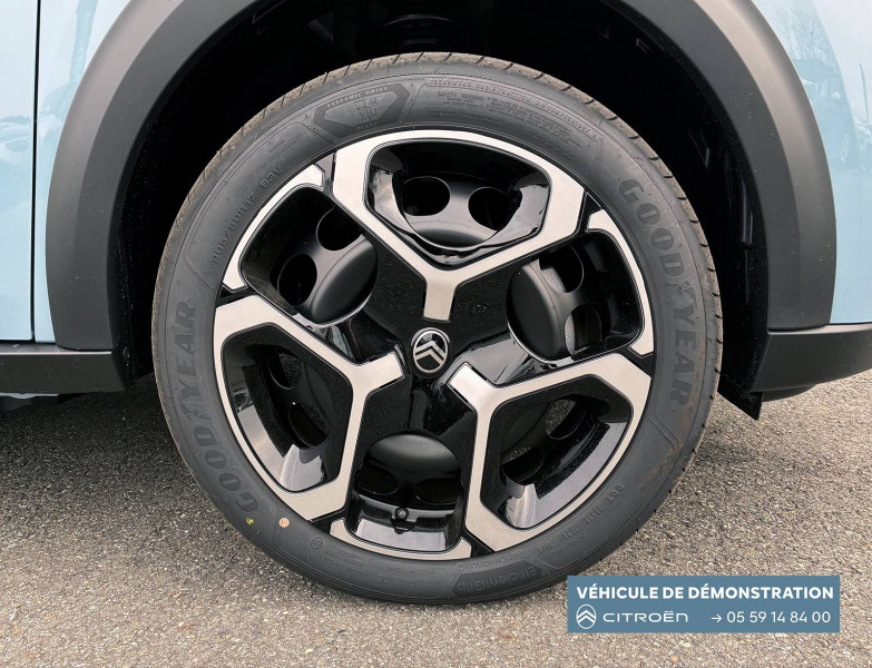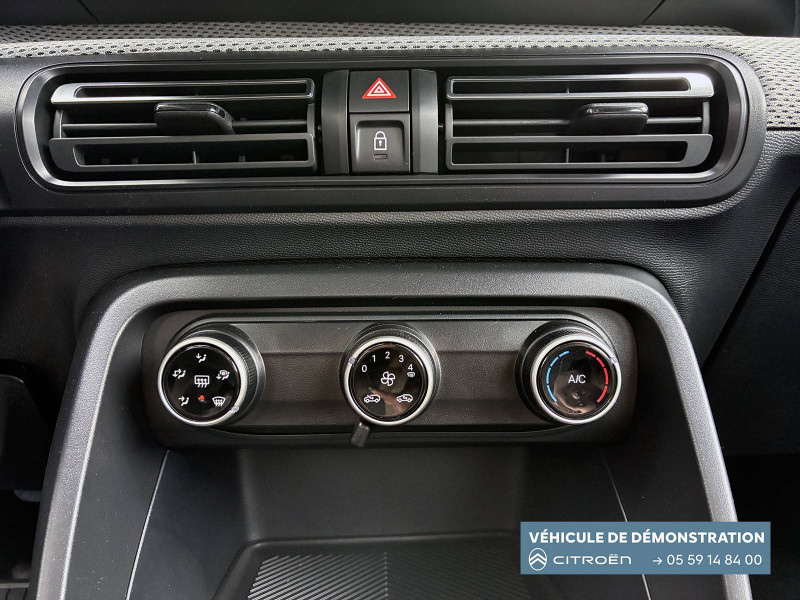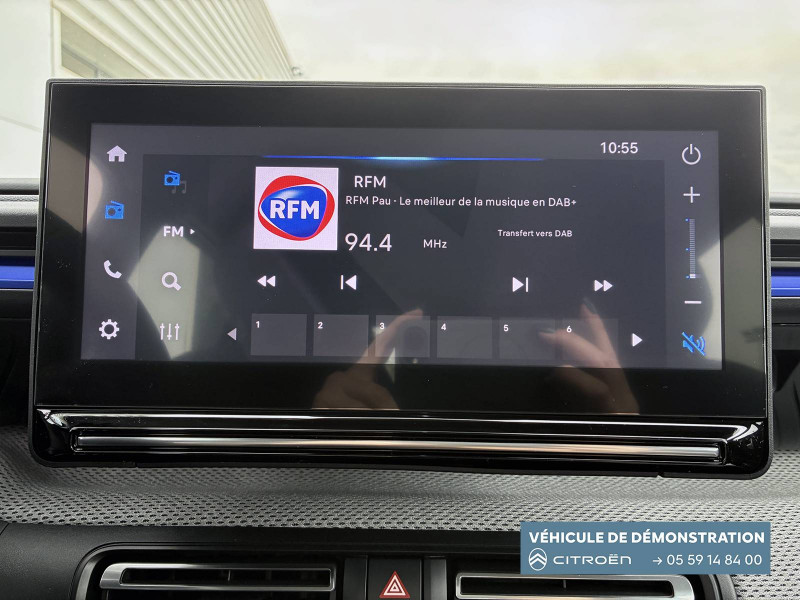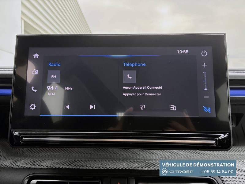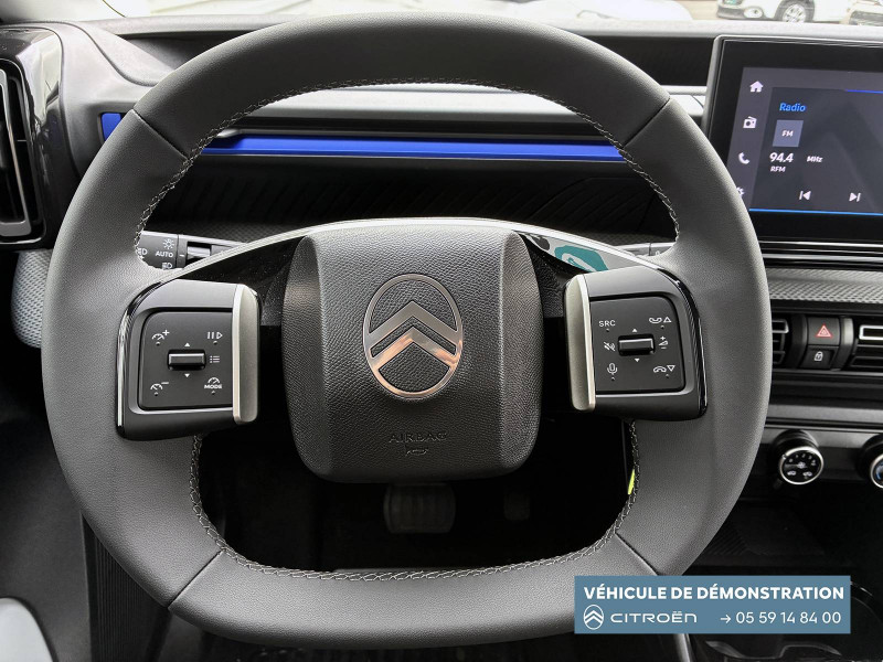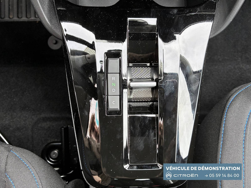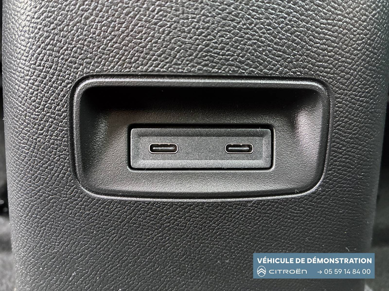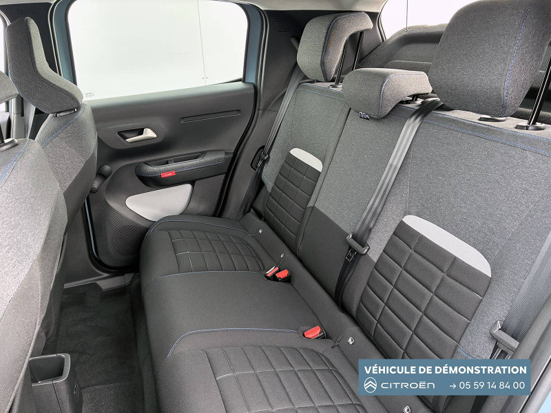 1 prise USB -C sur la planche de bord (charge rapide 3A) / 2 Prises USB type-C (charge rapide 3A) en rang 2 / ABS, ESP / AFU, REF / Ambiance Urban Grey - Accoudoirs de porte AV et AR recouverts de textile moussé avec étiquette "Happy Tags" (messages positifs), - Appui-têtes AV réglables en hauteur, - Décors sur les panneaux de porte AV Ultra Blue, - Décors sur la planche de bord Gris Ultra Blue, - Poches aumônières et poches supplémentaires pour smartphone au dos des sièges AV / Avertisseur Sonore Piéton / Barres de toit Noir Brillant / Boîte automatique 1 vitesse / Boîtier télématique: Appel d'urgence et Citroën Assistance les services Connect ONE pendant une période de 10 ans / Câble de charge Mode 3 (Wall Box) pour prise de charge T2 / Chargeur embarqué 7.4 kW monophasé / Citroën Head up Display (affichage tête haute) - TFT / Commutation automatique des feux de route / Décors extérieurs Noir Brillant (enjoliveurs de montant central et custode) / Détection de sous-gonflage / Ecran central 10,25 " tactile: Système audio 6 HPs (DAB). Apple CarPlay et Android Auto sans fil / Elargisseurs d'ailes Noir Mat / Enjoliveurs 17" AZURITE / E-Remote : Contrôle de la charge (pour une période d'essai de 12 mois) / Essuie-vitre AV automatique (capteur de pluie) / Garnissage Tissu Noir / Tissu Asphalt avec Sièges Advanced Comfort / Lève-vitres AR manuels / Lève-vitres AV électriques (descente séquentielle) / Pack Safety - Active Safety Brake (Freinage automatique d'urgence) - Alerte active de Franchissement Involontaire de Ligne - Alerte Attention Conducteur - Reconnaissance des panneaux de signalisation - Régulateur-limiteur de vitesse / Poignées de portes extérieures Noir Brillant / Sabots de protection AV et AR / Services Connect PLUS pendant 12 mois / Station d'accueil Smartphone Radio via smartphone (avec application My Citroën Play), 2 HP en rang 1, Commande de la radio sur le volant / Témoin et alerte de non-bouclage des ceintures AV et de débouclage AV et AR / Toit Monoton