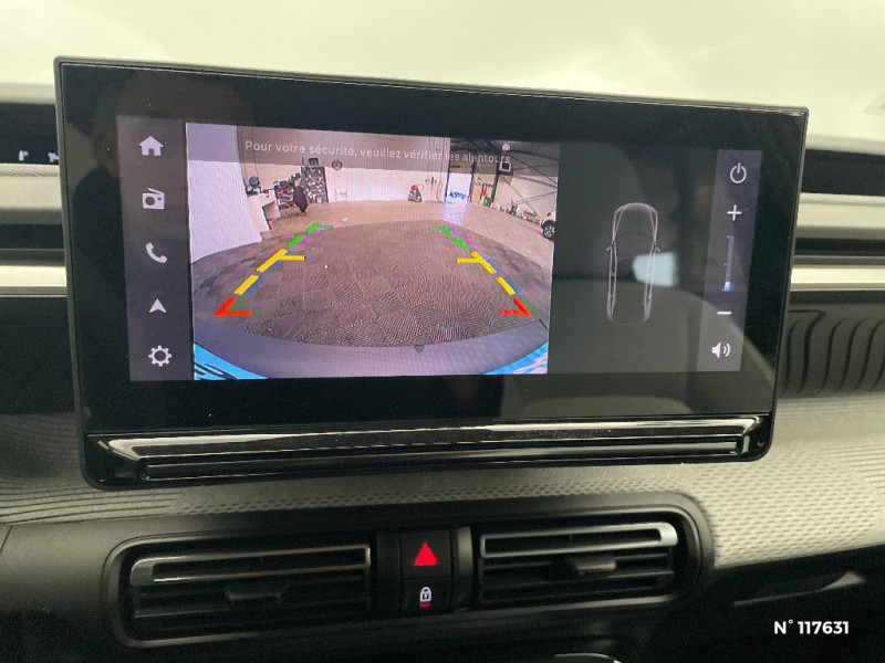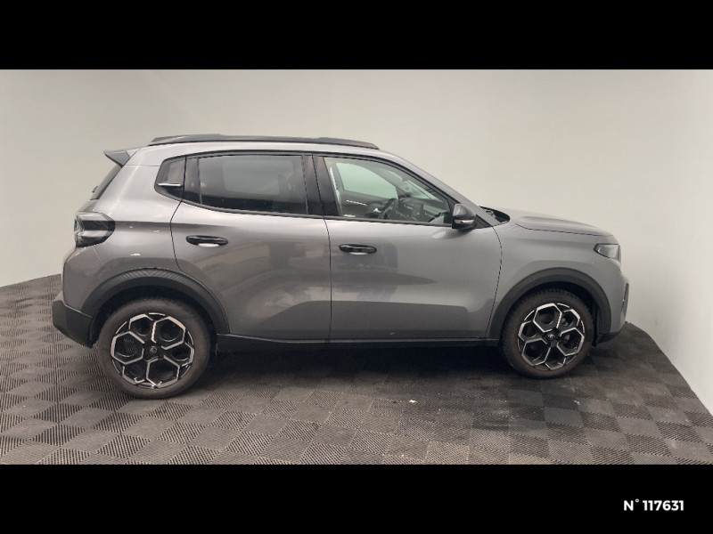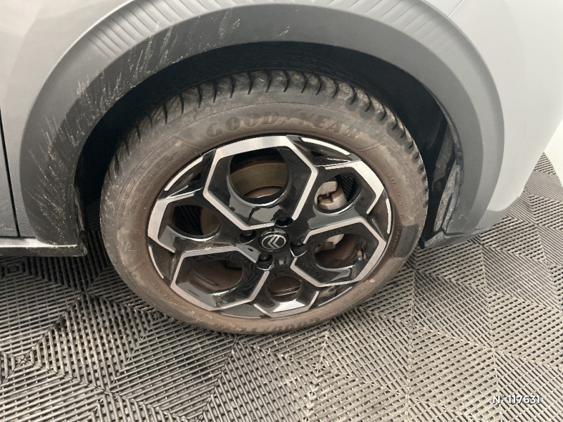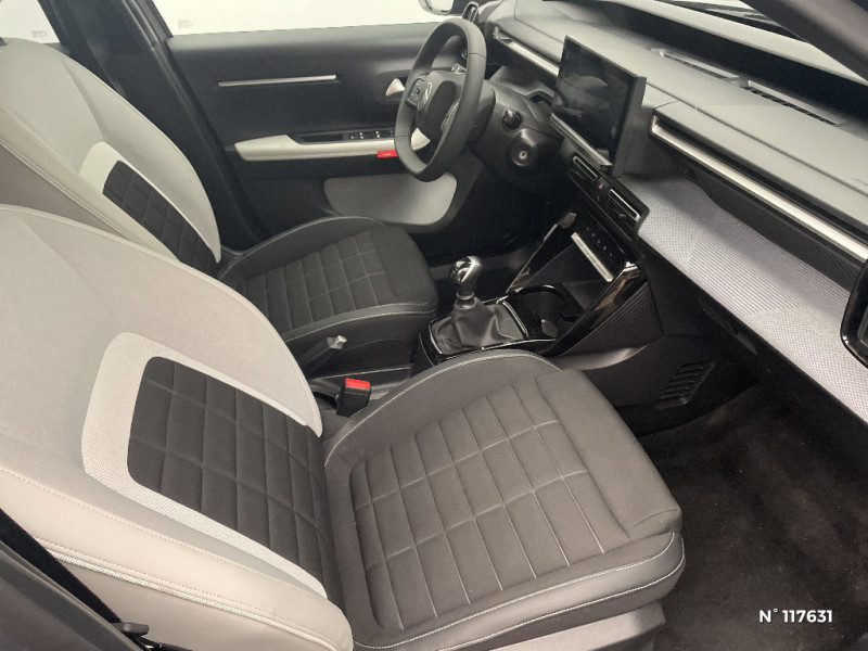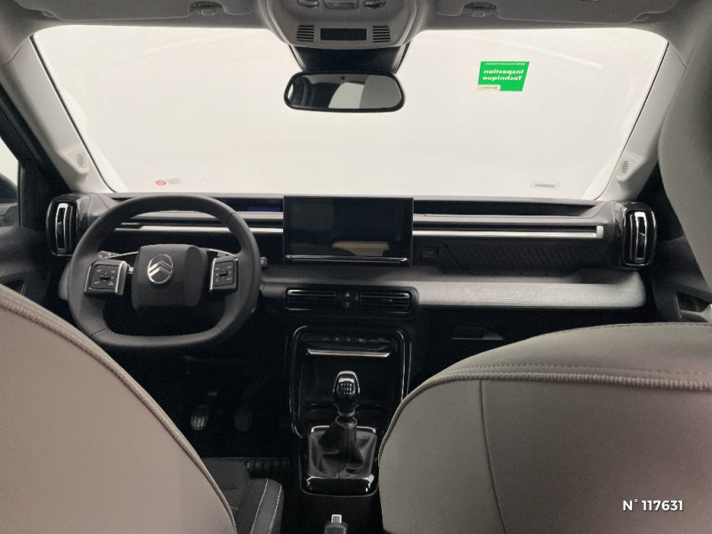 TCS (Contrôle de la traction) / Sabots de protection AV et AR / 1 prise USB -C sur la planche de bord (charge rapide 3A) / Lève-vitres AV électriques (descente séquentielle) / Station d'accueil Smartphone Radio via smartphone (avec application My Citroën Play), 2 HP en rang 1, Commande de la radio sur le volant / Suspension Citroën Advanced Comfort / Navigation 3D Connecté sur écran central 10,25" tactile / Citroën Head up Display (affichage tête haute) - TFT / Poignées de portes extérieures Noir Brillant / Boîte manuelle 6 rapports / Barres de toit Noir Brillant / Recharge sans fil pour smartphone / Garnissage Tissu Noir / Tissu City / Toile enduite Claire avec Sièges Advanced Comfort / AFU, REF / Système audio numérique MP3 6 HP (DAB) / Boîtier télématique : Appel d?urgence et Citroën Assistance les services Connect ONE pendant une période de 10 ans / Essuie-vitre AV automatique (capteur de pluie) / ABS, ESP, TCS / Ambiance Metropolitan Grey - Accoudoirs de porte AV et AR recouverts de textile moussé avec étiquette "Happy Tags" (messages positifs), - Appui-têtes AV réglables en hauteur, - Décors sur les panneaux de porte AV Gris Sidérite, - Décors sur la planche de bord Gris Sidérite, - Poches aumônières et poches supplémentaires pour smartphone au dos des sièges AV / Allumage des feux de détresse en cas de forte décélération / Commutation automatique des feux de route / Décors extérieurs Noir Brillant (enjoliveurs de montant central et custode) / Pack Safety - Active Safety Brake (Freinage automatique d?urgence) - Alerte active de Franchissement Involontaire de Ligne - Alerte Attention Conducteur - Reconnaissance des panneaux de signalisation - Régulateur-limiteur de vitesse / Témoin et alerte de non-bouclage des ceintures AV et de débouclage AV et AR / Jantes alliage 17" Atacamite diamantées / Lève-vitres AR électriques (descente séquentielle) / Fixations ISOFIX sur les deux places latérales AR avec 3 points d'encrage / Miroir de courtoisie sur les pare-soleils conducteur et passager (occultable côté conducteur) / Plafonnier AV à LED avec lecteurs de cartes / Navigation 3D sur écran central 10,25" tactile / Elargisseurs d'ailes Noir Mat / Détection de sous-gonflage / 2 Prises USB type-C (charge rapide 3A) en rang 2 / Ecran central 10,25 " tactile: Apple CarPlay et Android Auto sans fil Système audio 6 HPs (DAB) / Clignotants impulsionnels / Sécurité enfants mécanique / Rétroviseur intérieur électrochrome / Enjoliveurs 17" AZURITE / Eclairage d?accueil et d'accompagnement