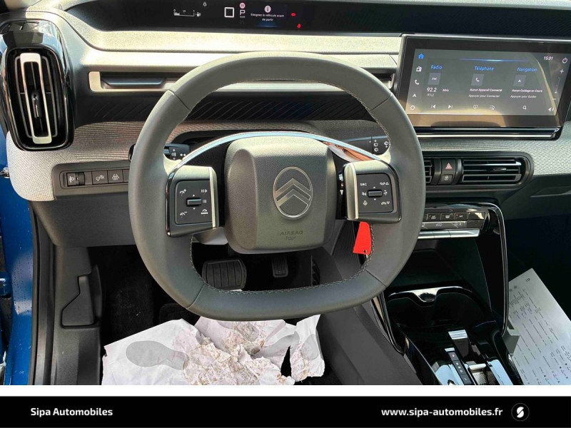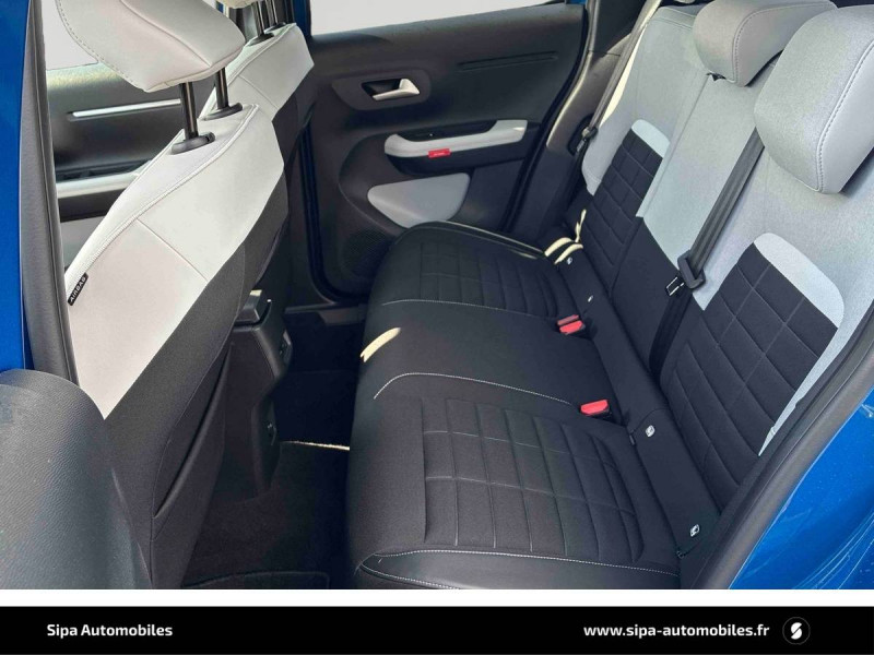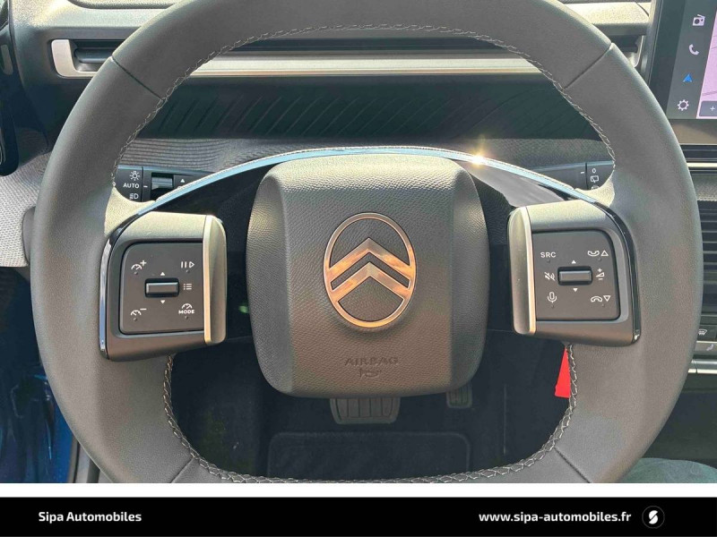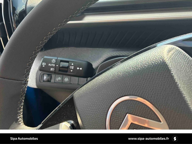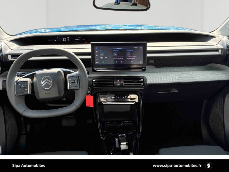 1 prise USB -C sur la planche de bord (charge rapide 3A) / 2 Prises USB type-C (charge rapide 3A) en rang 2 / ABS, ESP / AFU, REF / Ambiance Metropolitan Grey avec Sièges Advanced Comfort / Barres de toit Noir Brillant / Boîte automatique 6 rapports / Boîtier télématique: Appel d'urgence et Citroën Assistance les services Connect ONE pendant une période de 10 ans / Citroën Head up Display (affichage tête haute) - TFT / Console centrale haute avec accoudoir et rangement fermé / Décors extérieurs Noir Brillant / Détection de sous-gonflage / Ecran central 10,25 " tactile: Apple CarPlay et Android Auto sans fil Système audio 6 HPs (DAB) / Elargisseurs d'ailes Noir Mat / Essuie-vitre AV automatique (capteur de pluie) / Frein de stationnement électrique / Garnissage Tissu Noir / Tissu City / Toile enduite Claire avec Sièges Advanced Comfort / Jantes alliage 17" Atacamite diamantées / Lève-vitres AR électriques (descente séquentielle) / Lève-vitres AV électriques (descente séquentielle) / Navigation 3D sur écran central 10,25" tactile / Pack Safety - Active Safety Brake (Freinage automatique d'urgence) - Alerte active de Franchissement Involontaire de Ligne - Alerte Attention Conducteur - Reconnaissance des panneaux de signalisation - Régulateur-limiteur de vitesse / Poignées de portes extérieures Noir Brillant / Recharge sans fil pour smartphone / Rétroviseur intérieur électrochrome / Sabots de protection AV et AR / Station d'accueil Smartphone Radio via smartphone (avec application My Citroën Play), 2 HP en rang 1, Commande de la radio sur le volant / Suspension Citroën Advanced Comfort / Témoin de non-bouclage des ceintures de sécurité conducteur et passagers
