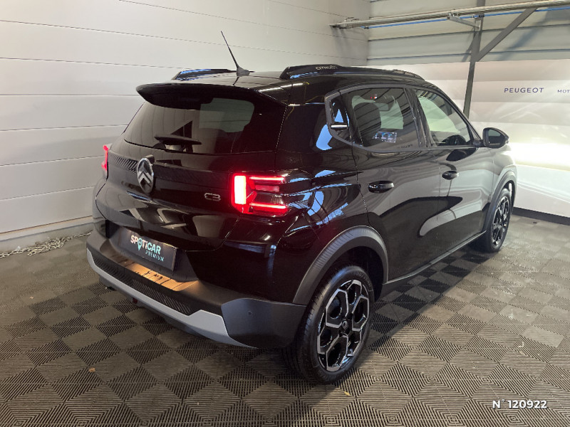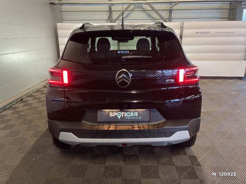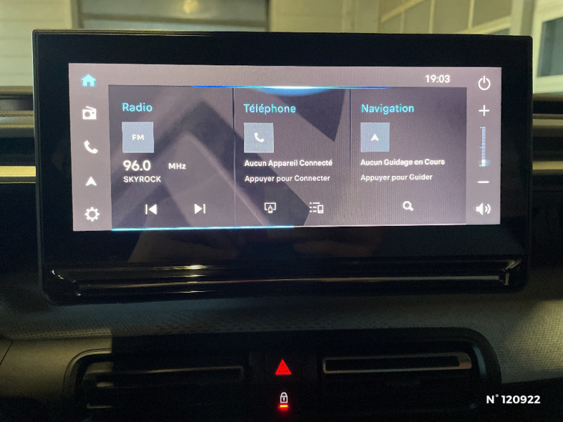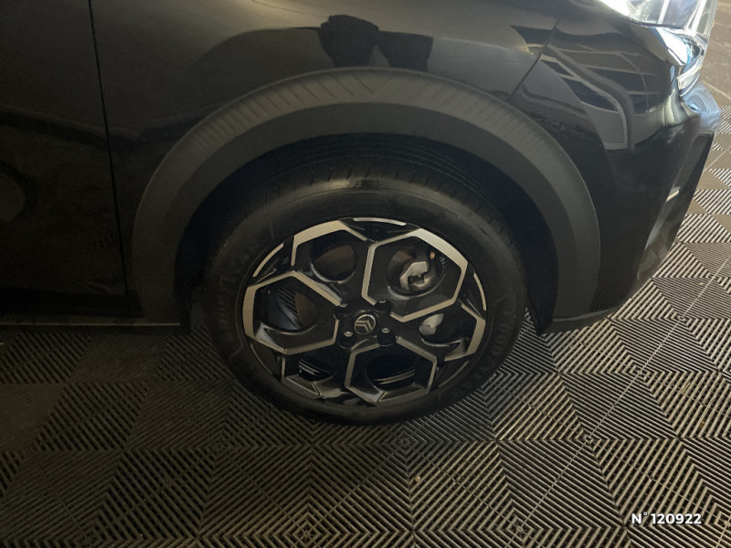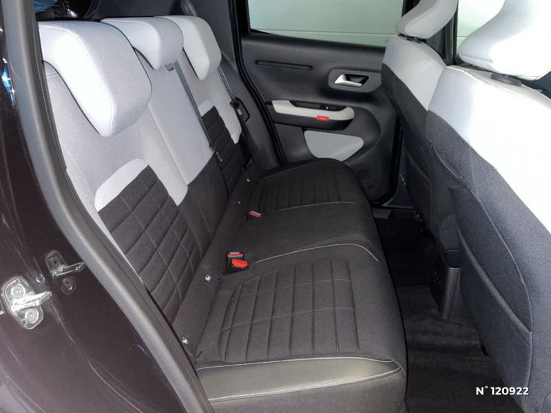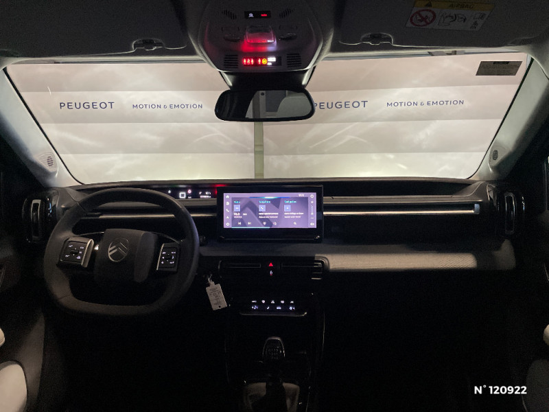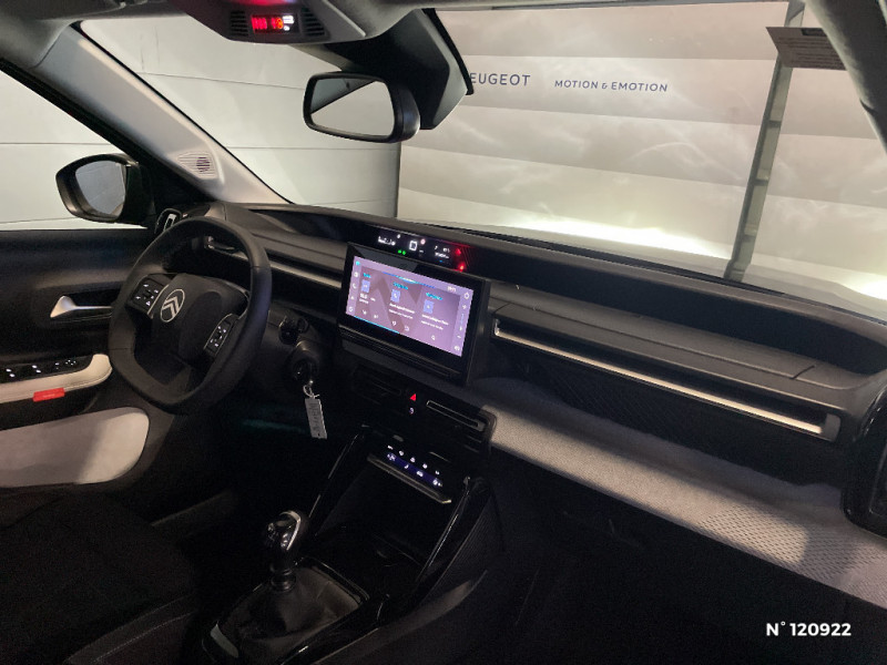 2 Prises USB type-C (charge rapide 3A) en rang 2 / Pack Safety - Active Safety Brake (Freinage automatique d'urgence) - Alerte active de Franchissement Involontaire de Ligne - Alerte Attention Conducteur - Reconnaissance des panneaux de signalisation - Régulateur-limiteur de vitesse / ABS, ESP / Boîte manuelle 6 rapports / AFU, REF / Garnissage Tissu Noir / Tissu City / Toile enduite Claire avec Sièges Advanced Comfort / Lève-vitres AV électriques (descente séquentielle) / Jantes alliage 17" Atacamite diamantées / Lève-vitres AR électriques (descente séquentielle) / Essuie-vitre AV automatique (capteur de pluie) / Boîtier télématique: Appel d'urgence et Citroën Assistance les services Connect ONE pendant une période de 10 ans / Citroën Head up Display (affichage tête haute) - TFT / 1 prise USB -C sur la planche de bord (charge rapide 3A) / Enjoliveurs 17" AZURITE / TCS (Contrôle de la traction) / Navigation 3D Connecté sur écran central 10,25" tactile / Commutation automatique des feux de route / Témoin et alerte de non-bouclage des ceintures AV et de débouclage AV et AR / Décors extérieurs Noir Brillant (enjoliveurs de montant central et custode) / Ambiance Metropolitan Grey - Accoudoirs de porte AV et AR recouverts de textile moussé avec étiquette "Happy Tags" (messages positifs), - Appui-têtes AV réglables en hauteur, - Décors sur les panneaux de porte AV Gris Sidérite, - Décors sur la planche de bord Gris Sidérite, - Poches aumônières et poches supplémentaires pour smartphone au dos des sièges AV / Détection de sous-gonflage / Barres de toit Noir Brillant / Sabots de protection AV et AR / Rétroviseur intérieur électrochrome / Recharge sans fil pour smartphone / Poignées de portes extérieures Noir Brillant / Elargisseurs d'ailes Noir Mat / Suspension Citroën Advanced Comfort / Ecran central 10,25 " tactile: Système audio 6 HPs (DAB). Apple CarPlay et Android Auto sans fil