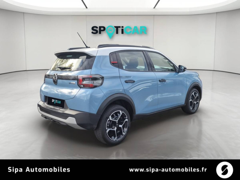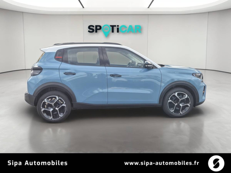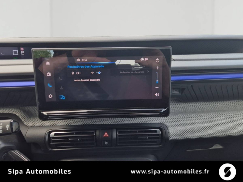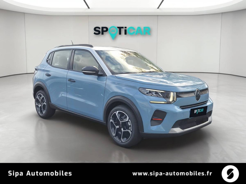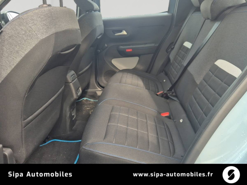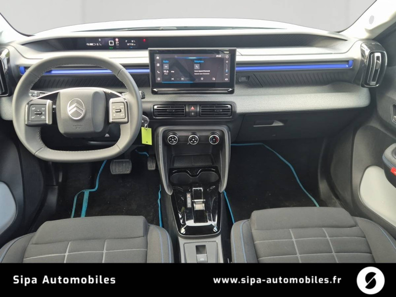 1 prise USB -C sur la planche de bord (charge rapide 3A) / 2 Prises USB type-C (charge rapide 3A) en rang 2 / ABS avec REF, AFU et ESP / Ambiance Urban Grey avec Sièges Advanced Comfort / Avertisseur Sonore Piéton / Barres de toit Noir Brillant / Boîtier télématique: Appel d'urgence et Citroën Assistance les services Connect ONE pendant une période de 10 ans / Câble de charge Mode 3 (Wall Box) pour prise de charge T2 / Chargeur embarqué 7.4 kW monophasé / Citroën Head up Display (affichage tête haute) - TFT / Console centrale haute avec accoudoir et rangement fermé / Décors extérieurs Noir Brillant / Détection de sous-gonflage / Ecran central 10,25 " tactile: Apple CarPlay et Android Auto sans fil Système audio 6 HPs (DAB) / Elargisseurs d'ailes Noir Mat / Enjoliveurs 17" AZURITE / Essuie-vitre AV automatique (capteur de pluie) / Frein de stationnement électrique / Garnissage Tissu Noir / Tissu Asphalt avec Sièges Advanced Comfort. Comprend les décors sur les panneaux de portes AV/ AR et sur la planche de bord Ultra Blue, le siège conducteur réglable en hauteur, les appui-têtes AV réglables en hauteur, les accoudoirs de porte AV et AR recouverts de textile moussé avec étiquettes « Happy Tags » (messages positifs), et des poches aumônières au dos des sièges AV / Lève-vitres AV électriques (descente séquentielle) / Pack Safety - Active Safety Brake (Freinage automatique d'urgence) - Alerte active de Franchissement Involontaire de Ligne - Alerte Attention Conducteur - Reconnaissance des panneaux de signalisation - Régulateur-limiteur de vitesse / Poignées de portes extérieures Noir Brillant / Recharge rapide en courant continu de 100 kW (borne publique) / Sabots de protection AV et AR / Services Connect PLUS pendant 12 mois / Station d'accueil Smartphone Radio via smartphone (avec application My Citroën Play), 2 HP en rang 1, Commande de la radio sur le volant / Suspension Citroën Advanced Comfort / Témoin de non-bouclage des ceintures de sécurité conducteur et passagers