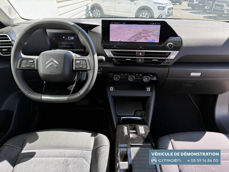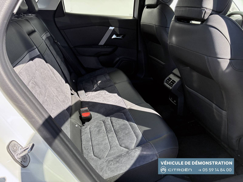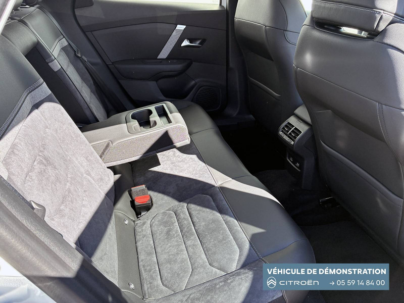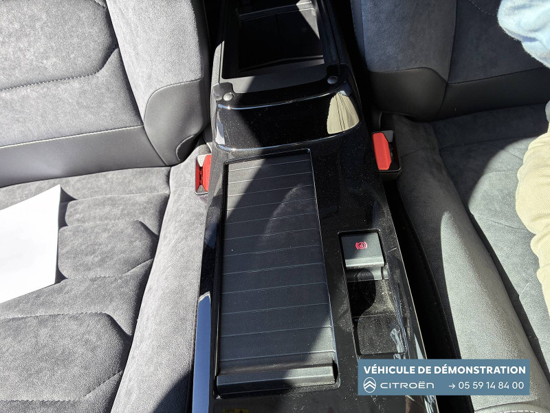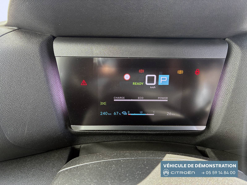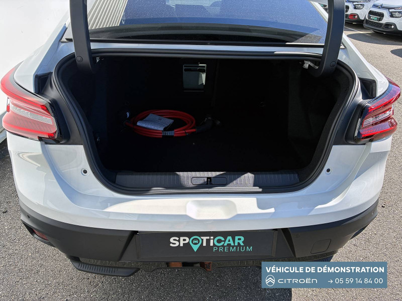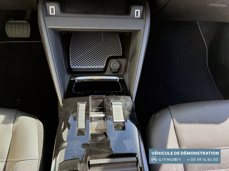 2 prises USB au rang 1 (1 type C + 1 type A) / 2 prises USB au rang 2 (1 type C + 1 type A) / ABS avec REF, AFU et ESP / Aérateurs centraux en rang 2 / Avertisseur sonore piéton / Câble de recharge Mode 3 triphasé 3x32A pour prise de charge T2, longueur 6 mètres / Chargeur embarqué 7.4 kW monophasé / Combiné numérique couleur avec rétro-éclairage / Commutation automatique des feux de route / Console centrale haute avec rangements et accoudoir / Décor Bleu sur les panneaux intérieurs de porte / Détection de sous-gonflage / Eclairage d'accompagnement sous les rétroviseurs extérieurs / Elargisseurs d'aile et bas de caisse Noir Mat / e-Solutions Charging / Essuie-vitre AV automatique (capteur de pluie) / Frein de stationnement électrique automatique / Garnissage textile effet cuir Noir/Tissu Gris Ambiance Metropolitan Grey + Sièges Advanced Comfort / Jantes alliage 18" CROSSLIGHT Diamantées / Jupe AR Noir Brilliant / Kit de dépannage provisoire de pneumatiques / My Citroën Assist: Citroën Connect Box avec Pack SOS et assistance inclus / My Citroën Drive Plus: navigation sur tablette tactile 10'' comprend le système de navigation 3D TomTom, la reconnaissance vocale avec langage naturel, l'interface personnalisable, et durant 3 ans les services My Citroën Drive Plus (inclut les services «Zones de danger», «Info Trafic», «Stations-service», «Parkings, «Météo» et «Recherche locale») / My Citroën Play - Mirror Screen sans fils, compatible Android Auto et Apple CarPlay, Système audio numérique (DAB) MP3 6 HP,Tablette tactile 10" / Pack Color Anodised Blue / Pack Drive Assist Aide au stationnement AV et latéral, Commutation automatique des feux de route, Régulateur de vitesse adaptatif avec fonction Stop & Go,Système de surveillance d'angle mort / Pack Safety 2 / Pack Safety - Active Safety Brake - Alerte active de Franchissement Involontaire de Ligne - Alerte Attention Conducteur - Alerte Risque Collision - Coffee Break Alert - Reconnaissance des panneaux de vitesse et recommandation - Régulateur-limiteur de vitesse - Témoin de non-bouclage des ceintures de sécurité conducteur et passagers / Poche aumônière au dos des sièges AV / Poignées de portes extérieures couleur caisse / Préconditionnement thermique / Prise 12 V en rang 1 / Projecteurs antibrouillard LED avec éclairage statique d'intersection / Projecteurs LED avec signature lumineuse en V / Rétroviseur intérieur électrochrome / Siège conducteur avec réglage lombaire / Sièges Advanced Comfort / Smart Pad Support Citroen / Suspension Citroën Advanced Comfort / Tiroir de planche de bord / Top Rear Vision (caméra de recul avec visualisation 180° sur tablette) / Volant chauffant / Volant cuir pleine fleur