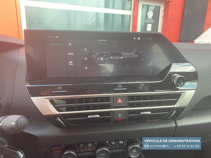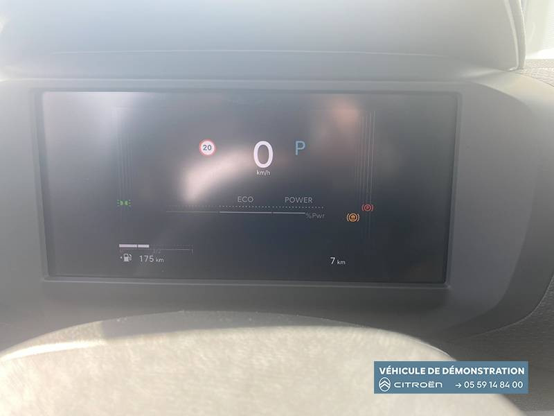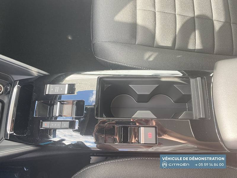 2 prises USB au rang 1 (1 type C + 1 type A) + 1 prise USB en rang 2 (type A) / ABS + AFU + ESP + REF / Accoudoir en Tissu Brasilia - Noir Mistral / Aérateurs centraux en rang 2 / Bande de dossiers en Tissu Curitiba Blanc/Noir / Boîte automatique 6 rapports / Clignotants impulsionnels / Color Clips Pure Black Pièce de décor colorée sur les pare-choc. Interchangeables disponibles en accessoire. / Combiné numérique couleur 5.5" TFT / Commandes au volant du système audio et du régulateur-limiteur de vitesse / Condamnation centralisée avec Plip et condamnation automatique du coffre et des portes en roulant / Console centrale haute avec rangements fermés et 2 porte-gobelets et accoudoir coulissant / Décor de panneaux de porte injecté Gris Horizon / Détection de sous-gonflage / Direction à assistance électrique variable / Eclairage d'accueil et d'accompagnement / Ecran central 10" tactile: - Système audio numérique (DAB) 6 HPs - Apple CarPlay et Android Auto sans fil - Reconnaissance vocale - Kit mains libres Bluetooth - Boîtier télématique : Appel d'urgence et Citroën Assistance / Elargisseurs d'aile et bas de caisse Noir Mat / Enjoliveurs 18" AEROTECH / Essuie-vitre AV automatique (capteur de pluie) / Feux AR à LED avec signature lumineuse / Feux diurnes à LED avec signature lumineuse / Fixations ISOFIX sur sièges latéraux AR (3 points d'encrage avec Top TetherTether) / Frein de stationnement électrique automatique / Garnissage Tissu Hello Noir/Toile enduite Gris Ambiance Urban Grey + Sièges Advanced Comfort / Jupe AR Noir Brilliant / Kit de dépannage provisoire de pneumatiques / Lécheurs de vitres latérales Noir / Médaillons de porte AV en Tissu Brasilia - Noir Mistral / Pack Safety - Active Safety Brake (fonctionne de 30 à 80 km/h et détecte les piétons et les cyclistes) - Alerte active de Franchissement Involontaire de Ligne - Alerte Attention Conducteur - Alerte Risque Collision - Allumage automatique des feux de croisement - Coffee Break Alert - Reconnaissance des panneaux de vitesse et recommandation - Régulateur-limiteur de vitesse - Témoin de non-bouclage des ceintures de sécurité conducteur et passagers / Pare-soleil avec miroir occultable côtés conducteur et passager / Plafonniers AV et AR à lampes / Poche aumônière au dos des sièges AV / Poignées de portes extérieures couleur caisse / Sabot AV Gris Mercury Satin / Sécurité enfants mécanique / Siège conducteur avec réglage lombaire / Suspension Citroën Advanced Comfort / TCS (Contrôle de la traction)