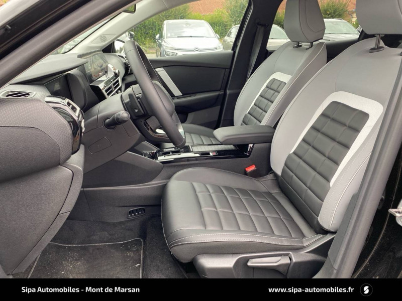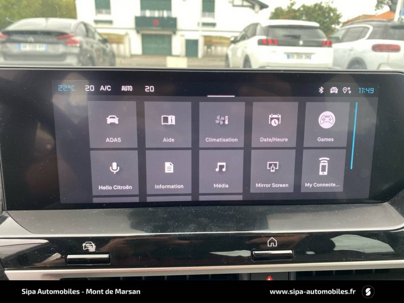 2 prises USB au rang 1 (1 type C + 1 type A) + 1 prise USB en rang 2 (type A) / ABS + AFU + ESP + REF / Accès et démarrage mains libres Proximity / Aérateurs centraux en rang 2 / Boîte automatique 6 rapports / Color Clips Gold Satin / Console centrale haute avec rangements et accoudoir / Détection de sous-gonflage / Eclairage d'accompagnement sous les rétroviseurs extérieurs / Ecran central 10" tactile: - Système audio numérique (DAB) 6 HPs - Apple CarPlay et Android Auto sans fil - Reconnaissance vocale - Kit mains libres Bluetooth - Boîtier télématique : Appel d'urgence et Citroën Assistance / Elargisseurs d'aile et bas de caisse Noir Mat / Feux AR à LED avec signature lumineuse / Feux diurnes à LED avec signature lumineuse / Frein de stationnement électrique automatique / Garnissage Toile enduite Noir/Toile enduite Gris Clair Ambiance Metropolitan Grey + Sièges Advanced Comfort / Jantes alliage 18" AMBER Diamantées / Kit de dépannage provisoire de pneumatiques / Lécheurs de vitres latérales Noir / Pack Drive Assist - Active Safety Brake 2.0 (fonctionne à l'aide d'un radar de 7 à 140 km/h, y compris de nuit) - Commutation automatique des feux de route - Reconnaissance étendue des panneaux et recommandation de vitesse - Régulateur de vitesse adaptatif avec fonction Stop & Go (dispositif ajustant la vitesse en fonction du véhicule précédent) - Système de surveillance d'angle mort / Pack Navigation Connectée - Navigation 3D Connectée sur écran central 10'' tactile - Combiné numérique couleur 7'' TFT - Fonction Top Rear Vision de la caméra de recul - Interface personnalisable avec Widgets - Reconnaissance vocale avec langage naturel / Pack Safety - Active Safety Brake (fonctionne de 30 à 80 km/h et détecte les piétons et les cyclistes) - Alerte active de Franchissement Involontaire de Ligne - Alerte Attention Conducteur - Alerte Risque Collision - Allumage automatique des feux de croisement - Coffee Break Alert - Reconnaissance des panneaux de vitesse et recommandation - Régulateur-limiteur de vitesse - Témoin de non-bouclage des ceintures de sécurité conducteur et passagers / Plancher de coffre à 2 positions / Poche aumônière au dos des sièges AV / Poignées de portes extérieures couleur caisse / Rétroviseur intérieur électrochrome / Sabot AV Silver Chrome Satin / Services Connect PLUS Gratuit pendant une période d'essai de 12 mois / Siège conducteur avec réglage lombaire / Surtapis AV et AR / Suspension Citroën Advanced Comfort / TCS (Contrôle de la traction) / Volant cuir pleine fleur
