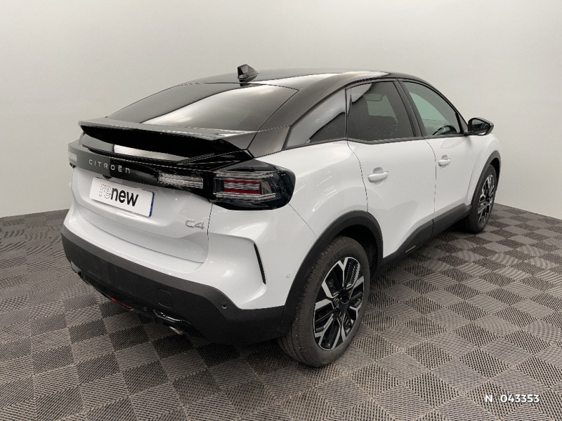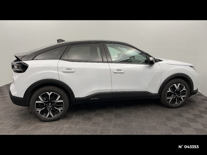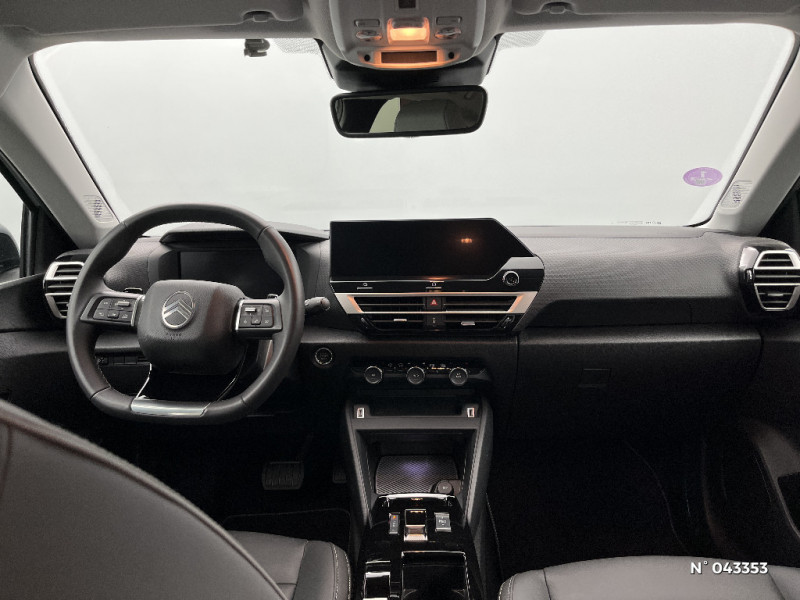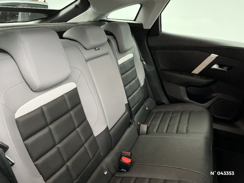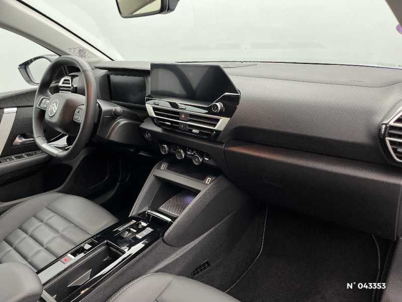 Jupe AR Noir Brilliant / Accès et démarrage mains libres Proximity / Plancher de coffre à 2 positions / Aérateurs centraux en rang 2 / ABS + AFU + ESP + REF / Poche aumonière au dos des sièges AV / Suspension Citroën Advanced Comfort / Direction à assistance électrique variable / Siège conducteur avec réglage lombaire / Eclairage d'accueil et d'accompagnement / Pare-soleil avec miroir occultable côtés conducteur et passager / Eclairage d'accompagnement sous les rétroviseurs extérieurs / Services Connect PLUS Gratuit pendant une période d'essai de 12 mois / 2 Prises USB au rang 1 (1 type A + 1 type C pour fonction Mirror Screen) + 1 Prise USB au rang 2 (type A) / Ecran central 10" tactile: - Système audio numérique (DAB) 6 HPs - Apple CarPlay et Android Auto sans fil - Reconnaissance vocale - Kit mains libres Bluetooth - Boîtier télématique : Appel d'urgence et Citroën Assistance / Sabot AV Silver Chrome Satin / Accoudoir central AR avec porte-gobelets et trappe à skis / Condamnation centralisée avec Plip et condamnation automatique du coffre et des portes en roulant / Console centrale haute avec rangements fermés et 2 porte-gobelets et accoudoir coulissant / Volant cuir pleine fleur / Surtapis AV et AR / Fixations ISOFIX sur sièges latéraux AR (3 points d'encrage avec Top TetherTether) / Plafonniers AV et AR à lampes / Commandes au volant du système audio et du régulateur-limiteur de vitesse / Jantes alliage 18" AMBER Diamantées / Feux diurnes à LED avec signature lumineuse / Feux AR à LED avec signature lumineuse / Pack Safety - Active Safety Brake (fonctionne de 30 à 80 km/h et détecte les piétons et les cyclistes) - Alerte active de Franchissement Involontaire de Ligne - Alerte Attention Conducteur - Alerte Risque Collision - Allumage automatique des feux de croisement - Coffee Break Alert - Reconnaissance des panneaux de vitesse et recommandation - Régulateur-limiteur de vitesse - Témoin de non-bouclage des ceintures de sécurité conducteur et passagers / Pack Drive Assist - Active Safety Brake 2.0 (fonctionne à l'aide d'un radar de 7 à 140 km/h, y compris de nuit) - Commutation automatique des feux de route - Reconnaissance étendue des panneaux et recommandation de vitesse - Régulateur de vitesse adaptatif avec fonction Stop & Go (dispositif ajustant la vitesse en fonction du véhicule précédent) - Système de surveillance d'angle mort / Pack Navigation Connectée - Navigation 3D Connectée sur écran central 10'' tactile - Combiné numérique couleur 7'' TFT - Fonction Top Rear Vision de la caméra de recul / Garnissage Toile enduite Noir/Toile enduite Gris Clair Ambiance Metropolitan Grey + Sièges Advanced Comfort / Color Clips Gold Satin / Décor de panneaux de porte en Tissu Curitiba Blanc Sonic / Bande de dossiers en Tissu Curitiba Blanc Sonic / Médaillons de porte AV en Tissu Brasilia - Noir Mistral / Lécheurs de vitres latérales Noir / Rétroviseur intérieur électrochrome / Boîte automatique 6 rapports / 2 prises USB au rang 1 (1 type C + 1 type A) + 1 prise USB en rang 2 (type A) / Pack Navigation Connectée - Navigation 3D Connectée sur écran central 10'' tactile - Combiné numérique couleur 7'' TFT - Fonction Top Rear Vision de la caméra de recul - Interface personnalisable avec Widgets - Reconnaissance vocale avec langage naturel / TCS (Contrôle de la traction) / Frein de stationnement électrique automatique / Poignées de portes extérieures couleur caisse / Kit de dépannage provisoire de pneumatiques / Détection de sous-gonflage / Elargisseurs d'aile et bas de caisse Noir Mat / Sécurité enfants mécanique / Clignotants impulsionnels
