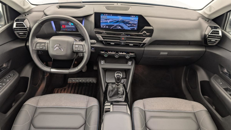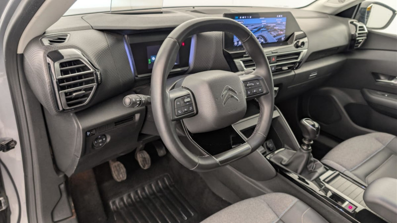 Détection de sous-gonflage / ABS avec REF, AFU et ESP / Volant cuir pleine fleur / Pack Safety - Active Safety Brake - Alerte active de Franchissement Involontaire de Ligne - Alerte Attention Conducteur - Alerte Risque Collision - Coffee Break Alert - Reconnaissance des panneaux de vitesse et recommandation - Régulateur-limiteur de vitesse - Témoin de non-bouclage des ceintures de sécurité conducteur et passagers : Régulateur-limiteur de vitesse Coffee Break Alert Alerte attention conducteur Alerte Risque Collision Reconnaissance des panneaux de vitesse Témoin de non-bouclage des ceintures de sécurité conducteur et passagers Alerte active de Franchissement Involontaire de ligne Active Safety Brake / Console centrale haute avec rangements et accoudoir / Système audio numérique (DAB) MP3 6 HP / Pack Drive Assist Aide au stationnement AV et latéral, Commutation automatique des feux de route, Régulateur de vitesse adaptatif avec fonction Stop & Go,Système de surveillance d'angle mort : Système de surveillance d'angle mort Aide au stationnement AV Aide au stationnement latéral / Pack Safety 2 : Reconnaissance étendue des panneaux Active Safety Brake 2.0 / Plancher de coffre à 2 positions / Projecteurs antibrouillard LED avec éclairage statique d'intersection / Tiroir de planche de bord / Combiné numérique couleur avec rétro-éclairage / Garnissage textile effet cuir Noir/Tissu Gris Ambiance Metropolitan Grey + Sièges Advanced Comfort / Prise 12 V en rang 1 / 2 prises USB au rang 1 (1 type C + 1 type A) / Suspension Citroën Advanced Comfort / Sièges Advanced Comfort / My Citroën Play - Mirror Screen sans fils, compatible Android Auto et Apple CarPlay, Système audio numérique (DAB) MP3 6 HP,Tablette tactile 10" / Pack Style : Jonc chromé sur les lécheurs de vitres latérales Vitres et lunette AR surteintées / Commutation automatique des feux de route / Jantes alliage 18" AEROBLADE Diamantées / Pack Color Glossy Silver : Inserts autour des projecteurs antibrouillard et sur les protections de bas de caisse / Rétroviseur intérieur électrochrome / My Citroën Drive Plus: navigation sur tablette tactile 10'' comprend le système de navigation 3D TomTom, la reconnaissance vocale avec langage naturel, l'interface personnalisable / Siège conducteur avec réglage lombaire et accoudoir / Essuie-vitre AV automatique (capteur de pluie) / Frein de stationnement électrique automatique / Poignées de portes extérieures couleur caisse / Kit de dépannage provisoire de pneumatiques / / Véhicules équivalents: 308 - Mégane - Golf