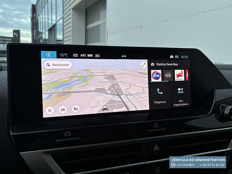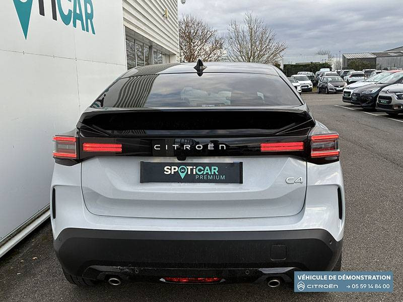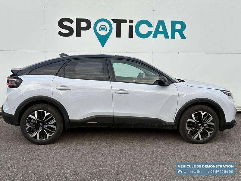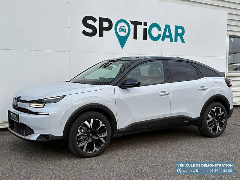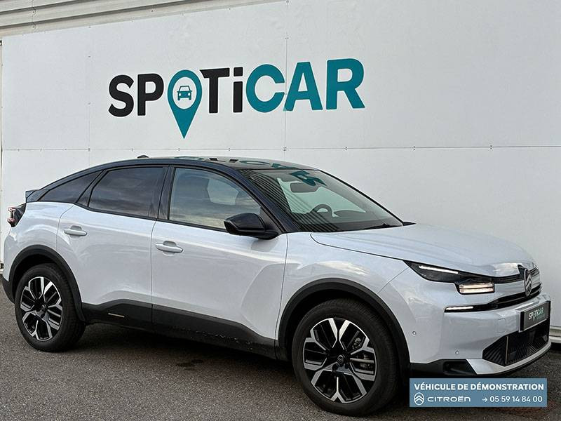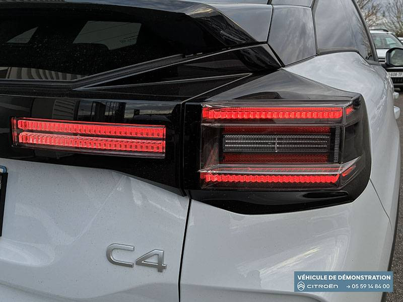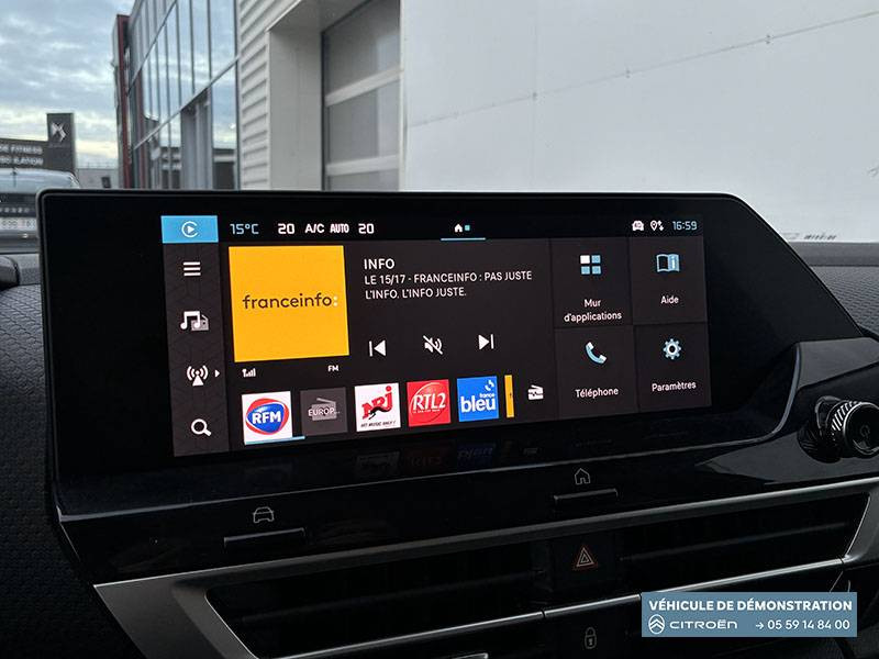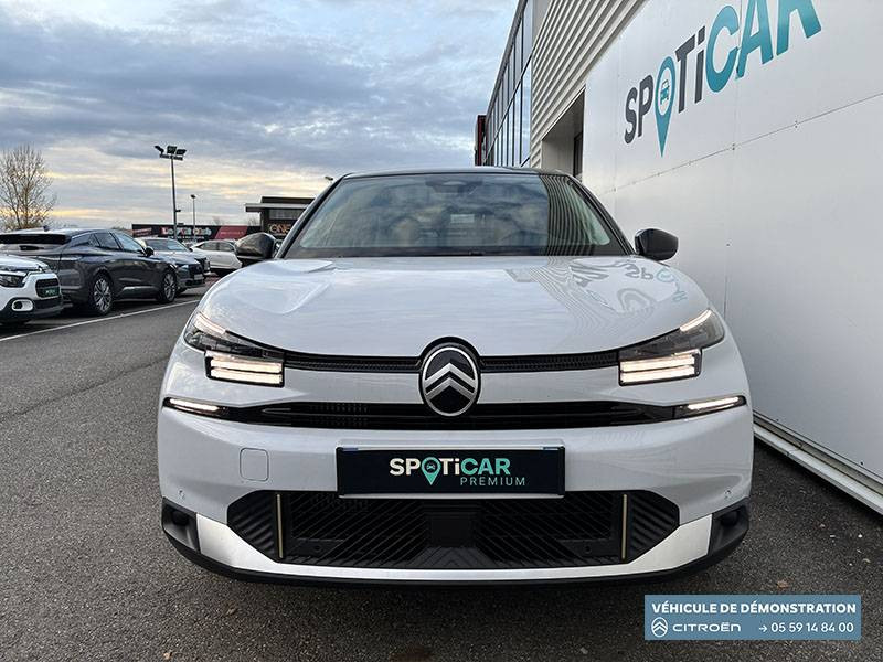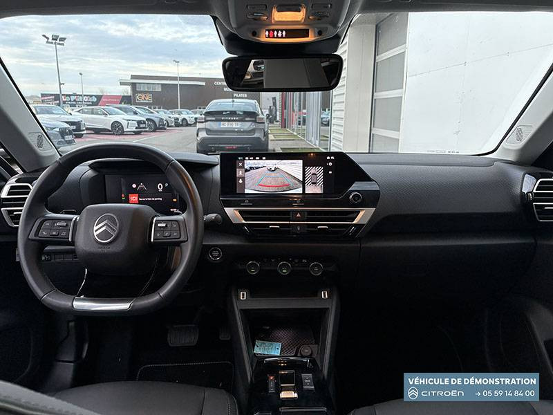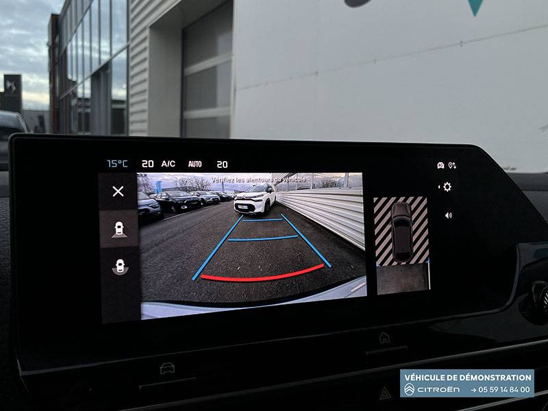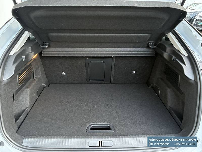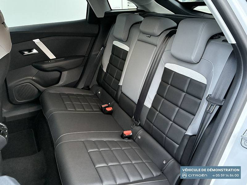 2 prises USB au rang 1 (1 type C + 1 type A) + 1 prise USB en rang 2 (type A) / ABS + AFU + ESP + REF / Accès et démarrage mains libres Proximity 2 Télécommandes 3 boutons (verrouillage, coffre et déverrouillage). / Accoudoir central AR avec porte-gobelets et trappe à skis / Aérateurs centraux en rang 2 / Bande de dossiers en Tissu Curitiba Blanc Sonic / Boîte automatique 6 rapports / Clignotants impulsionnels / Color Clips Gold Satin / Commandes au volant du système audio et du régulateur-limiteur de vitesse / Condamnation centralisée avec Plip et condamnation automatique du coffre et des portes en roulant / Console centrale haute avec rangements fermés et 2 porte-gobelets et accoudoir coulissant / Décor de panneaux de porte en Tissu Curitiba Blanc Sonic / Détection de sous-gonflage / Direction à assistance électrique variable / Eclairage d'accompagnement sous les rétroviseurs extérieurs / Eclairage d'accueil et d'accompagnement / Ecran central 10" tactile: - Système audio numérique (DAB) 6 HPs - Apple CarPlay et Android Auto sans fil - Reconnaissance vocale - Kit mains libres Bluetooth - Boîtier télématique : Appel d'urgence et Citroën Assistance / Elargisseurs d'aile et bas de caisse Noir Mat / Essuie-vitre AV automatique (capteur de pluie) / Feux AR à LED avec signature lumineuse / Feux diurnes à LED avec signature lumineuse / Fixations ISOFIX sur sièges latéraux AR (3 points d'encrage avec Top TetherTether) / Frein de stationnement électrique automatique / Garnissage Toile enduite Noir/Toile enduite Gris Clair Ambiance Metropolitan Grey + Sièges Advanced Comfort / Jantes alliage 18" AMBER Diamantées / Jupe AR Noir Brilliant / Kit de dépannage provisoire de pneumatiques / Lécheurs de vitres latérales Noir / Médaillons de porte AV en Tissu Brasilia - Noir Mistral / Pack Drive Assist - Active Safety Brake 2.0 (fonctionne à l'aide d'un radar de 7 à 140 km/h, y compris de nuit) - Commutation automatique des feux de route - Reconnaissance étendue des panneaux et recommandation de vitesse - Régulateur de vitesse adaptatif avec fonction Stop & Go (dispositif ajustant la vitesse en fonction du véhicule précédent) - Système de surveillance d'angle mort / Pack Navigation Connectée - Navigation 3D Connectée sur écran central 10'' tactile - Combiné numérique couleur 7'' TFT - Fonction Top Rear Vision de la caméra de recul - Interface personnalisable avec Widgets - Reconnaissance vocale avec langage naturel / Pack Safety - Active Safety Brake (fonctionne de 30 à 80 km/h et détecte les piétons et les cyclistes) - Alerte active de Franchissement Involontaire de Ligne - Alerte Attention Conducteur - Alerte Risque Collision - Allumage automatique des feux de croisement - Coffee Break Alert - Reconnaissance des panneaux de vitesse et recommandation - Régulateur-limiteur de vitesse - Témoin de non-bouclage des ceintures de sécurité conducteur et passagers / Pare-soleil avec miroir occultable côtés conducteur et passager / Plafonniers AV et AR à lampes / Plancher de coffre à 2 positions / Poche aumônière au dos des sièges AV / Poignées de portes extérieures couleur caisse / Rétroviseur intérieur électrochrome / Sabot AV Silver Chrome Satin / Sécurité enfants mécanique / Services Connect PLUS Gratuit pendant une période d'essai de 12 mois / Siège conducteur avec réglage lombaire / Surtapis AV et AR / Suspension Citroën Advanced Comfort / TCS (Contrôle de la traction) / Volant cuir pleine fleur