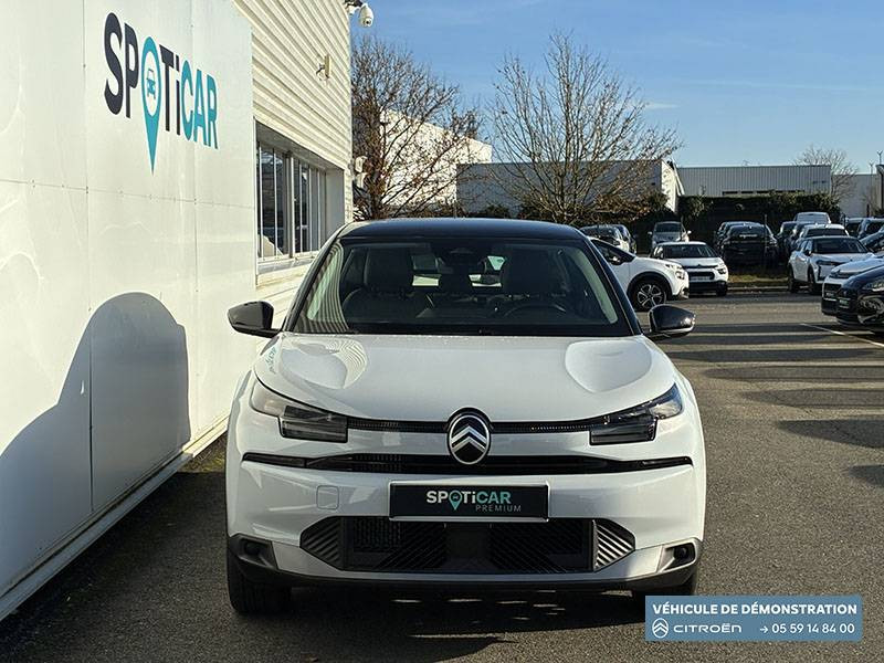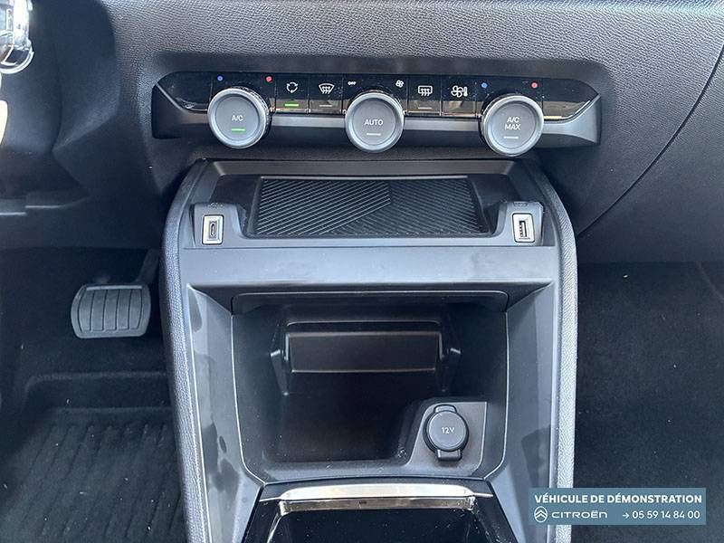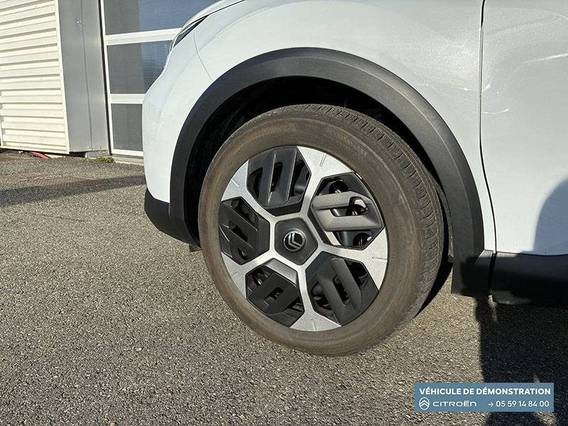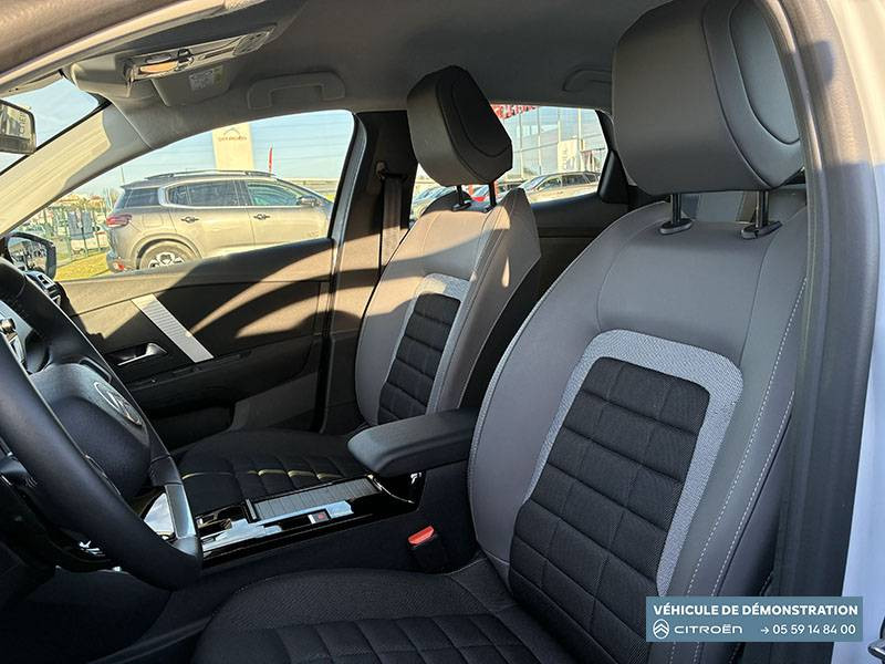 2 prises USB au rang 1 (1 type C + 1 type A) + 1 prise USB en rang 2 (type A) / ABS + AFU + ESP + REF / Accoudoir en Tissu Brasilia - Noir Mistral / Aérateurs centraux en rang 2 / Bande de dossiers en Tissu Curitiba Blanc/Noir / Boîte automatique 6 rapports / Clignotants impulsionnels / Color Clips Pure Black Pièce de décor colorée sur les pare-choc. Interchangeables disponibles en accessoire. / Combiné numérique couleur 5.5" TFT / Commandes au volant du système audio et du régulateur-limiteur de vitesse / Condamnation centralisée avec Plip et condamnation automatique du coffre et des portes en roulant / Console centrale haute avec rangements fermés et 2 porte-gobelets et accoudoir coulissant / Décor de panneaux de porte injecté Gris Horizon / Détection de sous-gonflage / Direction à assistance électrique variable / Eclairage d'accueil et d'accompagnement / Ecran central 10" tactile: - Système audio numérique (DAB) 6 HPs - Apple CarPlay et Android Auto sans fil - Reconnaissance vocale - Kit mains libres Bluetooth - Boîtier télématique : Appel d'urgence et Citroën Assistance / Elargisseurs d'aile et bas de caisse Noir Mat / Enjoliveurs 18" AEROTECH / Essuie-vitre AV automatique (capteur de pluie) / Feux AR à LED avec signature lumineuse / Feux diurnes à LED avec signature lumineuse / Fixations ISOFIX sur sièges latéraux AR (3 points d'encrage avec Top TetherTether) / Frein de stationnement électrique automatique / Garnissage Tissu Hello Noir/Toile enduite Gris Ambiance Urban Grey + Sièges Advanced Comfort / Jupe AR Noir Brilliant / Kit de dépannage provisoire de pneumatiques / Lécheurs de vitres latérales Noir / Médaillons de porte AV en Tissu Brasilia - Noir Mistral / Pack Safety - Active Safety Brake (fonctionne de 30 à 80 km/h et détecte les piétons et les cyclistes) - Alerte active de Franchissement Involontaire de Ligne - Alerte Attention Conducteur - Alerte Risque Collision - Allumage automatique des feux de croisement - Coffee Break Alert - Reconnaissance des panneaux de vitesse et recommandation - Régulateur-limiteur de vitesse - Témoin de non-bouclage des ceintures de sécurité conducteur et passagers / Pare-soleil avec miroir occultable côtés conducteur et passager / Plafonniers AV et AR à lampes / Poche aumônière au dos des sièges AV / Poignées de portes extérieures couleur caisse / Sabot AV Gris Mercury Satin / Sécurité enfants mécanique / Siège conducteur avec réglage lombaire / Suspension Citroën Advanced Comfort / TCS (Contrôle de la traction)