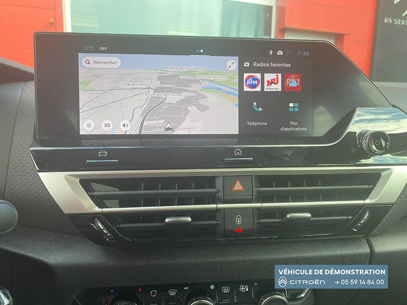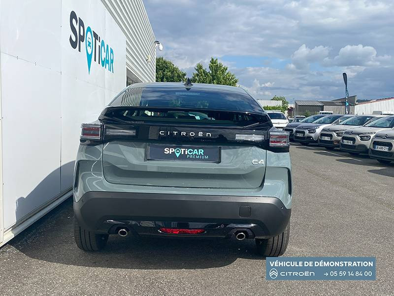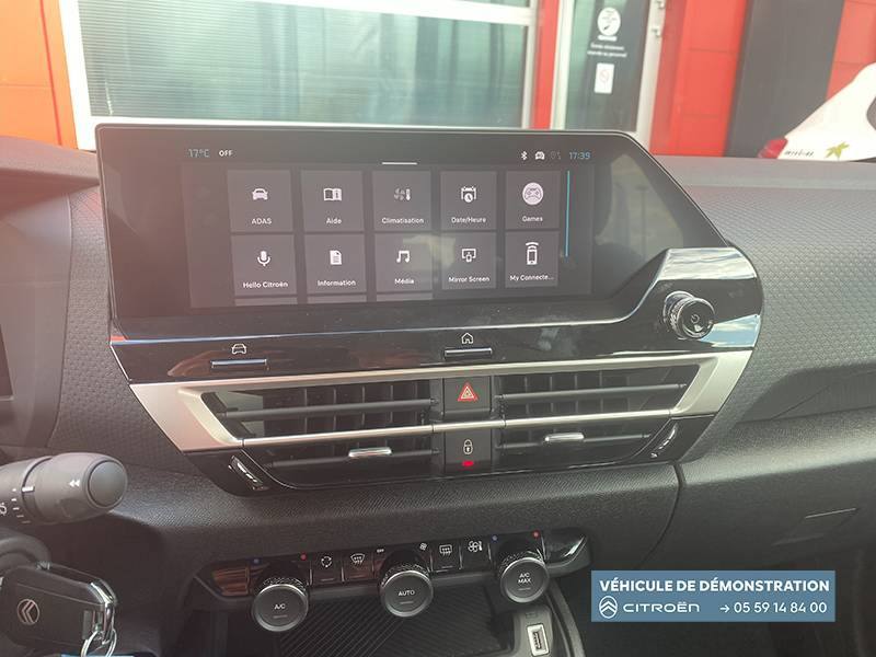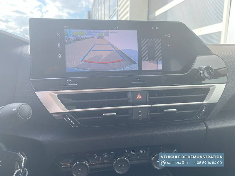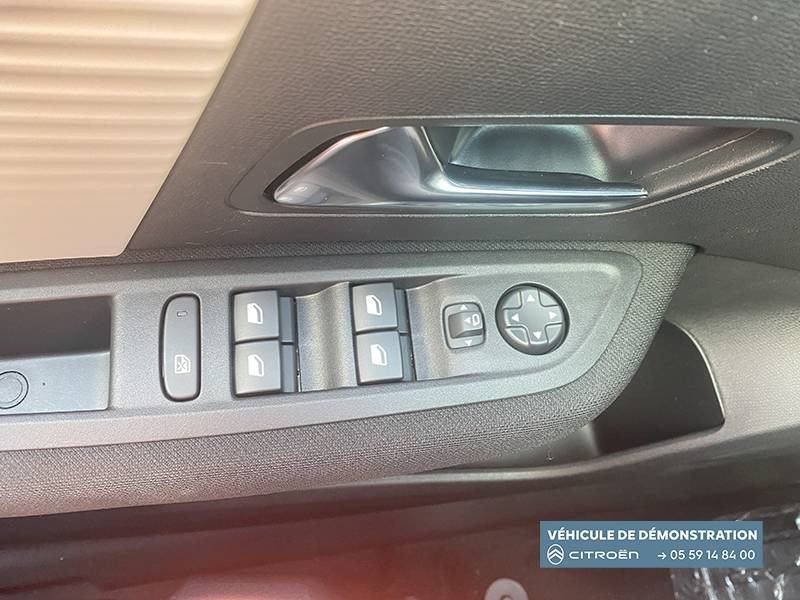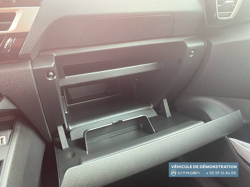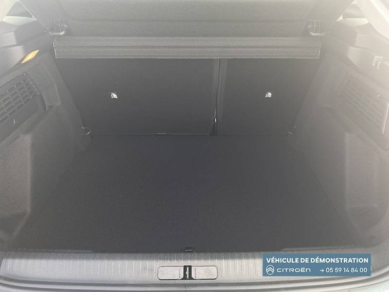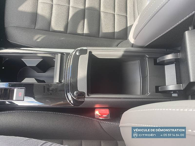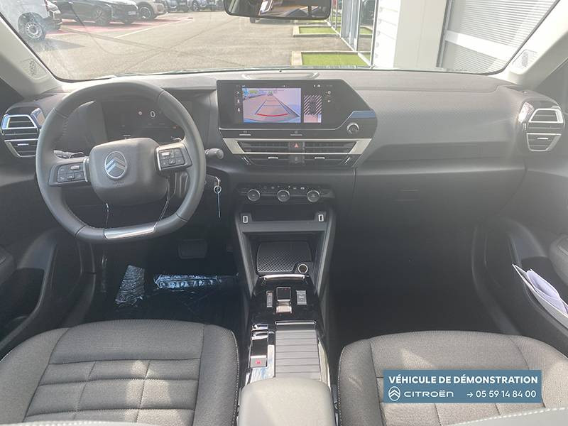 2 prises USB au rang 1 (1 type C + 1 type A) + 1 prise USB en rang 2 (type A) / ABS + AFU + ESP + REF / Accoudoir en Tissu Brasilia - Noir Mistral / Aérateurs centraux en rang 2 / Bande de dossiers en Tissu Curitiba Blanc/Noir / Boîte automatique 6 rapports / Clignotants impulsionnels / Color Clips Pure Black Pièce de décor colorée sur les pare-choc. Interchangeables disponibles en accessoire. / Combiné numérique couleur 5.5" TFT / Commandes au volant du système audio et du régulateur-limiteur de vitesse / Condamnation centralisée avec Plip et condamnation automatique du coffre et des portes en roulant / Console centrale haute avec rangements fermés et 2 porte-gobelets et accoudoir coulissant / Décor de panneaux de porte injecté Gris Horizon / Détection de sous-gonflage / Direction à assistance électrique variable / Eclairage d'accueil et d'accompagnement / Ecran central 10" tactile: - Système audio numérique (DAB) 6 HPs - Apple CarPlay et Android Auto sans fil - Reconnaissance vocale - Kit mains libres Bluetooth - Boîtier télématique : Appel d'urgence et Citroën Assistance / Elargisseurs d'aile et bas de caisse Noir Mat / Enjoliveurs 18" AEROTECH / Essuie-vitre AV automatique (capteur de pluie) / Feux AR à LED avec signature lumineuse / Feux diurnes à LED avec signature lumineuse / Fixations ISOFIX sur sièges latéraux AR (3 points d'encrage avec Top TetherTether) / Frein de stationnement électrique automatique / Garnissage Tissu Hello Noir/Toile enduite Gris Ambiance Urban Grey + Sièges Advanced Comfort / Jupe AR Noir Brilliant / Kit de dépannage provisoire de pneumatiques / Lécheurs de vitres latérales Noir / Médaillons de porte AV en Tissu Brasilia - Noir Mistral / Pack Safety - Active Safety Brake (fonctionne de 30 à 80 km/h et détecte les piétons et les cyclistes) - Alerte active de Franchissement Involontaire de Ligne - Alerte Attention Conducteur - Alerte Risque Collision - Allumage automatique des feux de croisement - Coffee Break Alert - Reconnaissance des panneaux de vitesse et recommandation - Régulateur-limiteur de vitesse - Témoin de non-bouclage des ceintures de sécurité conducteur et passagers / Pare-soleil avec miroir occultable côtés conducteur et passager / Plafonniers AV et AR à lampes / Poche aumônière au dos des sièges AV / Poignées de portes extérieures couleur caisse / Sabot AV Gris Mercury Satin / Sécurité enfants mécanique / Siège conducteur avec réglage lombaire / Suspension Citroën Advanced Comfort / TCS (Contrôle de la traction)