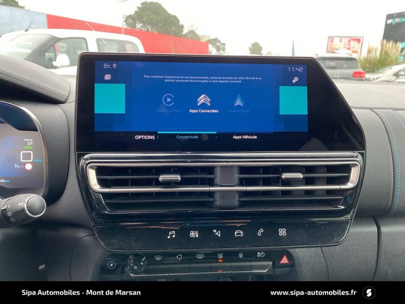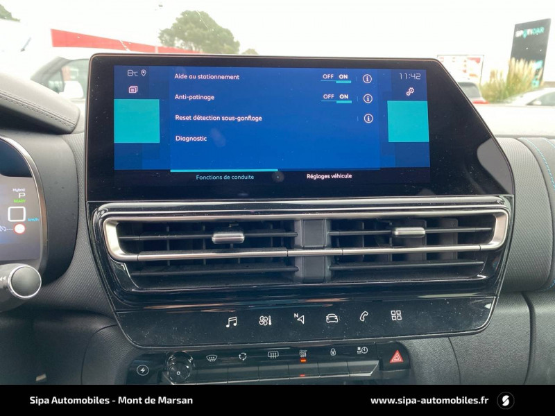3 sièges AR indépendants, coulissants, inclinables et escamotables / ABS + AFU + ESP + REF / Accès et démarrage mains libres / Aide au stationnement AV + Caméra de recul avec Top Rear Vision Comprend les Projecteurs antibrouillard avec éclairage statique d'intersection. / Câble de recharge Mode 2, prise de charge T2/EF, longueur 6 mètres / Calandre supérieure Noir Brillant / Chargeur embarqué 3,7 kW / Combiné numérique 12,3" personnalisable / Détection de sous-gonflage / Elargisseurs d'aile et bas de caisse Noir Mat / Enjoliveurs de contour de vitres latérales chromés / Essuie-vitres AV automatique Magic Wash / Feux diurnes à LED avec clignotants à LED / Frein de stationnement électrique automatique / Garnissage Tissu SAO Noir/Tissu effet cuir Gris/Ambiance Wild Black avec Sièges Advanced Comfort / Inserts colorés Noir Brillant sur Airbump et bouclier AV / Jantes alliage 18" PULSAR Diamantées bi-ton / Kit de dépannage provisoire des pneumatiques / My Citroën Assist : Citroën Connect Box avec Pack SOS et assistance inclus / My Citroën Drive avec écran tactile 10" Comprend le système de navigation TomTom, la reconnaissance vocale et durant 3 ans les services Connect Nav / My Citroën Play Hybrid avec tablette tactile 10" / Pack Safety + / Pack Safety - Active Safety Brake - Alerte active de Franchissement Involontaire de Ligne - Alerte Attention Conducteur - Alerte Risque Collision - Coffee Break Alert - Reconnaissance des panneaux de vitesse et recommandation - Régulateur-limiteur de vitesse - Témoin de non-bouclage des ceintures de sécurité conducteur et passagers / Pare-chocs AR avec double canule chromée / Personnalisation extérieure C-Series : badges C-Series sur les ailes AV, inserts sur les Airbump et inserts sur le bouclier AV Bronze Anodisé. / Prises 12 V sur la console centrale et dans le coffre / Projecteurs antibrouillard avec éclairage statique d'intersection / Rétroviseur intérieur électrochrome / Sabots de protection Aluminium Brillant / Siège conducteur avec réglage lombaire / Sièges Advanced Comfort / Suspension Citroën Advanced Comfort / Vitres latérales AV feuilletées et acoustiques
