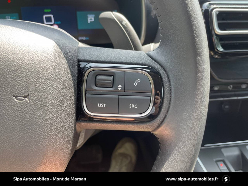 3 sièges AR indépendants, coulissants, inclinables et escamotables / ABS + AFU + ESP + REF / Accès et démarrage mains libres / Aide au stationnement AV + Caméra de recul avec Top Rear Vision Comprend les Projecteurs antibrouillard avec éclairage statique d'intersection. / Câble de recharge Mode 2, prise de charge T2/EF, longueur 6 mètres / Calandre supérieure Noir Brillant / Chargeur embarqué 3,7 kW / Combiné numérique 12,3" personnalisable / Détection de sous-gonflage / Elargisseurs d'aile et bas de caisse Noir Mat / Enjoliveurs de contour de vitres latérales chromés / Essuie-vitres AV automatique Magic Wash / Feux diurnes à LED avec clignotants à LED / Frein de stationnement électrique automatique / Garnissage Tissu SAO Noir/Tissu effet cuir Gris/Ambiance Wild Black avec Sièges Advanced Comfort / Inserts colorés Noir Brillant sur Airbump et bouclier AV / Jantes alliage 18" PULSAR Diamantées bi-ton / Kit de dépannage provisoire des pneumatiques / My Citroën Assist : Citroën Connect Box avec Pack SOS et assistance inclus / My Citroën Drive avec écran tactile 10" Comprend le système de navigation TomTom, la reconnaissance vocale et durant 3 ans les services Connect Nav / My Citroën Play Hybrid avec tablette tactile 10" / Pack Safety + / Pack Safety - Active Safety Brake - Alerte active de Franchissement Involontaire de Ligne - Alerte Attention Conducteur - Alerte Risque Collision - Coffee Break Alert - Reconnaissance des panneaux de vitesse et recommandation - Régulateur-limiteur de vitesse - Témoin de non-bouclage des ceintures de sécurité conducteur et passagers / Pare-chocs AR avec double canule chromée / Personnalisation extérieure C-Series : badges C-Series sur les ailes AV, inserts sur les Airbump et inserts sur le bouclier AV Bronze Anodisé. / Prises 12 V sur la console centrale et dans le coffre / Projecteurs antibrouillard avec éclairage statique d'intersection / Rétroviseur intérieur électrochrome / Sabots de protection Aluminium Brillant / Siège conducteur avec réglage lombaire / Sièges Advanced Comfort / Suspension Citroën Advanced Comfort / Vitres latérales AV feuilletées et acoustiques