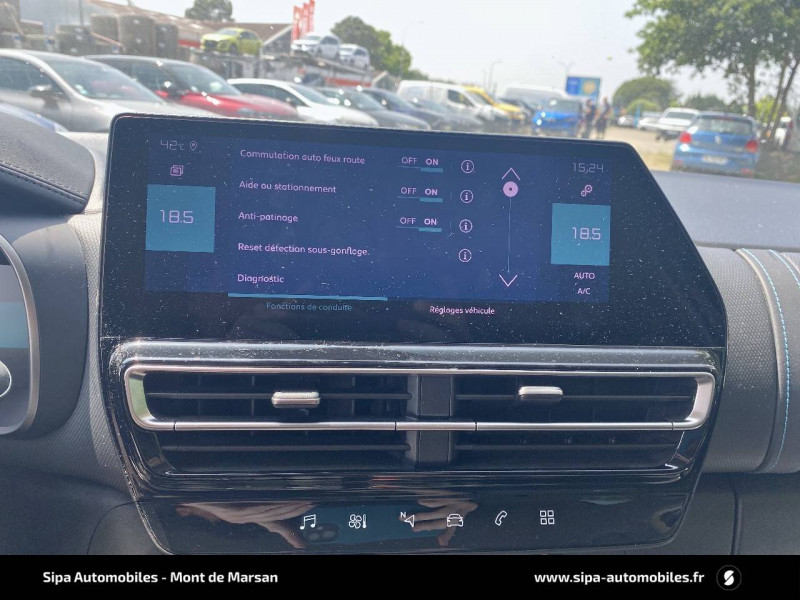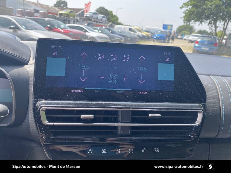 3 sièges AR indépendants, coulissants, inclinables et escamotables / ABS + AFU + ESP + REF / Accès et démarrage mains libres / Aide au stationnement AV + Caméra de recul avec Top Rear Vision Comprend les Projecteurs antibrouillard avec éclairage statique d'intersection. / Câble de recharge Mode 2, prise de charge T2/EF, longueur 6 mètres / Calandre supérieure Noir Brillant / Chargeur embarqué 3,7 kW / Combiné numérique 12,3" personnalisable / Détection de sous-gonflage / Elargisseurs d'aile et bas de caisse Noir Mat / Enjoliveurs de contour de vitres latérales chromés / Essuie-vitres AV automatique Magic Wash / Feux diurnes à LED avec clignotants à LED / Frein de stationnement électrique automatique / Garnissage Tissu SAO Noir/Tissu effet cuir Gris/Ambiance Wild Black avec Sièges Advanced Comfort / Inserts colorés Noir Brillant sur Airbump et bouclier AV / Jantes alliage 18" PULSAR Diamantées bi-ton / Kit de dépannage provisoire des pneumatiques / My Citroën Assist : Citroën Connect Box avec Pack SOS et assistance inclus / My Citroën Drive avec écran tactile 10" Comprend le système de navigation TomTom, la reconnaissance vocale et durant 3 ans les services Connect Nav / My Citroën Play Hybrid avec tablette tactile 10" / Pack Safety + / Pack Safety - Active Safety Brake - Alerte active de Franchissement Involontaire de Ligne - Alerte Attention Conducteur - Alerte Risque Collision - Coffee Break Alert - Reconnaissance des panneaux de vitesse et recommandation - Régulateur-limiteur de vitesse - Témoin de non-bouclage des ceintures de sécurité conducteur et passagers / Pare-chocs AR avec double canule chromée / Personnalisation extérieure C-Series : badges C-Series sur les ailes AV, inserts sur les Airbump et inserts sur le bouclier AV Bronze Anodisé. / Prises 12 V sur la console centrale et dans le coffre / Projecteurs antibrouillard avec éclairage statique d'intersection / Rétroviseur intérieur électrochrome / Sabots de protection Aluminium Brillant / Siège conducteur avec réglage lombaire / Sièges Advanced Comfort / Suspension Citroën Advanced Comfort / Vitres latérales AV feuilletées et acoustiques