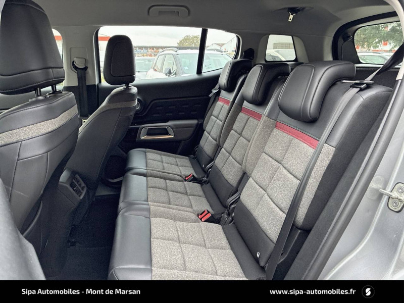3 sièges AR indépendants, coulissants, inclinables et escamotables / ABS + REF / Accès et démarrage mains libres / CITROËN Connect Nav avec Mirror screen + CITROËN Connect Box avec Pack SOS et assistance inclus / Citroën Connect Radio sur tablette tactile 8" / Combiné numérique 12,3" personnalisable / Détection de sous-gonflage / Elargisseurs d'aile et bas de caisse Noir Mat / Enjoliveurs de contour de vitres latérales chromés / ESP et AFU / Essuie-vitres AV automatique Magic Wash / Frein de stationnement électrique automatique / Garnissage Tissu Stone Grey/Tissu effet cuir Noir/Ambiance Wild Grey / Inserts colorés Silver Anodisé sur Airbump et bouclier AV / Jantes alliage 18" SWIRL Diamantées / Kit de dépannage provisoire des pneumatiques / Lunette AR surteintée / Pack City Caméra Plus / Pack Color Silver Anodisé / Pack Safety - Active Safety Brake - Alerte active de Franchissement Involontaire de Ligne - Alerte Attention Conducteur - Alerte Risque Collision - Coffee Break Alert - Reconnaissance des panneaux de vitesse et recommandation - Régulateur-limiteur de vitesse - Témoin de non-bouclage des ceintures de sécurité conducteur et passagers / Pare-chocs AR avec double canule chromée / Prises 12V sur la console centrale et dans le coffre / Projecteurs antibrouillard avec éclairage statique d'intersection / Rétroviseur intérieur électrochrome / Siège conducteur avec réglage lombaire et accoudoir / Sièges Advanced Comfort / Suspensions avec Butées Hydrauliques Progressives