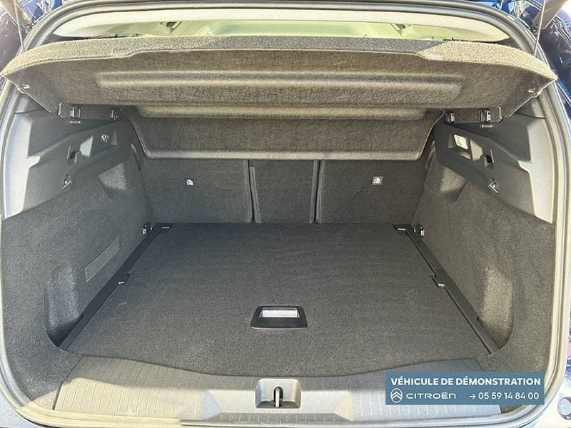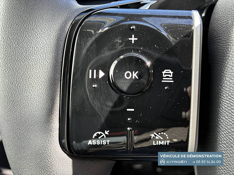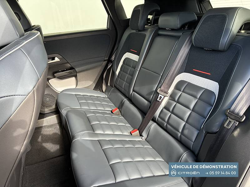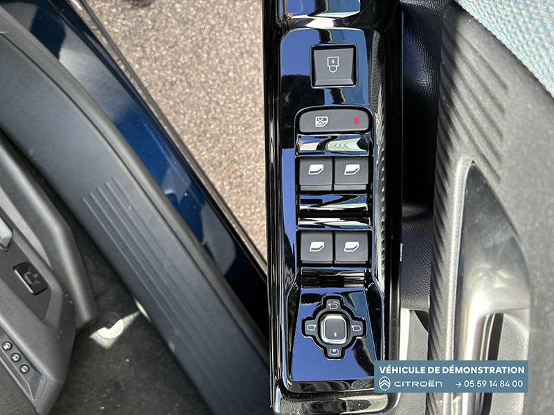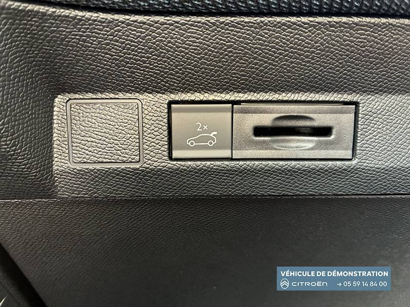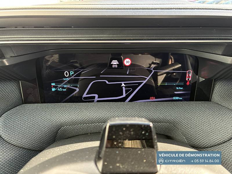 1 prise USB type-C rétroéclairées à l'AV (charge) / 2 prises USB type-C rétroéclairées à l'AR console centrale (charge) / 3 prises 12V Prises situées dans le Rang 1 console centrale, rang 2 AR console centrale et coffre / Accès et démarrage mains libres Proximity 2 Télécommandes 3 boutons (verrouillage, coffre et déverrouillage). / Accoudoir central AV avec rangement fermé et réfrigéré / Aérateurs de climatisation centraux pour les passagers AR / Aide au stationnement AV avec VisioPark 360° Comprend 4 caméras haute définition ainsi que 8 capteurs répartis autour du véhicule, offrant une vision à 360° de l'environnement. / Allumage adaptative des feux de croisement / Banquette AR avec dossier rabattable 40/20/40 / Banquette AR avec dossiers inclinables et accoudoir central / Bluetooth (connexion simultanée 2 télephones) / Boîte automatique 6 rapports / Boitier télématique: Appel d'urgence et Citroën Assistance avec télémaintenance. Comprend les services Connect ONE pendant une période de 10 ans / Calandre Noir Brillant / Clean Cabin avec détecteur de qualité de l'air Le système détecte les particules fines et active automatiquement le recyclage de l'air ambiant. / Color Clip Gold Satin / Combiné numérique 10" personnalisable / Eclairage d'ambiance étendu, 8 couleurs Éclairage d'ambiance étendu le long de la planche de bord, des tweeters, des panneaux de porte AV et sous l'écran cascade / Eclairage intérieur LED Comprend l'éclairage à LED des plafonniers AV et AR, ainsi que l'éclairage des miroirs de courtoisie. / Ecran Cascade avec Navigation 3D Connectée Comprend le système de navigation TomTom, la reconnaissance vocale et les services Connect PLUS additionnels. Jusqu'à 8 profils. / Ecran central vertical 13" tactile / Equipements de sécurité ABS avec répartiteur électronique de freinage (REF) , Freinage d'urgence automatique post-collision (AFU), ESP avec aide au démarrage en côte, Airbags (frontaux, latéraux AV et rideaux), Détection de sous-gonflage, Fixations ISOFIX et Top Tether sur les sièges latéraux AR / Essuie-vitres AV automatique Magic Wash / Feux AR à LED Citroën Light Wings / Feux diurnes avec clignotants à LED / Frein de stationnement électrique / Garnissage Tissu Blue / Toile enduite Premium Blue Ambiance Hype Blue + Sièges Advanced Comfort / Hayons motorisé mains libres / Lève-vitres électriques AV/AR séquentiels anti-pincement / Pack Design - Décors de pare-chocs AV et AR Noir Brillant - Lame AV peinture satinée / Pack Drive Assist 2.0 - Aide au positionnement dans la voie - Alerte de trafic en marche AR (jusqu'à 40 mètres) - Assistance semi-automatique au changement de voie - Caméra d'alerte attention conducteur - Préconisation anticipée des limitations de vitesse - Système de surveillance d'angle mort longue distance (jusqu'à 75 mètres) - Rétroviseurs indexés à la marche AR avec fonction mémorisation / Pack Safety - Affichage de la limitation de vitesse - Alerte active de Franchissement Involontaire de Ligne - Alerte attention conducteur - Coffee Break Alert - Reconnaissance étendue des panneaux de signalisation et recommandation de vitesse / Pare-brise feuilleté / Pédalier et repose pieds aluminium / Plancher de coffre modulable à 2 positions / Poignées de maintien couleur chrome / Poignées de portes extérieures couleur caisse / Prédisposition attelage / Projecteurs Citroën Matrix LED / Recharge sans fil pour smartphone / Rétroviseur intérieur électrochrome / Services Connect PLUS Comprend les services Connect Plus pour une période de 1 an / Siège conducteur à réglage électrique (8 directions) avec mémoire de position / Suspension Citroën Advanced Comfort / TCS (Contrôle de la traction) / Vitres AR, vitres de custode et lunette AR surteintées / Volant chauffant / Volant gainé multifonctions avec décor Noir Brillant