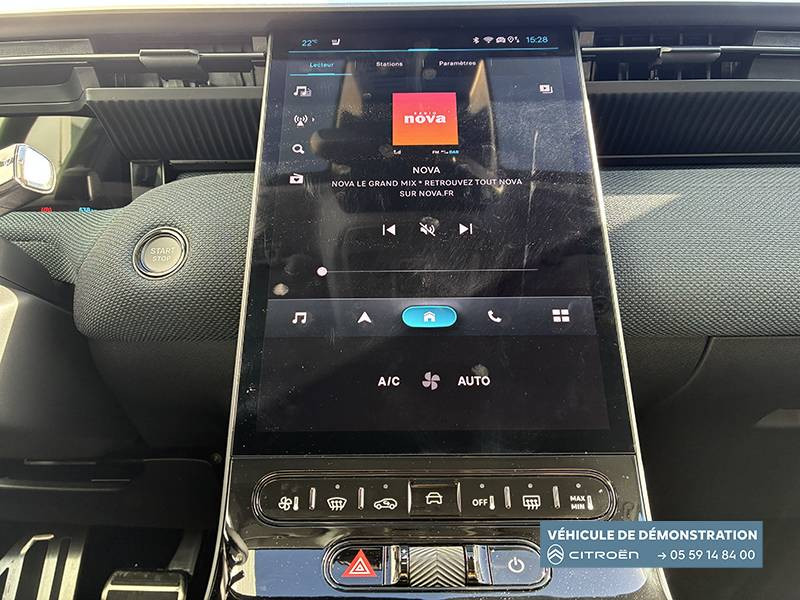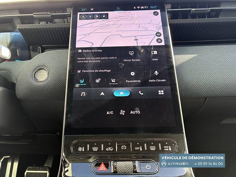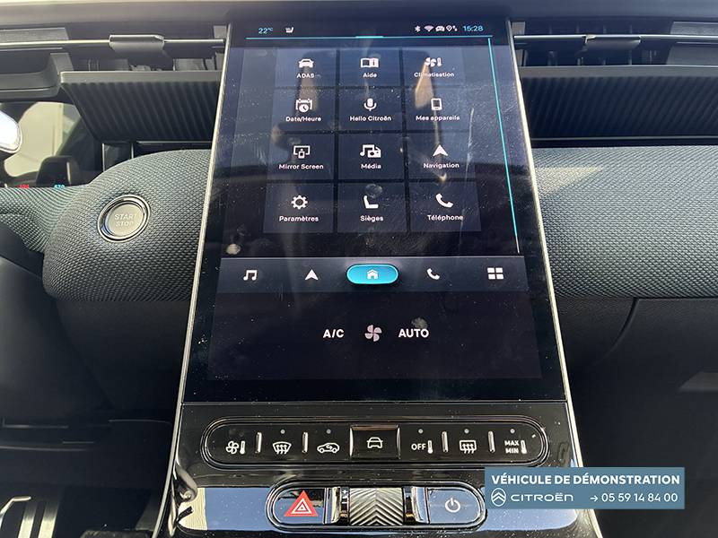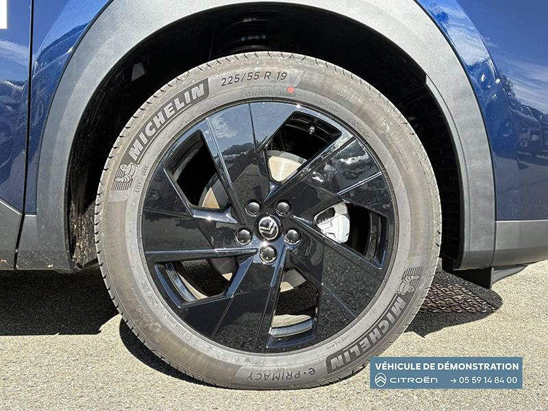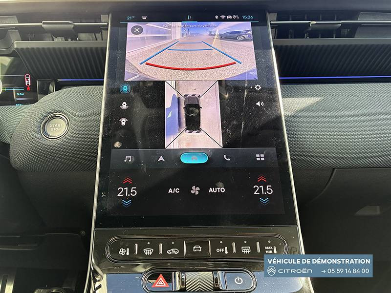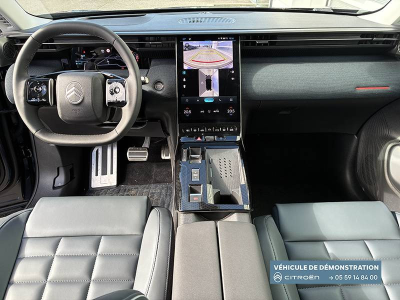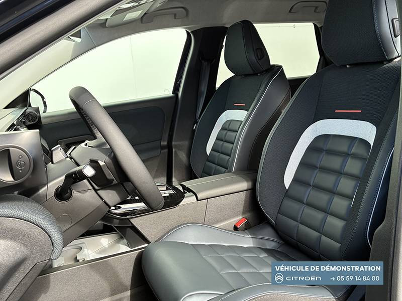 1 prise USB type-C rétroéclairées à l'AV (charge) / 2 prises USB type-C rétroéclairées à l'AR console centrale (charge) / 3 prises 12V Prises situées dans le Rang 1 console centrale, rang 2 AR console centrale et coffre / Accès et démarrage mains libres Proximity 2 Télécommandes 3 boutons (verrouillage, coffre et déverrouillage). / Accoudoir central AV avec rangement fermé et réfrigéré / Aérateurs de climatisation centraux pour les passagers AR / Aide au stationnement AV avec VisioPark 360° Comprend 4 caméras haute définition ainsi que 8 capteurs répartis autour du véhicule, offrant une vision à 360° de l'environnement. / Allumage adaptative des feux de croisement / Banquette AR avec dossier rabattable 40/20/40 / Banquette AR avec dossiers inclinables et accoudoir central / Bluetooth (connexion simultanée 2 télephones) / Boîte automatique 6 rapports / Boitier télématique: Appel d'urgence et Citroën Assistance avec télémaintenance. Comprend les services Connect ONE pendant une période de 10 ans / Calandre Noir Brillant / Clean Cabin avec détecteur de qualité de l'air Le système détecte les particules fines et active automatiquement le recyclage de l'air ambiant. / Color Clip Gold Satin / Combiné numérique 10" personnalisable / Eclairage d'ambiance étendu, 8 couleurs Éclairage d'ambiance étendu le long de la planche de bord, des tweeters, des panneaux de porte AV et sous l'écran cascade / Eclairage intérieur LED Comprend l'éclairage à LED des plafonniers AV et AR, ainsi que l'éclairage des miroirs de courtoisie. / Ecran Cascade avec Navigation 3D Connectée Comprend le système de navigation TomTom, la reconnaissance vocale et les services Connect PLUS additionnels. Jusqu'à 8 profils. / Ecran central vertical 13" tactile / Equipements de sécurité ABS avec répartiteur électronique de freinage (REF) , Freinage d'urgence automatique post-collision (AFU), ESP avec aide au démarrage en côte, Airbags (frontaux, latéraux AV et rideaux), Détection de sous-gonflage, Fixations ISOFIX et Top Tether sur les sièges latéraux AR / Essuie-vitres AV automatique Magic Wash / Feux AR à LED Citroën Light Wings / Feux diurnes avec clignotants à LED / Frein de stationnement électrique / Garnissage Tissu Blue / Toile enduite Premium Blue Ambiance Hype Blue + Sièges Advanced Comfort / Hayons motorisé mains libres / Lève-vitres électriques AV/AR séquentiels anti-pincement / Pack Design - Décors de pare-chocs AV et AR Noir Brillant - Lame AV peinture satinée / Pack Drive Assist 2.0 - Aide au positionnement dans la voie - Alerte de trafic en marche AR (jusqu'à 40 mètres) - Assistance semi-automatique au changement de voie - Caméra d'alerte attention conducteur - Préconisation anticipée des limitations de vitesse - Système de surveillance d'angle mort longue distance (jusqu'à 75 mètres) - Rétroviseurs indexés à la marche AR avec fonction mémorisation / Pack Safety - Affichage de la limitation de vitesse - Alerte active de Franchissement Involontaire de Ligne - Alerte attention conducteur - Coffee Break Alert - Reconnaissance étendue des panneaux de signalisation et recommandation de vitesse / Pare-brise feuilleté / Pédalier et repose pieds aluminium / Plancher de coffre modulable à 2 positions / Poignées de maintien couleur chrome / Poignées de portes extérieures couleur caisse / Prédisposition attelage / Projecteurs Citroën Matrix LED / Recharge sans fil pour smartphone / Rétroviseur intérieur électrochrome / Services Connect PLUS Comprend les services Connect Plus pour une période de 1 an / Siège conducteur à réglage électrique (8 directions) avec mémoire de position / Suspension Citroën Advanced Comfort / TCS (Contrôle de la traction) / Vitres AR, vitres de custode et lunette AR surteintées / Volant chauffant / Volant gainé multifonctions avec décor Noir Brillant