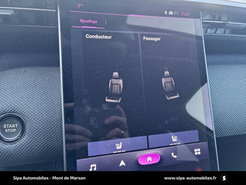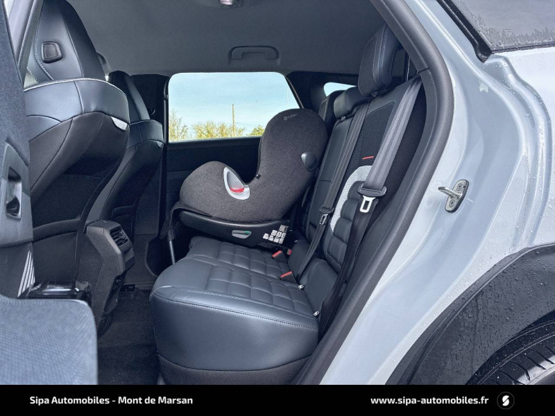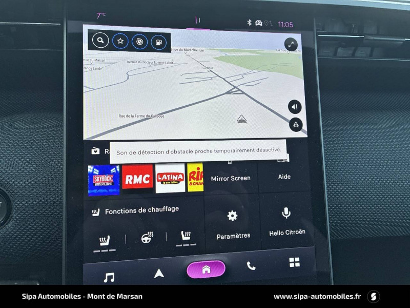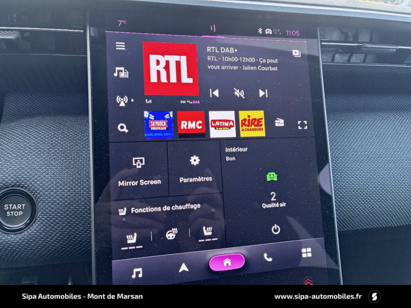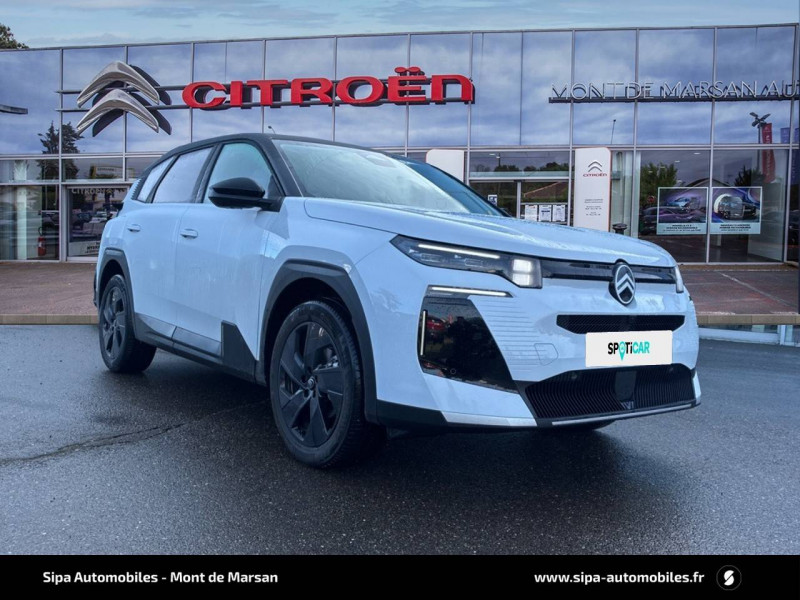 1 prise USB type-C rétroéclairées à l'AV (charge) / 2 prises USB type-C rétroéclairées à l'AR console centrale (charge) / 3 prises 12V Prises situées dans le Rang 1 console centrale, rang 2 AR console centrale et coffre / Accès et démarrage mains libres Proximity 2 Télécommandes 3 boutons (verrouillage, coffre et déverrouillage). / Accoudoir central AV avec rangement fermé et réfrigéré / Aérateurs de climatisation centraux pour les passagers AR / Aide au stationnement AV avec VisioPark 360° Comprend 4 caméras haute définition ainsi que 8 capteurs répartis autour du véhicule, offrant une vision à 360° de l'environnement. / Allumage adaptative des feux de croisement / Banquette AR avec dossier rabattable 40/20/40 / Banquette AR avec dossiers inclinables et accoudoir central / Bluetooth (connexion simultanée 2 télephones) / Boîte automatique 6 rapports / Boitier télématique: Appel d'urgence et Citroën Assistance avec télémaintenance. Comprend les services Connect ONE pendant une période de 10 ans / Calandre Noir Brillant / Clean Cabin avec détecteur de qualité de l'air Le système détecte les particules fines et active automatiquement le recyclage de l'air ambiant. / Color Clip Gold Satin / Combiné numérique 10" personnalisable / Eclairage d'ambiance étendu, 8 couleurs Éclairage d'ambiance étendu le long de la planche de bord, des tweeters, des panneaux de porte AV et sous l'écran cascade / Eclairage intérieur LED Comprend l'éclairage à LED des plafonniers AV et AR, ainsi que l'éclairage des miroirs de courtoisie. / Ecran Cascade avec Navigation 3D Connectée Comprend le système de navigation TomTom, la reconnaissance vocale et les services Connect PLUS additionnels. Jusqu'à 8 profils. / Ecran central vertical 13" tactile / Equipements de sécurité ABS avec répartiteur électronique de freinage (REF) , Freinage d'urgence automatique post-collision (AFU), ESP avec aide au démarrage en côte, Airbags (frontaux, latéraux AV et rideaux), Détection de sous-gonflage, Fixations ISOFIX et Top Tether sur les sièges latéraux AR / Essuie-vitres AV automatique Magic Wash / Feux AR à LED Citroën Light Wings / Feux diurnes avec clignotants à LED / Frein de stationnement électrique / Garnissage Tissu Blue / Toile enduite Premium Blue Ambiance Hype Blue + Sièges Advanced Comfort / Hayons motorisé mains libres / Lève-vitres électriques AV/AR séquentiels anti-pincement / Pack Design - Décors de pare-chocs AV et AR Noir Brillant - Lame AV peinture satinée / Pack Drive Assist 2.0 - Aide au positionnement dans la voie - Alerte de trafic en marche AR (jusqu'à 40 mètres) - Assistance semi-automatique au changement de voie - Caméra d'alerte attention conducteur - Préconisation anticipée des limitations de vitesse - Système de surveillance d'angle mort longue distance (jusqu'à 75 mètres) - Rétroviseurs indexés à la marche AR avec fonction mémorisation / Pack Safety - Affichage de la limitation de vitesse - Alerte active de Franchissement Involontaire de Ligne - Alerte attention conducteur - Coffee Break Alert - Reconnaissance étendue des panneaux de signalisation et recommandation de vitesse / Pare-brise feuilleté / Pédalier et repose pieds aluminium / Plancher de coffre modulable à 2 positions / Poignées de maintien couleur chrome / Poignées de portes extérieures couleur caisse / Prédisposition attelage / Projecteurs Citroën Matrix LED / Recharge sans fil pour smartphone / Rétroviseur intérieur électrochrome / Services Connect PLUS Comprend les services Connect Plus pour une période de 1 an / Siège conducteur à réglage électrique (8 directions) avec mémoire de position / Suspension Citroën Advanced Comfort / TCS (Contrôle de la traction) / Vitres AR, vitres de custode et lunette AR surteintées / Volant chauffant / Volant gainé multifonctions avec décor Noir Brillant