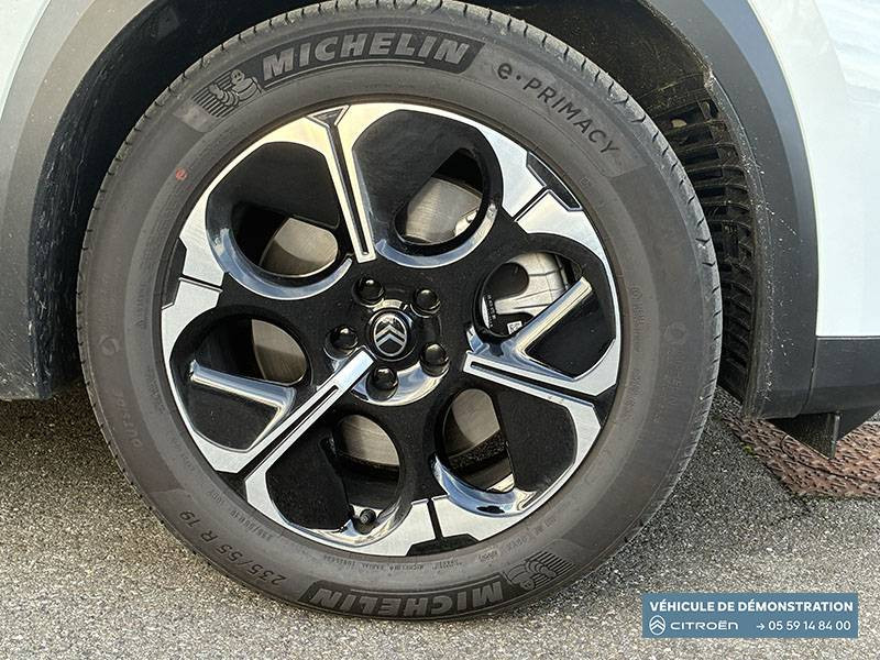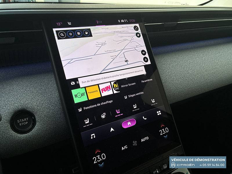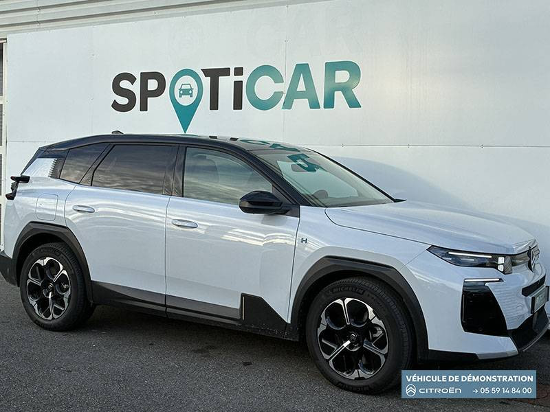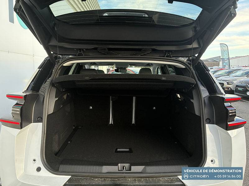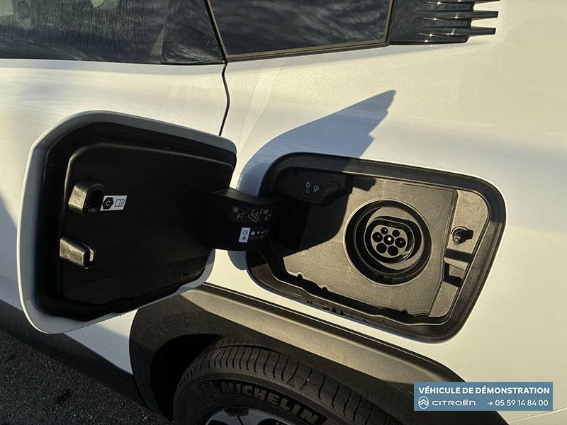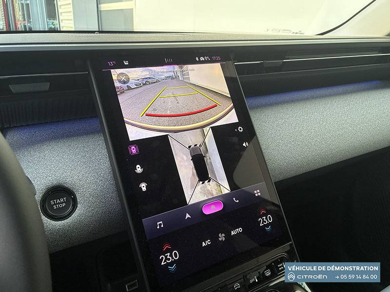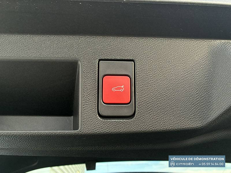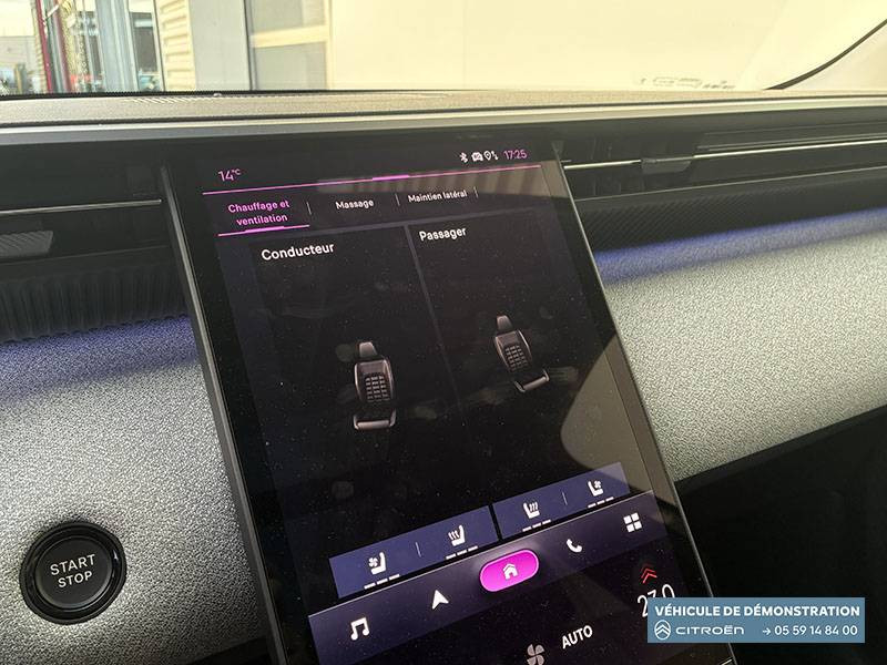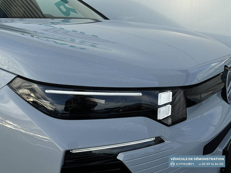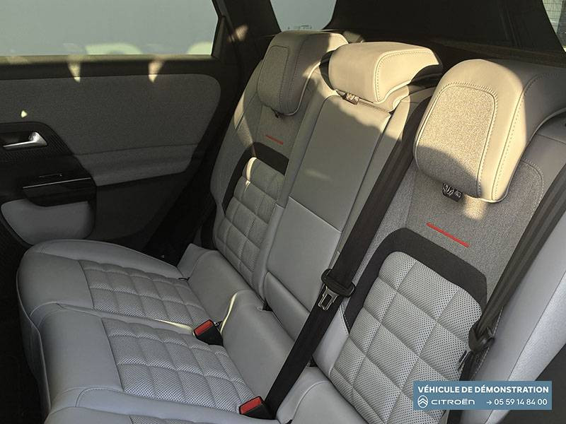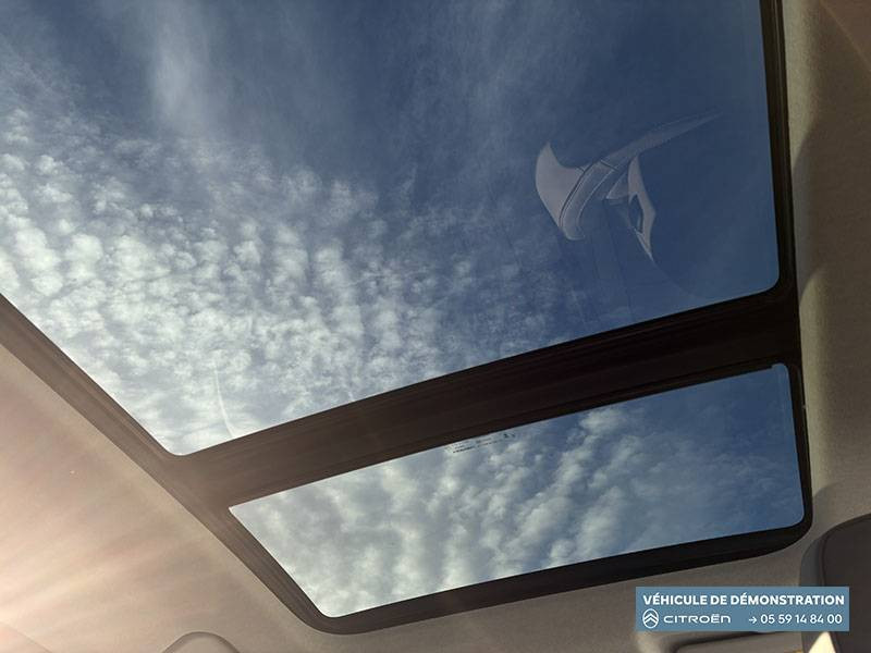 1 prise USB type-C rétroéclairées à l'AV (charge) / 2 prises USB type-C rétroéclairées à l'AR console centrale (charge) / 3 prises 12V Prises situées dans le Rang 1 console centrale, rang 2 AR console centrale et coffre / ABS + AFU + ESP + REF / Accès et démarrage mains libres Proximity 2 Télécommandes 3 boutons (verrouillage, coffre et déverrouillage). / Accoudoir central AV avec rangement fermé et réfrigéré / Aérateurs de climatisation centraux pour les passagers AR / Aide au stationnement AV avec VisioPark 360° Comprend 4 caméras haute définition ainsi que 8 capteurs répartis autour du véhicule, offrant une vision à 360° de l'environnement. / Allumage adaptative des feux de croisement / Banquette AR avec dossier rabattable 40/20/40 / Banquette AR avec dossiers inclinables et accoudoir central / Bluetooth (connexion simultanée 2 télephones) / Boîte automatique 7 rapports / Boitier télématique: Appel d'urgence et Citroën Assistance avec télémaintenance. Comprend les services Connect ONE pendant une période de 10 ans / Câble de recharge Mode 2, prise de charge T2/EF longueur 6 mètres (220V) / Calandre Noir Brillant / Chargeur embarqué 3,7 kW / Clean Cabin avec détecteur de qualité de l'air Le système détecte les particules fines et active automatiquement le recyclage de l'air ambiant. / Color Clip Gold Satin / Combiné numérique 10" personnalisable / Détection de sous-gonflage / Eclairage d'ambiance étendu, 8 couleurs Éclairage d'ambiance étendu le long de la planche de bord, des tweeters, des panneaux de porte AV et sous l'écran cascade / Eclairage intérieur LED Comprend l'éclairage à LED des plafonniers AV et AR, ainsi que l'éclairage des miroirs de courtoisie. / Ecran Cascade avec Navigation 3D Connectée Comprend le système de navigation TomTom, la reconnaissance vocale et les services Connect PLUS additionnels. Jusqu'à 8 profils. / Ecran central vertical 13" tactile / Essuie-vitres AV automatique Magic Wash / Feux AR à LED Citroën Light Wings / Feux diurnes avec clignotants à LED / Frein de stationnement électrique / Garnissage Tissu Blue / Toile enduite Premium Blue Ambiance Hype Blue + Sièges Advanced Comfort / Hayons motorisé mains libres / Lève-vitres électriques AV/AR séquentiels anti-pincement / Pack Design - Décors de pare-chocs AV et AR Noir Brillant - Lame AV peinture satinée / Pack Drive Assist 2.0 - Aide au positionnement dans la voie - Alerte de trafic en marche AR (jusqu'à 40 mètres) - Assistance semi-automatique au changement de voie - Caméra d'alerte attention conducteur - Préconisation anticipée des limitations de vitesse - Système de surveillance d'angle mort longue distance (jusqu'à 75 mètres) / Pack Safety - Affichage de la limitation de vitesse - Alerte active de Franchissement Involontaire de Ligne - Alerte attention conducteur - Coffee Break Alert - Reconnaissance étendue des panneaux de signalisation et recommandation de vitesse / Pare-brise feuilleté / Pédalier et repose pieds aluminium / Plancher de coffre modulable à 2 positions / Poignées de maintien couleur chrome / Poignées de portes extérieures couleur caisse / Prédisposition attelage / Projecteurs Citroën Matrix LED / Recharge sans fil pour smartphone / Rétroviseur intérieur électrochrome / Rétroviseurs extérieurs indexés à la marche AR et mémorisation / Services Connect PLUS Comprend les services Connect Plus pour une période de 1 an / Siège conducteur à réglage électrique (8 directions) avec mémoire de position / Suspension Citroën Advanced Comfort / TCS (Contrôle de la traction) / Témoin de non-bouclage des ceintures de sécurité conducteur et passager / Vitres AR, vitres de custode et lunette AR surteintées / Volant chauffant / Volant gainé multifonctions avec décor Noir Brillant