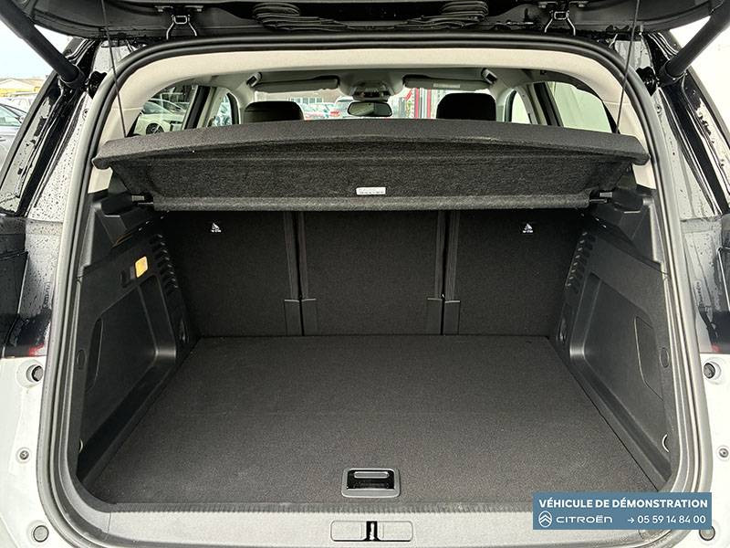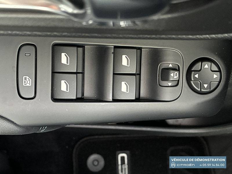 3 sièges AR indépendants, coulissants, inclinables et escamotables / ABS + AFU + ESP + REF / Accès et démarrage mains libres / Boîte automatique 8 rapports / Boîtier télématique : Appel d'urgence et Citroën Assistance les services Connect ONE pendant une période de 10 ans / Câble de recharge Mode 2, prise de charge T2/EF, longueur 6 mètres / Calandre supérieure Noir Brillant / Caméra de recul avec Top Rear Vision / Chargeur embarqué 3,7 kW / Combiné numérique 12,3" personnalisable / Détection de sous-gonflage / Elargisseurs d'aile et bas de caisse Noir Mat / Enjoliveurs de contour de vitres latérales chromés / Essuie-vitres AV automatique Magic Wash / Feux diurnes à LED avec clignotants à LED / Frein de stationnement électrique automatique / Garnissage Tissu Bruneo chine/Toile enduite Noire/Ambiance Metropolitan Black avec Sièges Advanced Comfort / Jantes alliage 18" PULSAR Diamantées bi-ton / Navigation 3D sur écran central 10" tactile Comprend le système de navigation TomTom, la reconnaissance vocale avec langage naturel, l'interface personnalisable, et les services Connect PLUS additionnels / Pack Color Noir Brillant Inserts colorés Noir Brillant sur Airbump et bouclier AV / Pack Drive Assist Aide maintien dans la voie, Alerte Attention Conducteur, Commutation automatique des feux de route, Highway Driver Assist (système de conduite autonome de niveau 2), Régulateur de vitesse adaptatif avec fonction Stop & Go / Pack Safety - Active Safety Brake - Alerte active de Franchissement Involontaire de Ligne - Coffee Break Alert - Reconnaissance étendue des panneaux et recommandation de vitesse - Régulateur-limiteur de vitesse / Poignées de portes extérieures Noir Brillant / Prise 12V sur la console centrale / Projecteurs antibrouillard avec éclairage statique d'intersection / Rétroviseur intérieur électrochrome / Sabots de protection Aluminium Brillant / Services Connect PLUS pendant 12 mois / Siège conducteur avec réglage lombaire / Suspension Citroën Advanced Comfort / TCS (Contrôle de la traction)