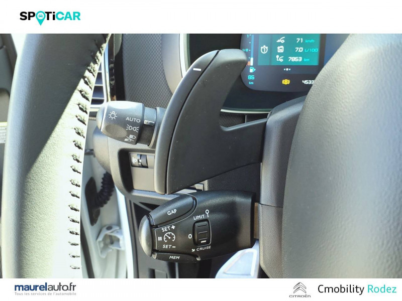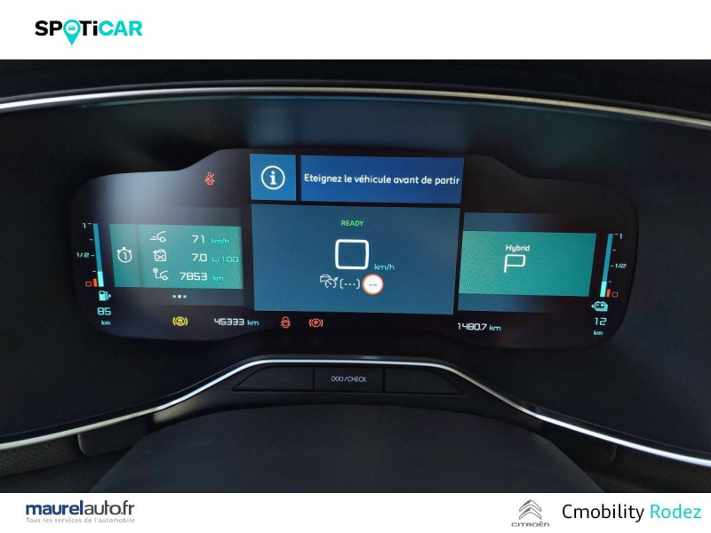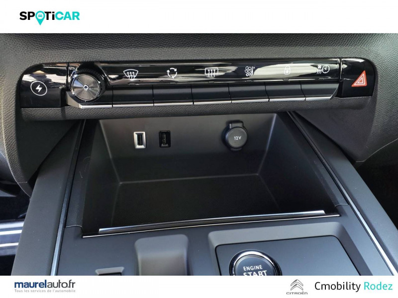 3 sièges AR indépendants, coulissants, inclinables et escamotables / ABS + AFU + ESP + REF / Accès et démarrage mains libres / Accoudoir central mousséà ouverture papillon et réfrigéré / Aérateurs en rang 2 / Aide au stationnement AV + Caméra de recul avec Top Rear Vision Comprend les Projecteurs antibrouillard avec éclairage statique d'intersection. / Barres de toit Noir Brillant avec insert Noir mat / Câble de recharge Mode 2, prise de charge T2/EF, longueur 6 mètres / Calandre Noir Brillant avec chevrons noir brillant et entourage Chrome / Chargeur embarqué 3,7 kW / Clignotants impulsionnels / Combiné numérique 12,3" personnalisable / Détection de sous-gonflage / Eclairage d'accueil et d'accompagnement / Elargisseurs d'aile et bas de caisse Noir Mat / Enjoliveurs de contour de vitres latérales chromés / Enjoliveurs de montant central Noir Brillant / Essuie-vitres AV automatique Magic Wash / Feux diurnes à LED avec clignotants à LED / Frein de stationnement électrique automatique / Garnissage Cuir Grainé Noir/Tissu effect cuir Gris/Ambiance Metropolitan Black avec Sièges Advanced Comfort / Highway Driver Assist / Inserts colorés Dark Chrome sur Airbump et bouclier AV / Jantes alliage 19" ART Diamantées bi-ton / Kit de dépannage provisoire des pneumatiques / My Citroën Assist : Citroën Connect Box avec Pack SOS et assistance inclus / My Citroën Drive avec écran tactile 10" Comprend le système de navigation TomTom, la reconnaissance vocale et durant 3 ans les services Connect Nav / My Citroën Play Hybrid avec tablette tactile 10" / Pack Color Dark Chrome / Pack Drive Assist + / Pack Safety + / Pack Safety - Active Safety Brake - Alerte active de Franchissement Involontaire de Ligne - Alerte Attention Conducteur - Alerte Risque Collision - Coffee Break Alert - Reconnaissance des panneaux de vitesse et recommandation - Régulateur-limiteur de vitesse - Témoin de non-bouclage des ceintures de sécurité conducteur et passagers / Pare-chocs AR avec double canule chromée / Pédalier et repose pieds aluminium / Prises 12 V sur la console centrale et dans le coffre / Projecteurs antibrouillard avec éclairage statique d'intersection / Rétroviseur intérieur électrochrome / Sabots de protection Aluminium Brillant / Sécurité enfants mécanique / Seuils de portes AV Inox / Siège conducteur avec réglage lombaire / Siège conducteur électrique (8 voies) / Sièges Advanced Comfort / Surtapis AV et AR / Suspension Citroën Advanced Comfort / Vitres latérales AV feuilletées et acoustiques