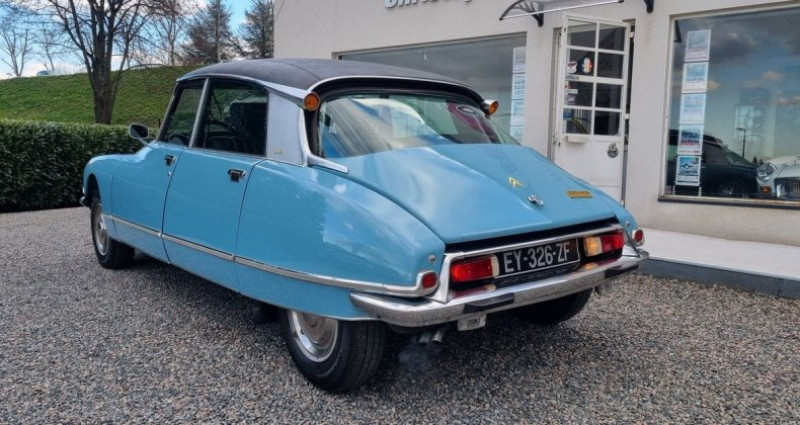 Nous vous proposons cette DS 23IE PALLAS de 1973. Dès 1973, la DS 21 est remplacée dans la production de Citroën par une voiture de 2347 cm3. Ce sera la DS 23. Sa déclinaison en DS 23 IE présente les caractéristiques techniques suivantes. Elle est montée d’un moteur 4 cylindres en ligne et équipée d’une alimentation par injection électronique. Sa puissance s’élève à 130 chevaux à 5250 tr/min. Sa boite à vitesse propose 5 rapports. Ses suspensions avant et arrière marchent à l’hydraulique. Concernant le freinage, l’avant est composé de disques, l’arrière de tambours. D’une longueur de 4,84 m, son poids est de 1340 kg et sa vitesse maximale de 188 km/h. L'exemplaire proposé regroupement les signes distinifs de la finition Pallas, bas de caisse inox, seuils de portes, accoudoir central et mème les appuie-tête ! Sa couleur bleue Lagune AC639 égaye l'ensemble et renforce sa touche vintage. La peinture est de bonne facture. L'intérieur en cuir est impeccable. Cette voiture a été restaurée. Et présente un contrôle technique quasi vierge. Le toit est en vinyle noir et assez rare. L'auto fonctionne bien, et roule toute distance. Voyez l'album photos flickr detaillé sur notre site.