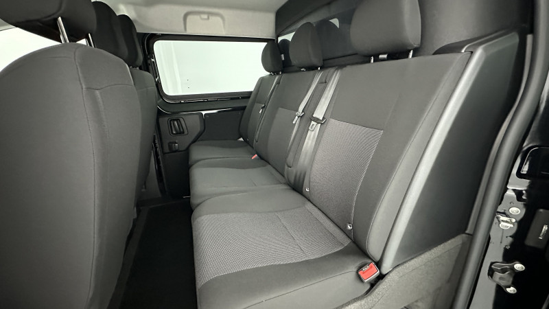Banquette 3 places fixe en rang 2 / Banquette passager 2 places avec rangement sous assise / Portes arrière battantes 50/50 tôlées à ouverture à 180° / Revêtement de sol en TPO cabine / Allumage automatique des feux de croisement et des essuie-vitres / Boitier télématique (appel d'urgence et d'assistance) / Détection de sous-gonflage / Pack sécurité / / Véhicules équivalents: Trafic, Jumpy