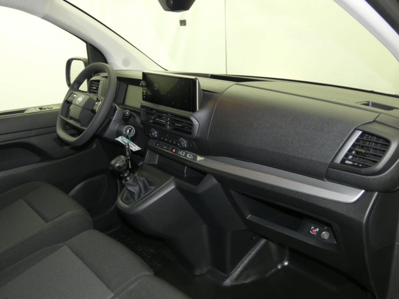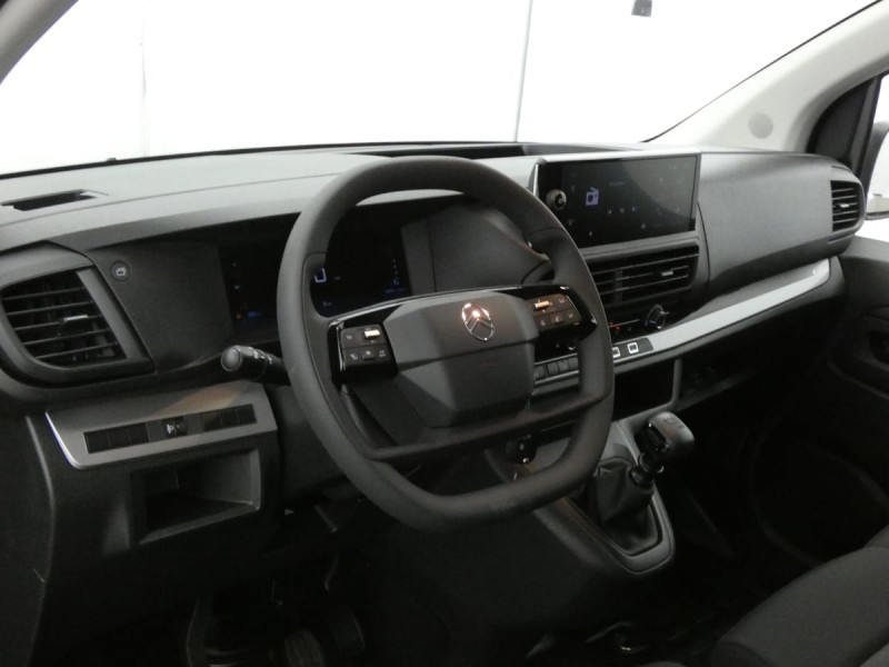Cloison pleine tôlée / Revêtement de sol TPO dans l'habitacle / Climatisation manuelle régulée en température / Jeu de clefs: 2 plips HF 3 boutons avec fonction selectivité / Pack Sécurité : Reconnaissance des panneaux de vitesse et recommandation Freinage automatique d'urgence avec alerte risque de collision Assistance au maintien dans la voie Commutation automatique des feux de route Détection inattention conducteur / Pare-brise feuilleté acoustique / Siège conducteur individuel avec appui-tête réglable en hauteur et avec accoudoir Réglage : longueur, inclinaison, réhausse et lombaire / Détection de sous-gonflage indirecte / Allumage automatique des feux de croisement et des essuie-vitres AV / Anneaux d'arrimage 6 répartis uniformément sur la zone de chargement / Combiné numérique LCD noir et blanc / Panneaux de garniture de type Isorel en rang 2 et 3 / Prise 12V (1200 W max) dans la boîte à gants / Boucliers, Poignées de portes extérieures, Enjoliveur(s) de rail de porte latérale coulissante Baguettes latérales et Coques de rétroviseurs extérieurs teintés masse / Jantes tôle 16" grises avec cabochon noir / Portes AR battantes 50/50 tôlées à ouverture à 180° / Projecteurs halogène (H15) avec feux diurnes intégrés / Radio DAB Bluetooth avec écran tactile 5'' monochrome + 4 HP (2 tweeters + 2 woofers) + 1 prise USB-A / Sellerie Tissu bi-ton noir-gris / Commandes au volant du système audio et du régulateur-limiteur de vitesse / Boitier télématique appel d'urgence / / Véhicules équivalents: Trafic, Jumpy