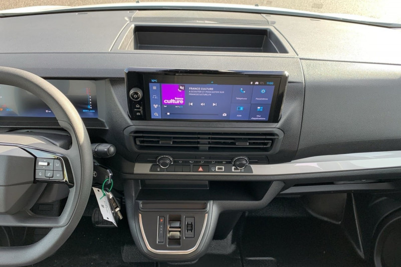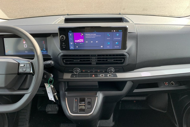 Charge utile majorée / Climatisation manuelle régulée en température / Pack Sécurité : Reconnaissance des panneaux de vitesse et recommandation Freinage automatique d'urgence avec alerte risque de collision Assistance au maintien dans la voie Commutation automatique des feux de route Détection inattention conducteur / Pare-brise feuilleté acoustique / Revêtement de sol TPO en rangs 1 et 2 / Vitres latérales fixes surteintées acoustiques en rang 2 / Teinte de caisse opaque / Détection de sous-gonflage indirecte / Allumage automatique des feux de croisement et des essuie-vitres AV / Vitres latérales fixes en rang 2 / Anneaux d'arrimage 6 répartis uniformément sur la zone de chargement / Panneaux de garniture de type Isorel en rang 2 et 3 / Garnitures pavillon habitacle en rang 2 / Rétroviseur intérieur prismatique / Banquette fixe 3 places en rang 2 avec appui-tête réglables et 2 accoudoirs, position unique conforme aux réglementations fiscales pays, avec coffre de rangement amovible sous assises gauche et centrale (accessible depuis habitacle) et avec zone pour charge longue sous assise droite (accessible par la zone de chargement) / Prise 12V (1200 W max) dans la boîte à gants / Sécurité enfants mécanique / Airbags latéraux AV tête-thorax en rang 1 et airbags rideau pour tête / Boucliers, Poignées de portes extérieures, Enjoliveur(s) de rail de porte latérale coulissante Baguettes latérales et Coques de rétroviseurs extérieurs noirs teintés masse / Jantes tôle 16" grises / Portes AR battantes 50/50 tôlées à ouverture à 180° / Projecteurs halogène (H15) avec feux diurnes intégrés / Sellerie Tissu bi-ton noir-gris / Commandes au volant du système audio et du régulateur-limiteur de vitesse / Boitier télématique appel d'urgence / / Véhicules équivalents: Trafic, Jumpy