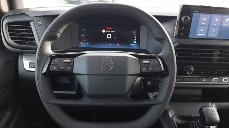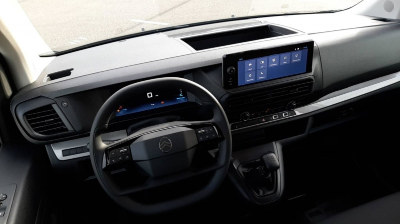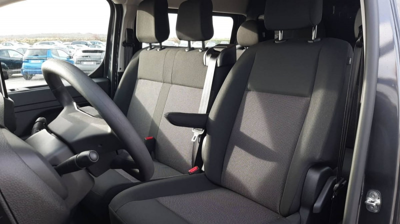 Charge utile majorée / Prédisposition "temoin de non-bouclage R2" (faisceau + afficheur), sans ceintures / Climatisation manuelle régulée en température / Jeu de clefs: 2 plips HF 3 boutons avec fonction selectivité / Pack Sécurité : Reconnaissance des panneaux de vitesse et recommandation Freinage automatique d'urgence avec alerte risque de collision Assistance au maintien dans la voie Commutation automatique des feux de route Détection inattention conducteur / Pare-brise feuilleté acoustique / Revêtement de sol TPO en rangs 1 et 2 / Cloison pleine PVC avec vitre plexiglass / Vitres latérales fixes surteintées acoustiques en rang 2 / Détection de sous-gonflage indirecte / Siège conducteur individuel avec appui-tête réglable en hauteur et avec accoudoir Réglage : longueur, inclinaison, réhausse et rabattable (si 1 PLC) ou lombaire (si 2 PLC) / Allumage automatique des feux de croisement et des essuie-vitres AV / Vitres latérales fixes en rang 2 / Anneaux d'arrimage 6 répartis uniformément sur la zone de chargement / Combiné numérique LCD noir et blanc / Connectivité via BTA (appel d'urgence et d'assistance localisées) SOS: Appel d'urgence automatique ou manuel par push SOS / Panneaux de garniture de type Isorel en rang 2 et 3 / Garnitures pavillon habitacle en rang 2 / Banquette fixe 3 places en rang 2 avec appui-tête réglables et 2 accoudoirs, position unique conforme aux réglementations fiscales pays, avec coffre de rangement amovible sous assises gauche et centrale (accessible depuis habitacle) et avec zone pour charge longue sous assise droite (accessible par la zone de chargement) / Prise 12V (1200 W max) dans la boîte à gants / Sécurité enfants mécanique / Airbags latéraux AV tête-thorax en rang 1 et airbags rideau pour tête / Boucliers, Poignées de portes extérieures, Enjoliveur(s) de rail de porte latérale coulissante Baguettes latérales et Coques de rétroviseurs extérieurs teintés masse / Jantes tôle 16" grises avec cabochon noir / Portes AR battantes 50/50 tôlées à ouverture à 180° / Projecteurs halogène (H15) avec feux diurnes intégrés / Radio DAB Bluetooth avec écran tactile 5'' monochrome + 4 HP (2 tweeters + 2 woofers) + 1 prise USB-A / Sellerie Tissu bi-ton noir-gris / Poignée(s) intérieure(s) de porte(s) latérale(s) coulissante(s) / / Véhicules équivalents: Trafic, Jumpy