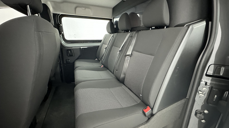VEHICULE EN ARRIVAGE : DELAIS / PHOTOS / ÉQUIPEMENTS / CO2, NON CONTRACTUELS / Banquette 3 places fixe en rang 2 / Banquette passager 2 places avec rangement sous assise / Boucliers, baguettes, coques de rétroviseurs et poignées de portes noirs teinte masse / Jantes tôle grises 16 pouces avec cabochon noir / Portes arrière battantes 50/50 tôlées à ouverture à 180° / Projecteurs halogène avec feux diurnes intégrés / Revêtement de sol en TPO cabine / Boitier télématique (appel d'urgence et d'assistance) / Détection de sous-gonflage / Pack Sécurité / / Véhicules équivalents: Trafic, Jumpy