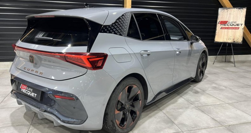 Nb. Vitesse : 1 - Pack Pilot L *** Avec : Top View Camera 360° *** Avec : Side Assist: Détection d'angles morts *** Avec : Travel Assist - ce système combine une multitude de technologies pour maintenir le véhicule dans sa voie et s'adapter au trafic en temps réel *** Avec : Rear Traffic Alert - ce système freine automatiquement en cas de présence d?un véhicule dans la zone de manoeuvre lors d?une sortie de stationnement en marche AR *** Avec : Exit Warning *** Avec : Park Assist avec fonction mémoire - Pack Hiver *** Avec : Sièges AV chauffants - Jantes alliage 19 Typhoon Copper - Feux AR LED avec bandeau Infinite Light - Jantes alliage 19 Typhoon Black - Lane Assist - aide au maintien dans la voie - Light Assist - passage automatique des feux de route aux feux de croisement - Projecteurs full LED avec cérémonie de bienvenue - Pédalier en aluminium - Radars de stationnement AV et AR - Système de navigation connecté sur écran tactile 12 - 2 ports USB-C à l'AV et à l'AR - 7 Airbags (frontaux, latéraux, rideaux) - ACC - régulateur de vitesse adaptatif - Calandre noire en relief - Caméra de recul - Climatronic 2 zones - Connectivity Box avec chargeur à induction - Contrôle vocal - CUPRA Box - CUPRA Connect - Câble de recharge Mode 3- 16A pour borne de recharge (type 2, courant triphasé, 11 kW) - Digital Cockpit 5,3 - Direction progressive - Détecteur de fatigue - Détecteur de pluie et luminosité - eCall - appel d'urgence - Eclairage d'ambiance multicolore - Eclairage de bienvenue avec projection du logo CUPRA au sol - ESC sport - Front Assist avec détection des piétons et des cyclistes - Full Link sans fil - Inserts éxterieur Copper - Jupes latérales et rétroviseurs contrastés - Keyless Access : Accès et démarrage mains-libres - Kit de sécurité CUPRA - Poignées de portes rétroéclairées (AV) - Rétroviseurs chauffants et rabattables électriquement - Suspension sport - Système audio 7 HP - Tapis de sol Premium CUPRA - Traffic Sign Recognition - reconnaissance des panneaux de signalisation - Vitres AR surteintées - Volant Supersports CUPRA chauffant multifonction avec boutons satellites