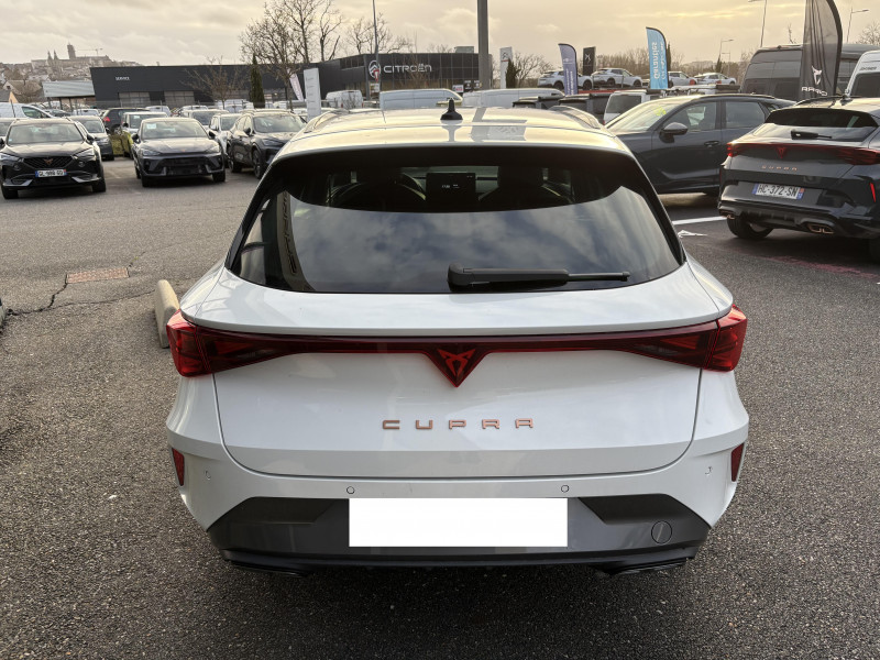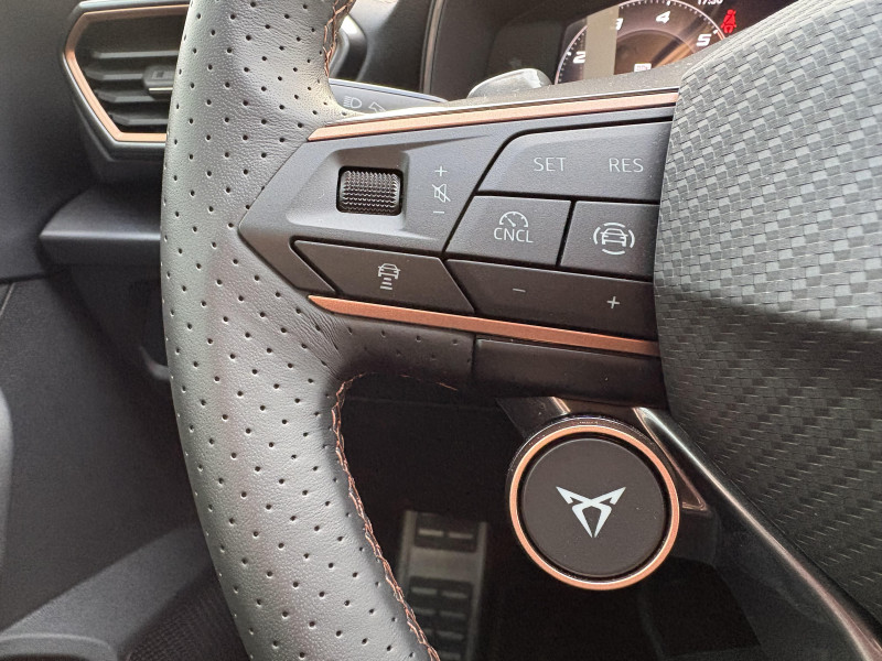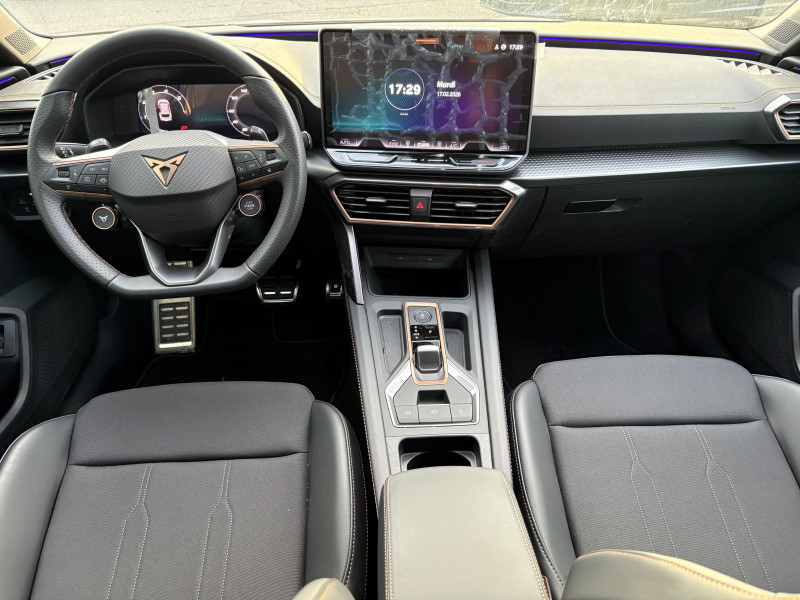 Aide au maintien dans la voie (Lane Assist) / Bandeau AR ''Infinite Light'' intégrant le logo CUPRA lumineux, avec signature lumineuse Tri-LED et cérémonie de bienvenue / Jantes 18" Performance anthracites / Projecteurs full LED avec signature lumineuseTri-LED / Volant Supersports CUPRA en cuir avec boutons satellites, chauffant, avec palettes de changement de rapport / 4 prises USB-C éclairées et Bluetooth / Accès et démarrage mains-libres / Boîte de vitesse automate sequentiel à 7 vitesses / Ciel de pavillon Noir / Connectivity Box - Amplification du signal et chargeur à induction / Contrôle de la traction (TCS) / CUPRA Box / CUPRA Connect / Digital Cockpit 10,25" / Direction dynamique / Direction à assistance électromécanique / Double sortie d'échappement Noire stylisée / Détection de fatigue et somnolence / Eclairage de bienvenue avec projection du logo CUPRA au sol / ESC / Feux de route intelligents (Light Assist) / Fixations ISOFIX avec Top-Tether à l'AR / Front Assist avec détection des piétons et cyclistes / Full Link avec CarPlay et Android Auto sans fil / Hayon électrique mains-libres ''Virtual Pedal'' / Lampes de lecture à l'AV et à l'AR / Pare-soleils avec miroirs de courtoisie éclairés / Prise 230V dans le coffre / Projecteurs anti-brouillard avec Cornering Light et Coming Home / Rails de toit Noir Glossy / Réglage en hauteur et lombaire des sièges AV / Rétroviseur intérieur électrochrome / Seuils de porte CUPRA rétro-éclairés / Smart Ambient Light (éclairage d'ambiance intérieur intelligent) / Système audio à 6 HP avec contrôle vocal / Système d'info-divertissement avec écran tactile HD 12,9" et touches de commandes tactiles rétro- éclairées / Tapis de sol en matière recyclée avec surpiqûres cuivrées CUPRA