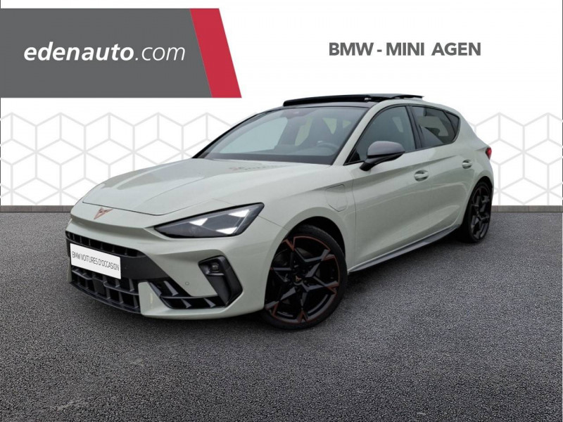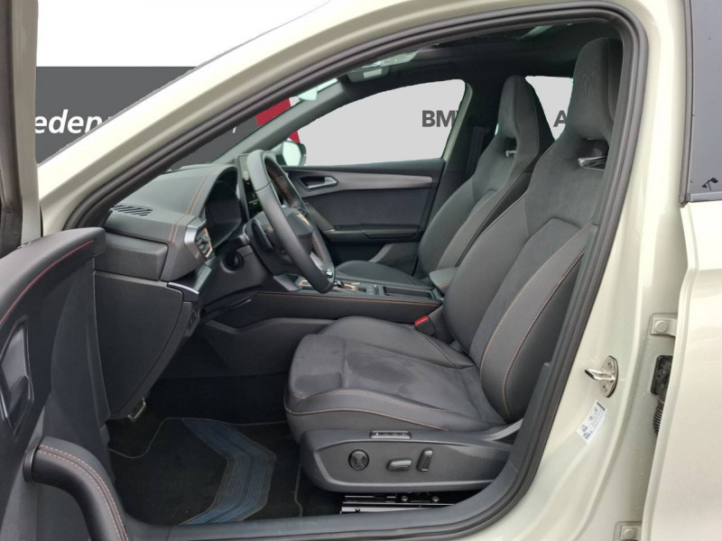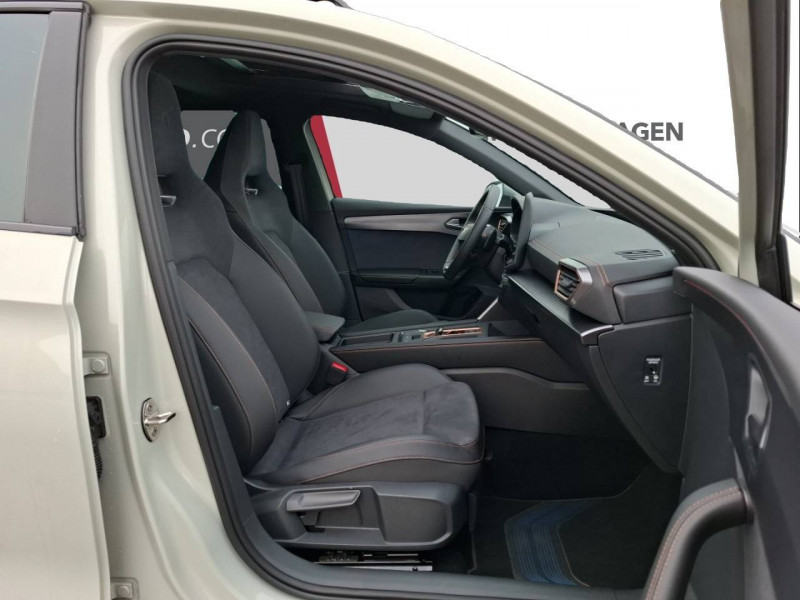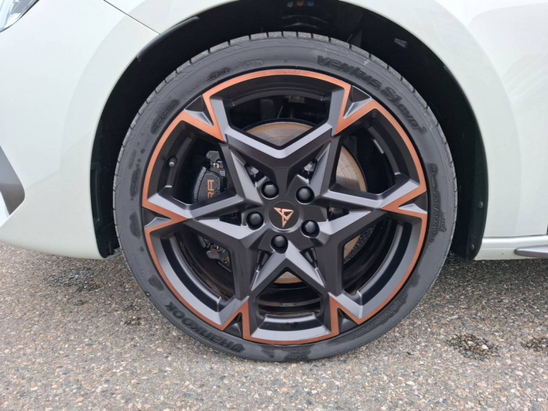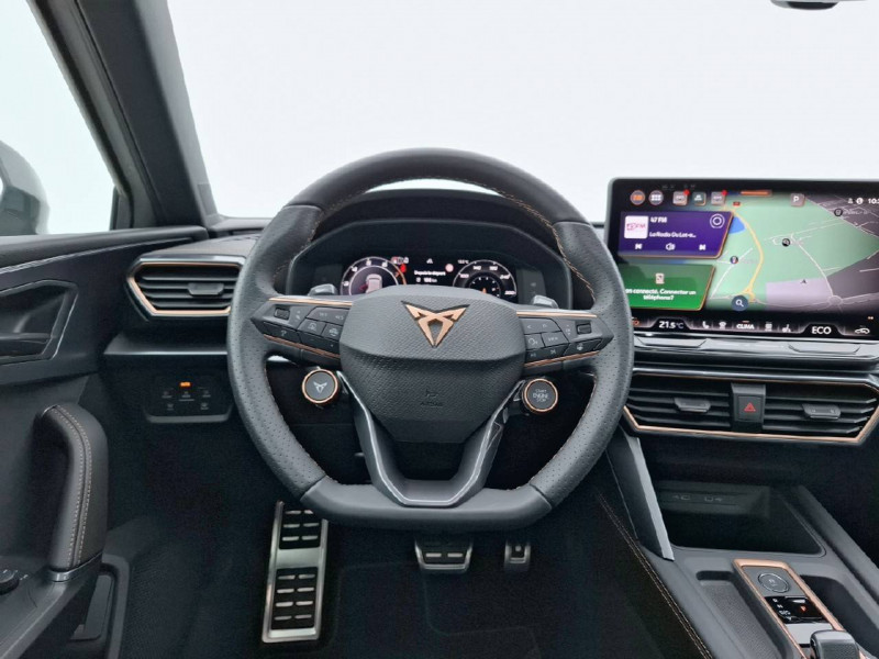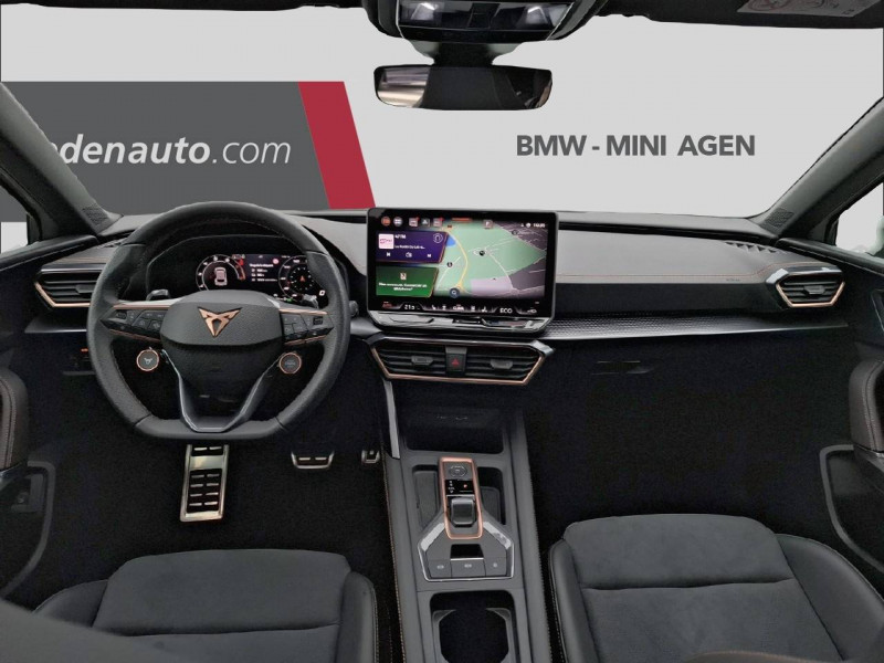 Accès et démarrage mains-libres / Bandeau AR ''Infinite Light'' intégrant le logo CUPRA lumineux, avec signature lumineuse Tri-LED et cérémonie de bienvenue / Câble de recharge Mode 2 pour prise domestique / Ciel de pavillon Noir / Connectivité 4x USB-C éclairée et Bluetooth / Connectivity Box avec chargeur à induction / CUPRA Box - bracelet et coque de clé en fibre de carbone / CUPRA Connect / Design intérieur Dynamic - Sièges baquets suédine Noir Asphalte avec poinçonnage et surpiqûres cuivrées - Logos CUPRA estampés sur les appuie-têtes - Planche de bord noire texturée avec inserts Dark Alu - Contre-portes suédine noire avec poinçonnage cuivré - Conducteur : siège électrique, dont réglage lombaire, à mémoire - Passager : réglage manuel de la hauteur et lombaire - Conducteur + passager chauffants / Détection de fatigue et somnolence / Digital Cockpit 10,25" / Direction dynamique / Double sortie d'échappement cuivrée stylisée / Eclairage de bienvenue avec projection du logo CUPRA au sol / Fixations ISOFIX avec Top-Tether à l'AR / Front Assist avec détection des piétons et cyclistes / Full Link avec CarPlay et Android Auto sans fil / Jantes en alliage 19'' Polar usinées / Lampes de lecture à l'AV et à l'AR / Lane Assist / Light Assist - feux de route intelligents / Pare-soleils avec miroirs de courtoisie éclairés / Projecteurs anti-brouillard avec Cornering Light et Coming Home / Réglage en hauteur et lombaire des sièges AV / Régulation adaptative du châssis DCC / Rétroviseur intérieur électrochrome / Seuils de porte CUPRA rétro-éclairés / Smart Ambient Light (éclairage d'ambiance intérieur intelligent) / Système audio à 6 HP avec contrôle vocal / Système d'info-divertissement avec écran tactile HD 12,9" et touches de commandes tactiles rétro- éclairées / Tapis de sol en matière recyclée avec surpiqûres cuivrées CUPRA / Volant Supersports CUPRA en cuir avec boutons satellites, chauffant, avec palettes de changement de rapport