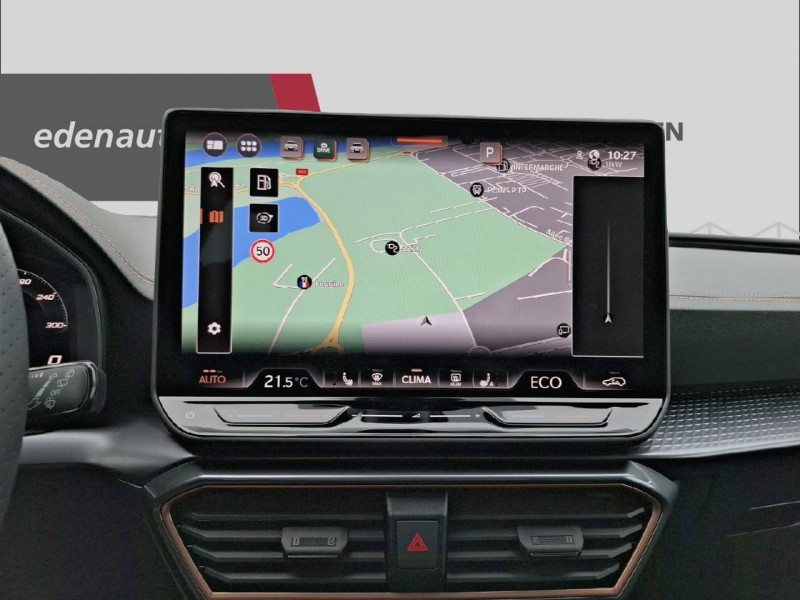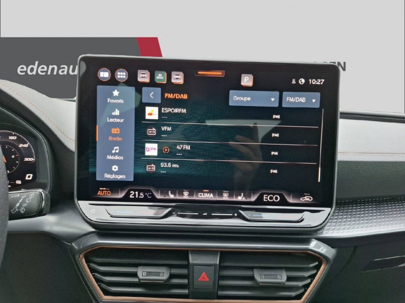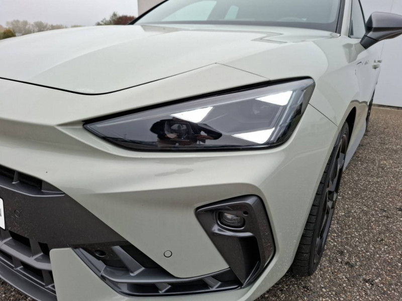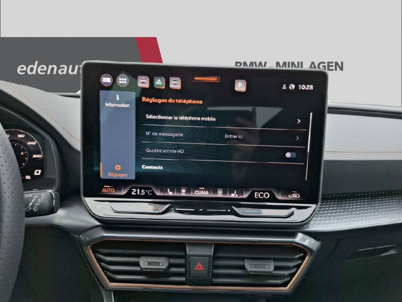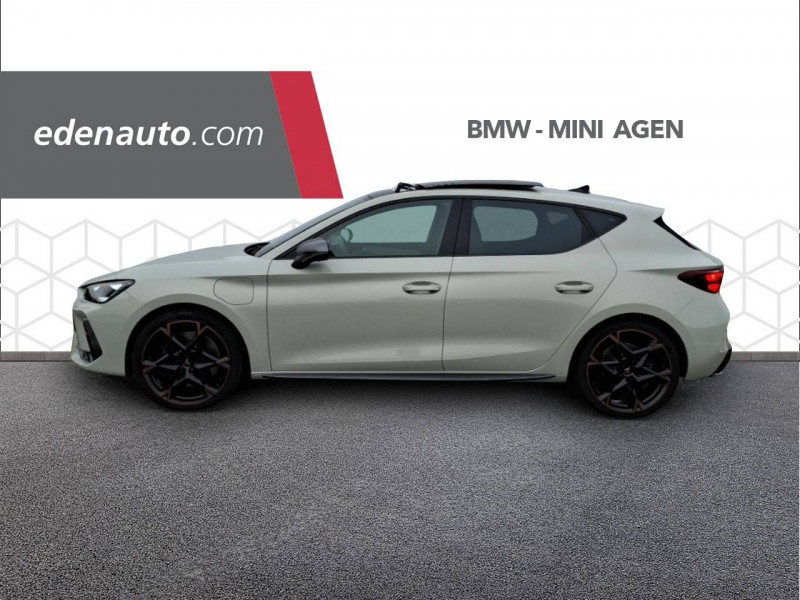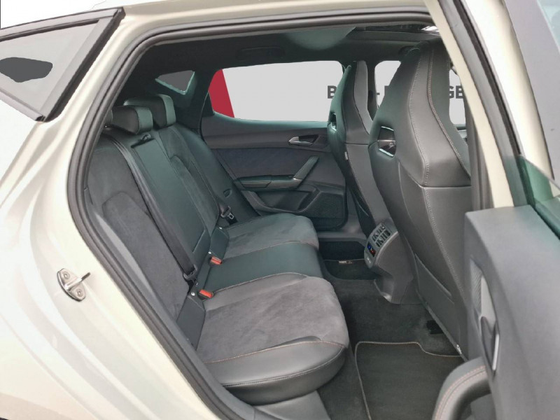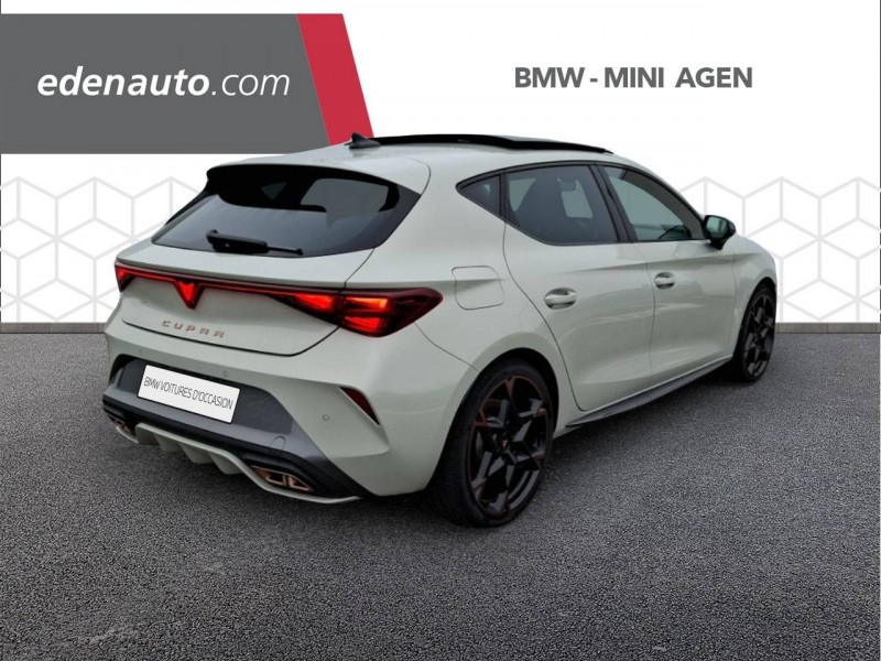 Accès et démarrage mains-libres / Bandeau AR ''Infinite Light'' intégrant le logo CUPRA lumineux, avec signature lumineuse Tri-LED et cérémonie de bienvenue / Câble de recharge Mode 2 pour prise domestique / Ciel de pavillon Noir / Connectivité 4x USB-C éclairée et Bluetooth / Connectivity Box avec chargeur à induction / CUPRA Box - bracelet et coque de clé en fibre de carbone / CUPRA Connect / Design intérieur Dynamic - Sièges baquets suédine Noir Asphalte avec poinçonnage et surpiqûres cuivrées - Logos CUPRA estampés sur les appuie-têtes - Planche de bord noire texturée avec inserts Dark Alu - Contre-portes suédine noire avec poinçonnage cuivré - Conducteur : siège électrique, dont réglage lombaire, à mémoire - Passager : réglage manuel de la hauteur et lombaire - Conducteur + passager chauffants / Détection de fatigue et somnolence / Digital Cockpit 10,25" / Direction dynamique / Double sortie d'échappement cuivrée stylisée / Eclairage de bienvenue avec projection du logo CUPRA au sol / Fixations ISOFIX avec Top-Tether à l'AR / Front Assist avec détection des piétons et cyclistes / Full Link avec CarPlay et Android Auto sans fil / Jantes en alliage 19'' Polar usinées / Lampes de lecture à l'AV et à l'AR / Lane Assist / Light Assist - feux de route intelligents / Pare-soleils avec miroirs de courtoisie éclairés / Projecteurs anti-brouillard avec Cornering Light et Coming Home / Réglage en hauteur et lombaire des sièges AV / Régulation adaptative du châssis DCC / Rétroviseur intérieur électrochrome / Seuils de porte CUPRA rétro-éclairés / Smart Ambient Light (éclairage d'ambiance intérieur intelligent) / Système audio à 6 HP avec contrôle vocal / Système d'info-divertissement avec écran tactile HD 12,9" et touches de commandes tactiles rétro- éclairées / Tapis de sol en matière recyclée avec surpiqûres cuivrées CUPRA / Volant Supersports CUPRA en cuir avec boutons satellites, chauffant, avec palettes de changement de rapport