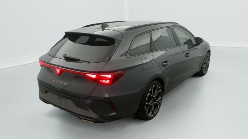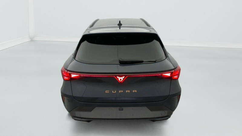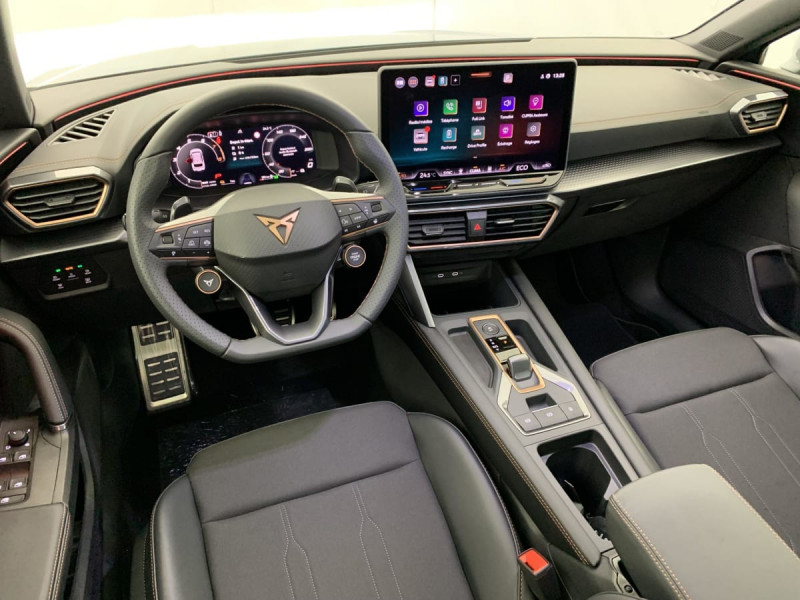 Rétroviseurs extérieurs réglables, rabattable électriquement, dégivrant, avec abaissement passager avant / Hayon électrique mains-libres ''Virtual Pedal'' / Seuils de porte CUPRA rétro-éclairés / Eclairage de bienvenue avec projection du logo CUPRA au sol / Rails de toit Noir Glossy / Projecteurs anti-brouillard avec Cornering Light et Coming Home / Réglage en hauteur et lombaire des sièges AV / Câble de recharge Mode 2 pour prise domestique / Fixations ISOFIX avec Top-Tether à l'AR / Rétroviseur intérieur électrochrome / Airbags latéreaux, rideaux et central / Smart Ambient Light (éclairage d'ambiance intérieur intelligent) / Accès et démarrage mains-libres / Digital Cockpit 10,25'' / Peinture vernie / Feux de route intelligents (Light Assist) / Projecteurs full LED avec signature lumineuse / Prise 230V dans le coffre / Détection de fatigue et somnolence / Bandeau AR ''Infinite Light'' intégrant le logo CUPRA lumineux avec signature lumineuse Tri-LED et cérémonie de bienvenue / Volant Supersports CUPRA en cuir avec boutons satellites, chauffant avec palettes de changement de rapport / Système audio à 6 HP avec contrôle vocal / Système d'info-divertissement avec écran tactile HD 12,9'' et touches de commandes tactiles rétro-éclairées / Full Link avec CarPlay et Android Auto sans fil / Front Assist avec détection des piétons et cyclistes / Design intérieur Pure - Sièges sports bimatière textile et TEP Noir Asphalte - Plancher de bord noire texturée avec inserts Dark Alu - Contre-portes en TEP noir texturés - Conducteur : réglage manuel de la hauteur et lombaire - Passager : réglage manuel de la hauteur et lombaire / Aide au maintien dans la voie (Lane Assist) / 4 prises USB-C éclairée et Bluetooth / Connectivity Box - Amplification du signal et chargeur à induction /