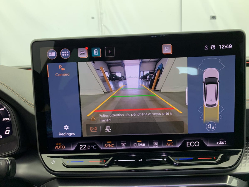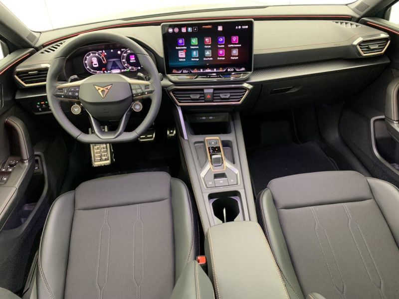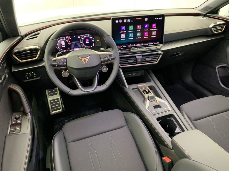 Rétroviseurs extérieurs réglables, rabattable électriquement, dégivrant, avec abaissement passager avant / Hayon électrique mains-libres ''Virtual Pedal'' / Seuils de porte CUPRA rétro-éclairés / Eclairage de bienvenue avec projection du logo CUPRA au sol / Rails de toit Noir Glossy / Projecteurs anti-brouillard avec Cornering Light et Coming Home / Réglage en hauteur et lombaire des sièges AV / Câble de recharge Mode 2 pour prise domestique / Fixations ISOFIX avec Top-Tether à l'AR / Rétroviseur intérieur électrochrome / Airbags latéreaux, rideaux et central / Smart Ambient Light (éclairage d'ambiance intérieur intelligent) / Accès et démarrage mains-libres / Digital Cockpit 10,25'' / Peinture vernie / Feux de route intelligents (Light Assist) / Projecteurs full LED avec signature lumineuse / Prise 230V dans le coffre / Détection de fatigue et somnolence / Bandeau AR ''Infinite Light'' intégrant le logo CUPRA lumineux avec signature lumineuse Tri-LED et cérémonie de bienvenue / Volant Supersports CUPRA en cuir avec boutons satellites, chauffant avec palettes de changement de rapport / Système audio à 6 HP avec contrôle vocal / Système d'info-divertissement avec écran tactile HD 12,9'' et touches de commandes tactiles rétro-éclairées / Full Link avec CarPlay et Android Auto sans fil / Front Assist avec détection des piétons et cyclistes / Design intérieur Pure - Sièges sports bimatière textile et TEP Noir Asphalte - Plancher de bord noire texturée avec inserts Dark Alu - Contre-portes en TEP noir texturés - Conducteur : réglage manuel de la hauteur et lombaire - Passager : réglage manuel de la hauteur et lombaire / Aide au maintien dans la voie (Lane Assist) / 4 prises USB-C éclairée et Bluetooth / Connectivity Box - Amplification du signal et chargeur à induction /