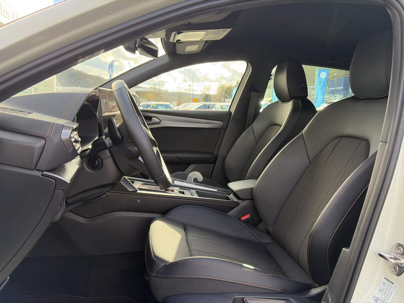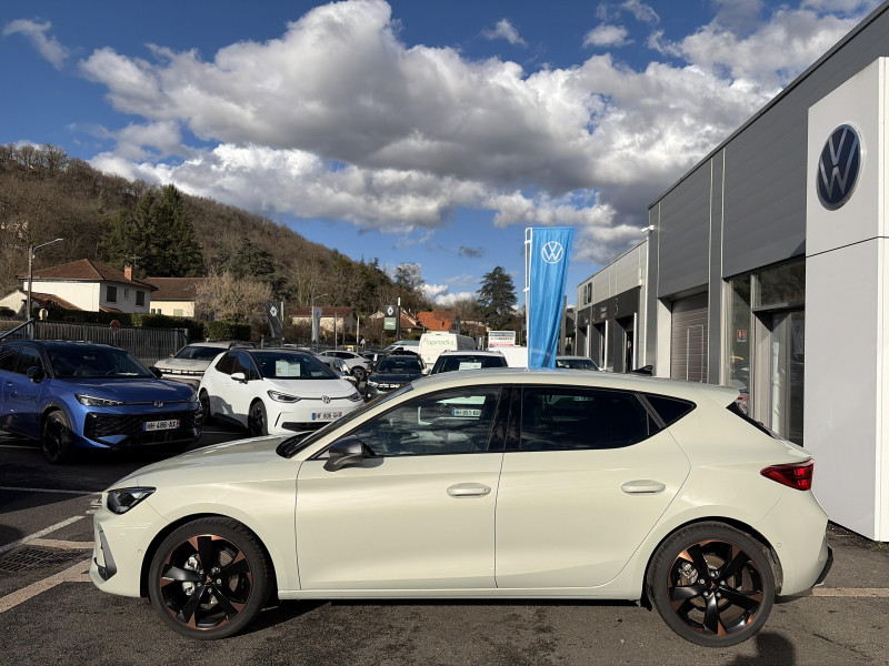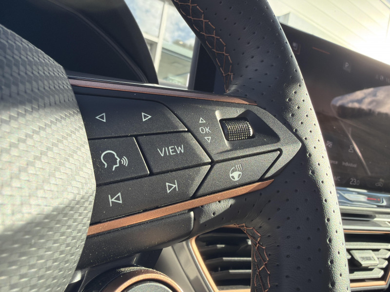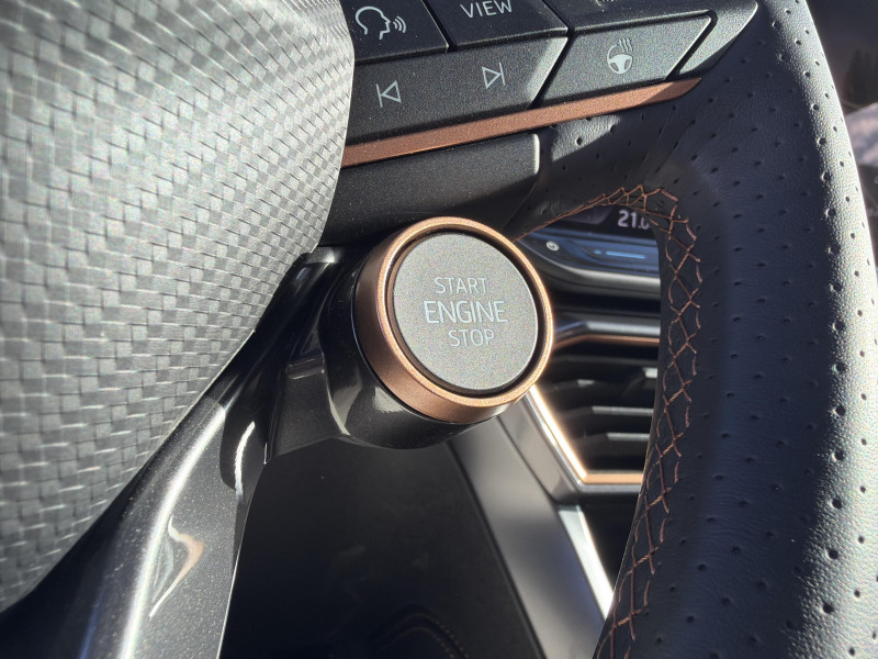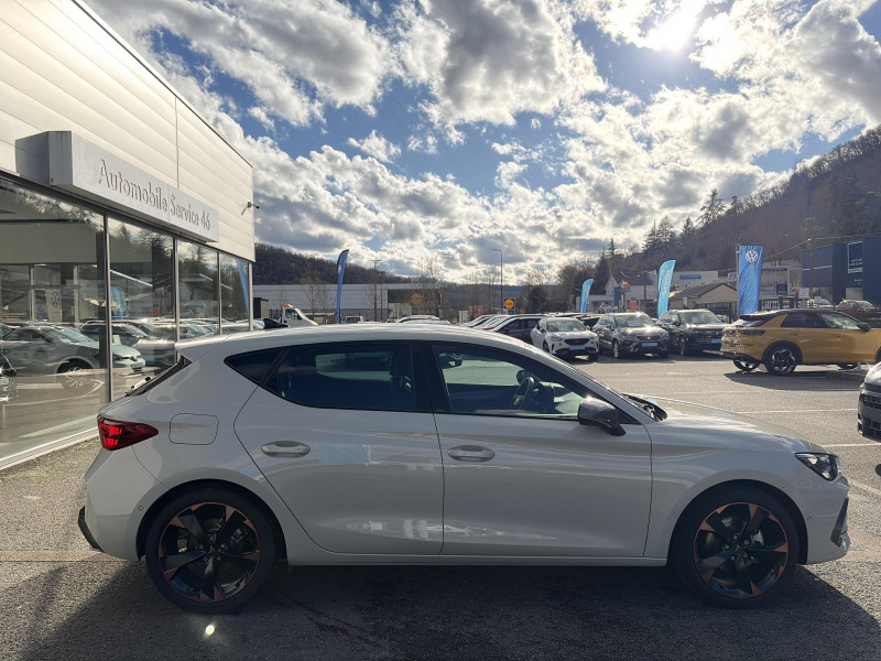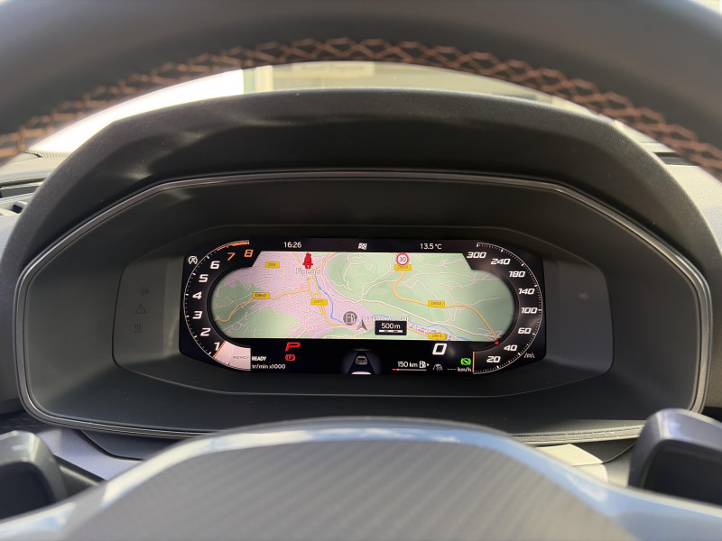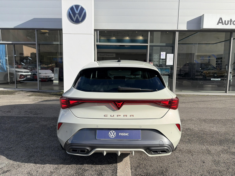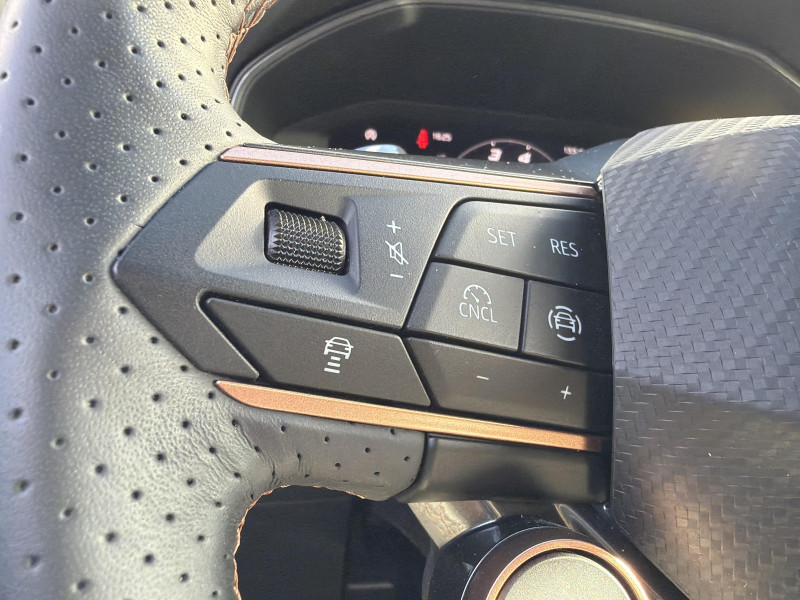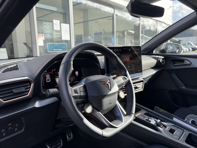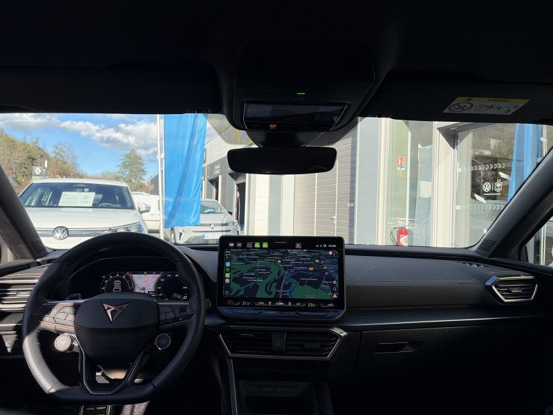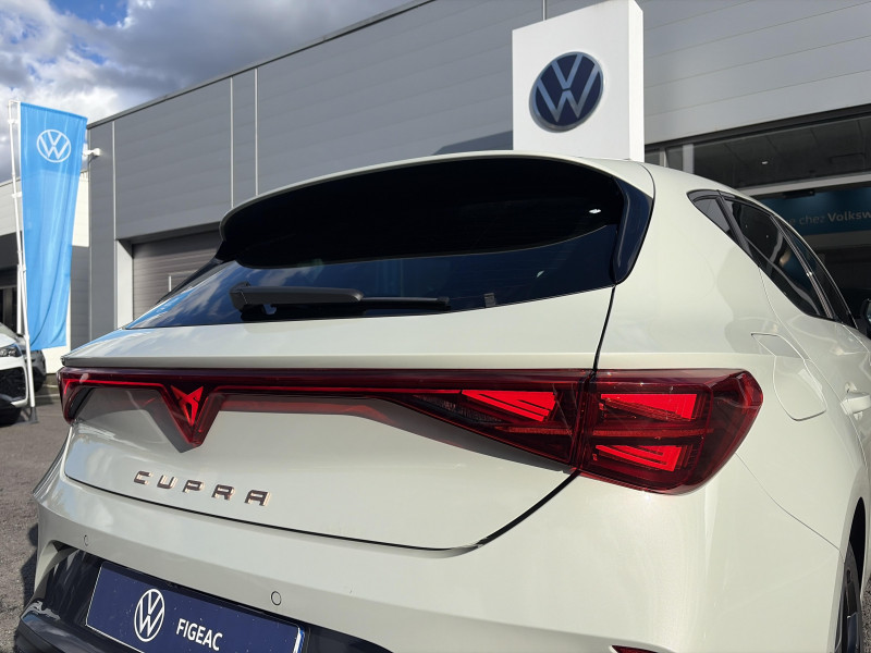 Bandeau AR ''Infinite Light'' intégrant le logo CUPRA lumineux, avec signature lumineuse Tri-LED et cérémonie de bienvenue / Jantes en alliage 18" Performance usinées / Projecteurs full LED avec signature lumineuseTri-LED / Volant Supersports CUPRA en cuir avec boutons satellites, chauffant, avec palettes de changement de rapport / Accès et démarrage mains-libres / Ciel de pavillon Noir / Connectivity Box avec chargeur à induction / Connectivité 4x USB-C éclairée et Bluetooth / CUPRA Box - bracelet et coque de clé en fibre de carbone / CUPRA Connect / Digital Cockpit 10,25" / Direction dynamique / Double sortie d'échappement Noire stylisée / Détection de fatigue et somnolence / Eclairage de bienvenue avec projection du logo CUPRA au sol / Fixations ISOFIX avec Top-Tether à l'AR / Front Assist avec détection des piétons et cyclistes / Full Link avec CarPlay et Android Auto sans fil / Lampes de lecture à l'AV et à l'AR / Lane Assist / Light Assist - feux de route intelligents / Pare-soleils avec miroirs de courtoisie éclairés / Projecteurs anti-brouillard avec Cornering Light et Coming Home / Réglage en hauteur et lombaire des sièges AV / Rétroviseur intérieur électrochrome / Seuils de porte CUPRA rétro-éclairés / Smart Ambient Light (éclairage d'ambiance intérieur intelligent) / Système audio à 6 HP avec contrôle vocal / Système d'info-divertissement avec écran tactile HD 12,9" et touches de commandes tactiles rétro- éclairées / Tapis de sol en matière recyclée avec surpiqûres cuivrées CUPRA
